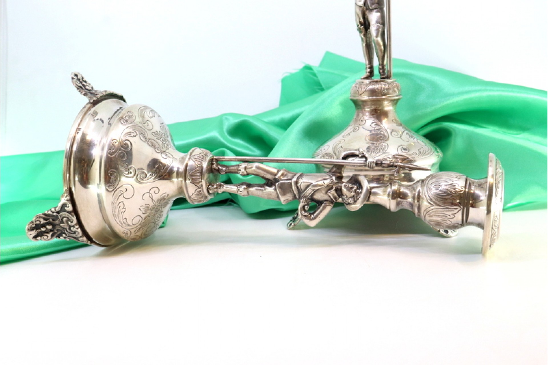 • Descrição: Conjunto de castiçais em prata com alabardeiros sobre pedestal, elementos vegetalistas gravados e assentes em quatro pés relevados.