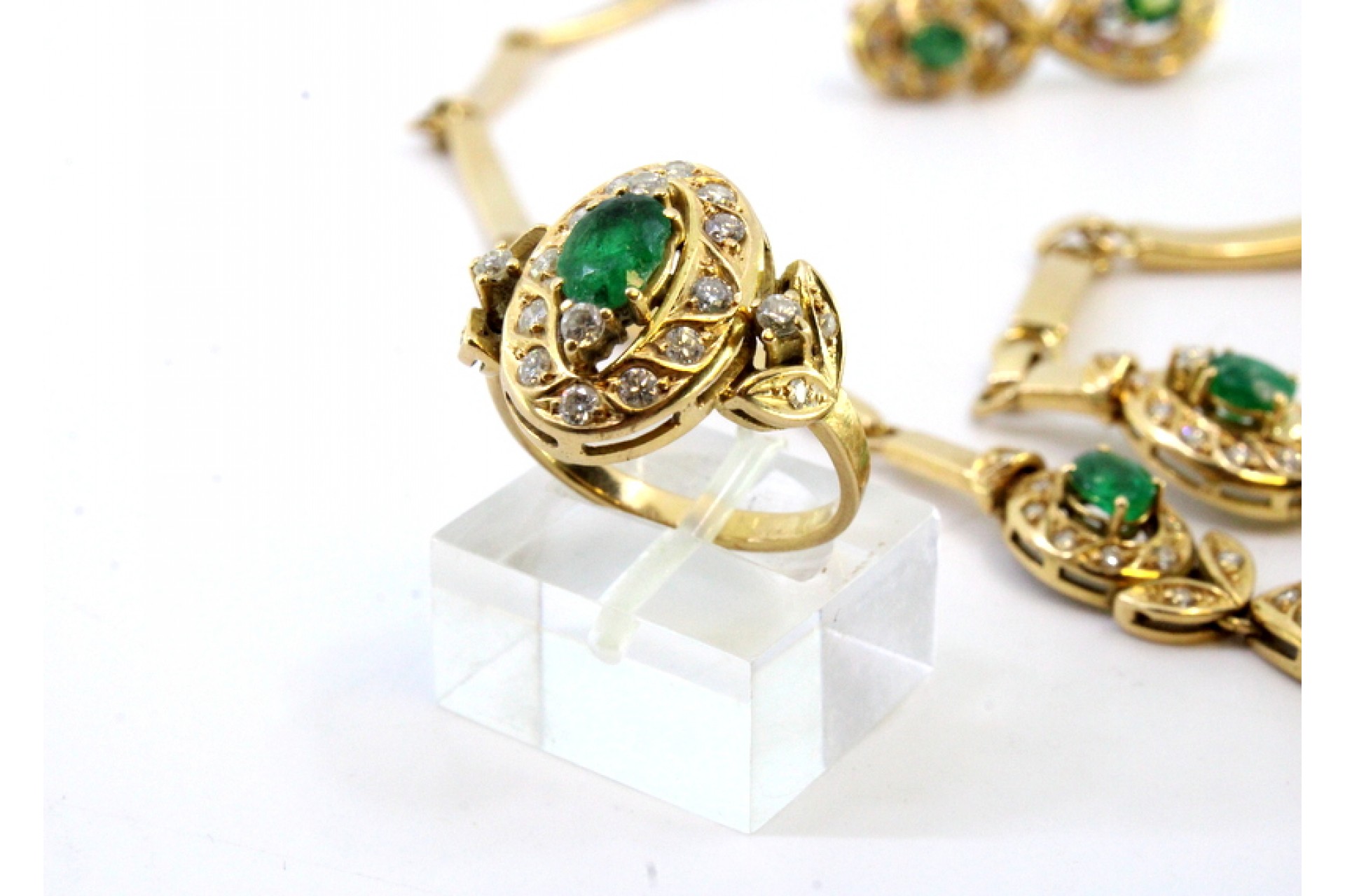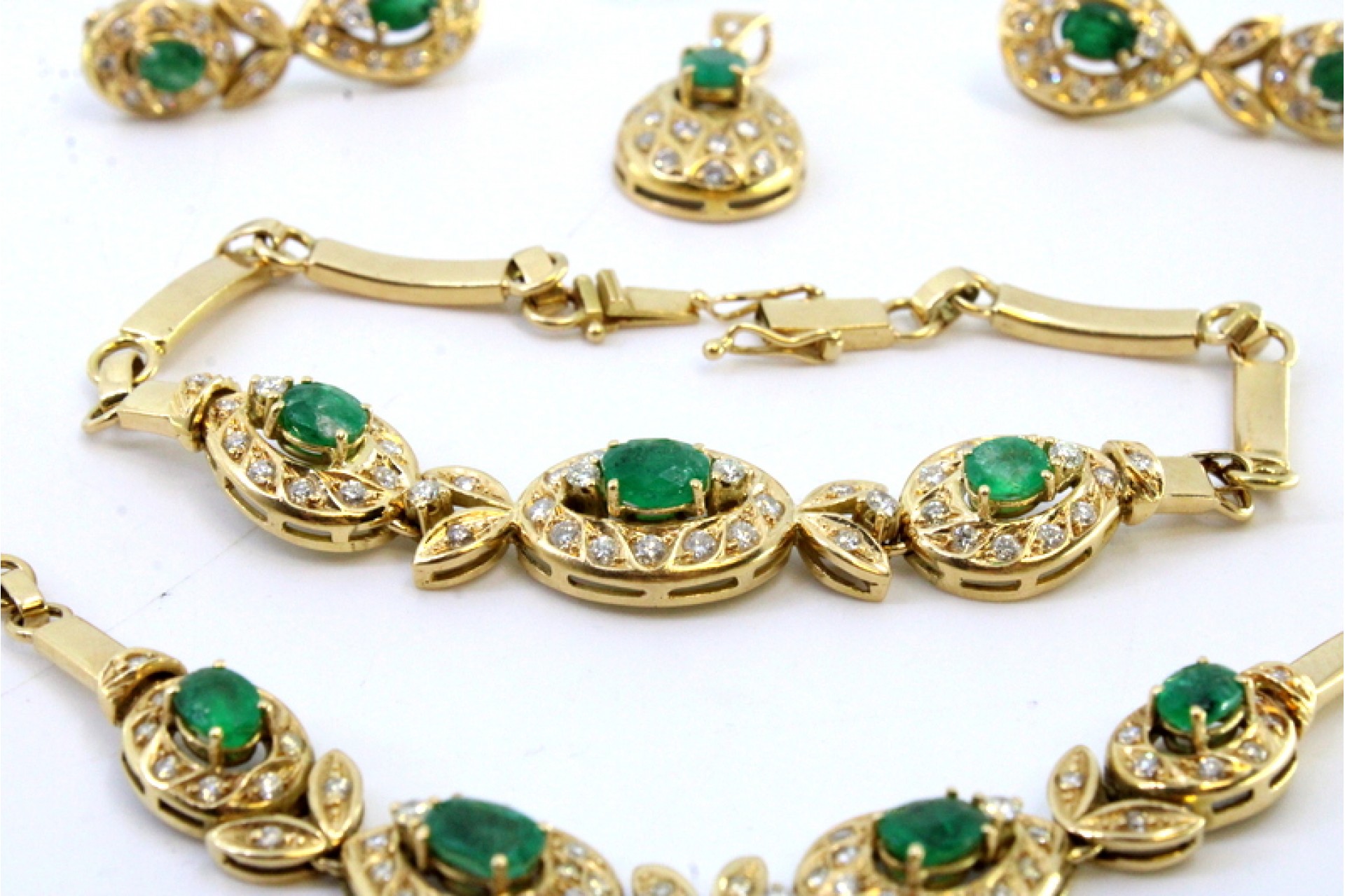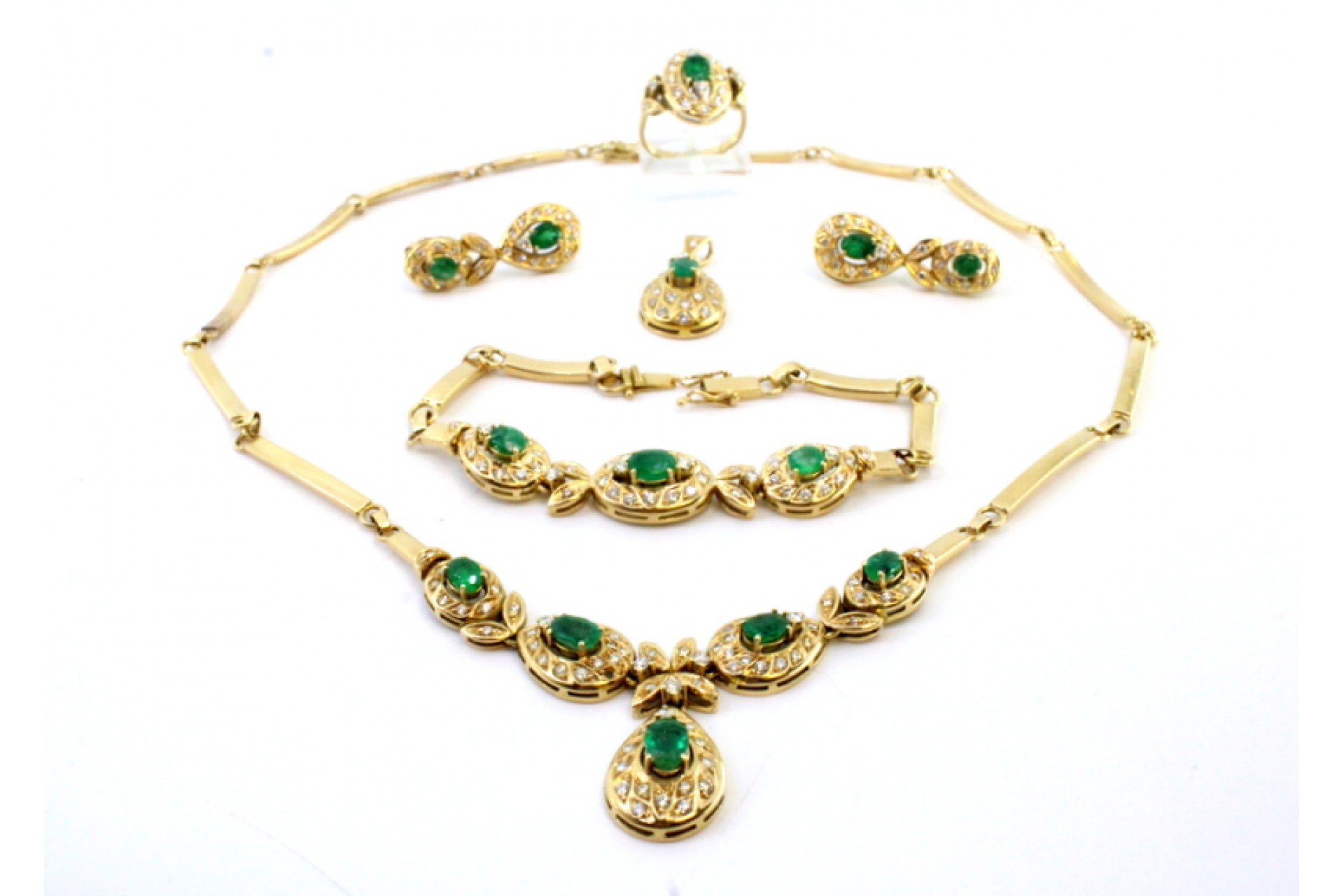 • Descrição: Adereço em ouro com pedras composto por colar, anel, pulseira, brincos e pendente com diamantes em talhe brilhante e esmeraldas em talhe pera.