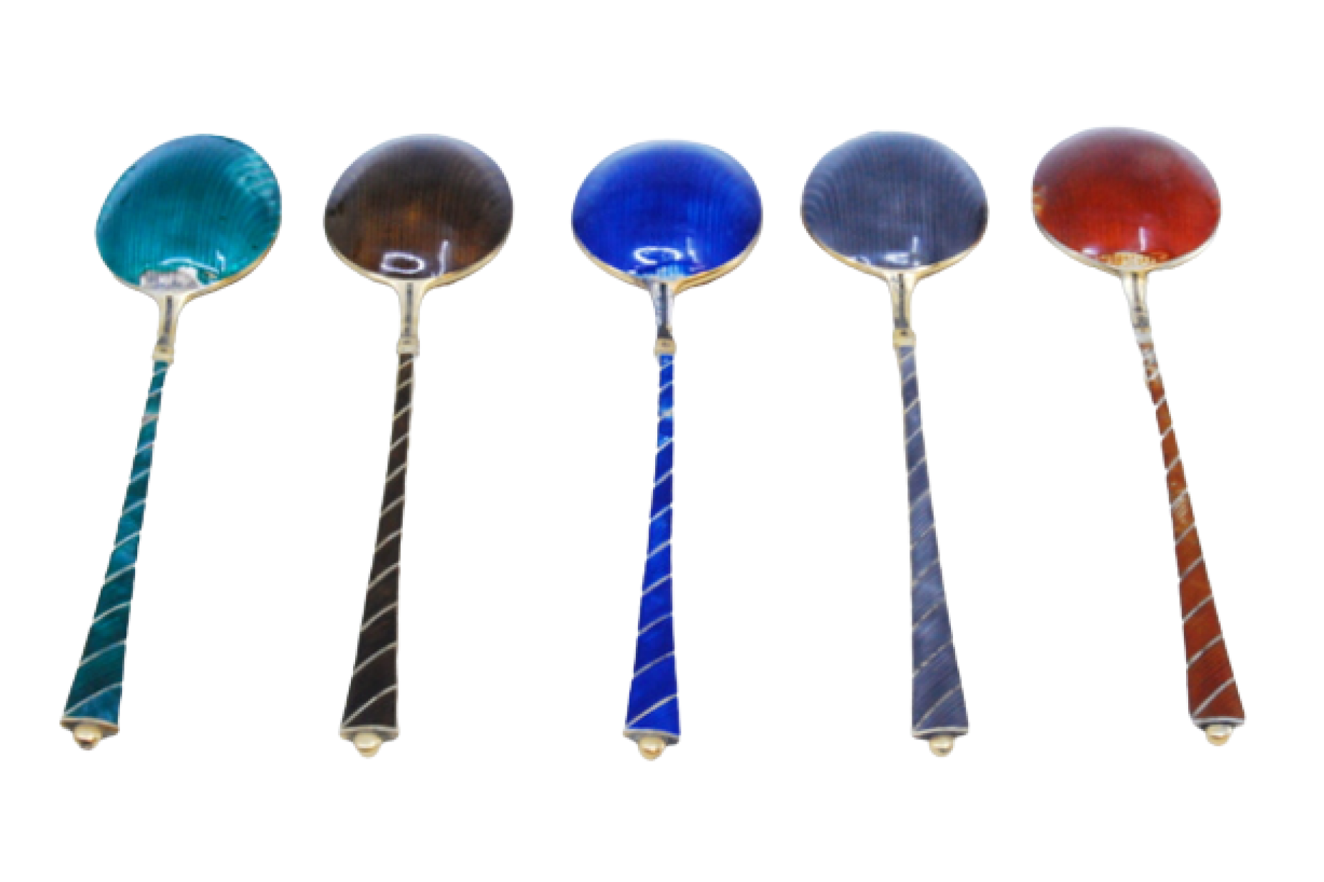 Conjunto de cinco colheres de sobremesa em prata esmaltada de várias cores .