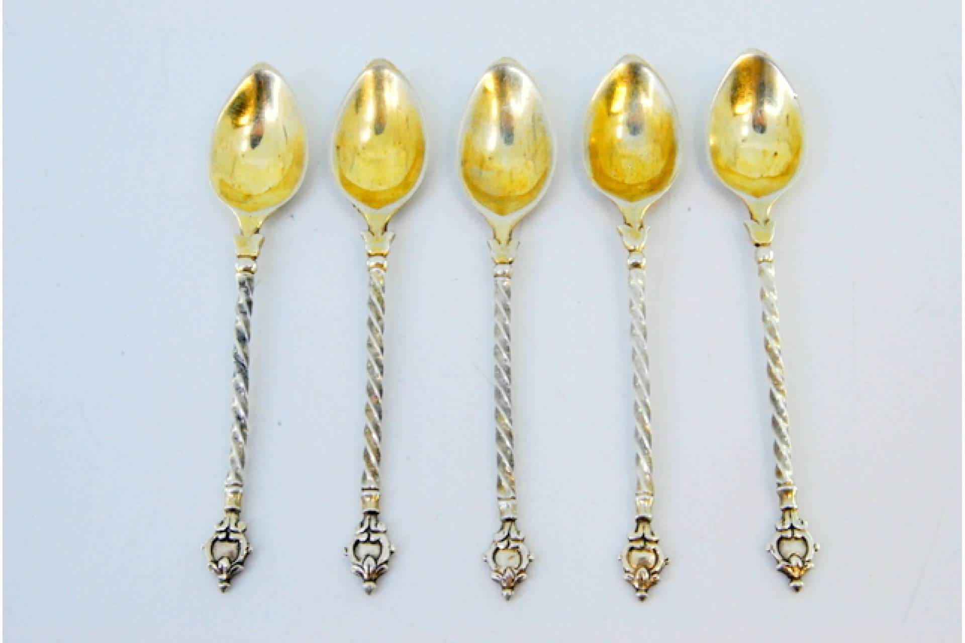 Conjunto de cinco colheres de café em prata com aplicações nos cabos retorcidos.