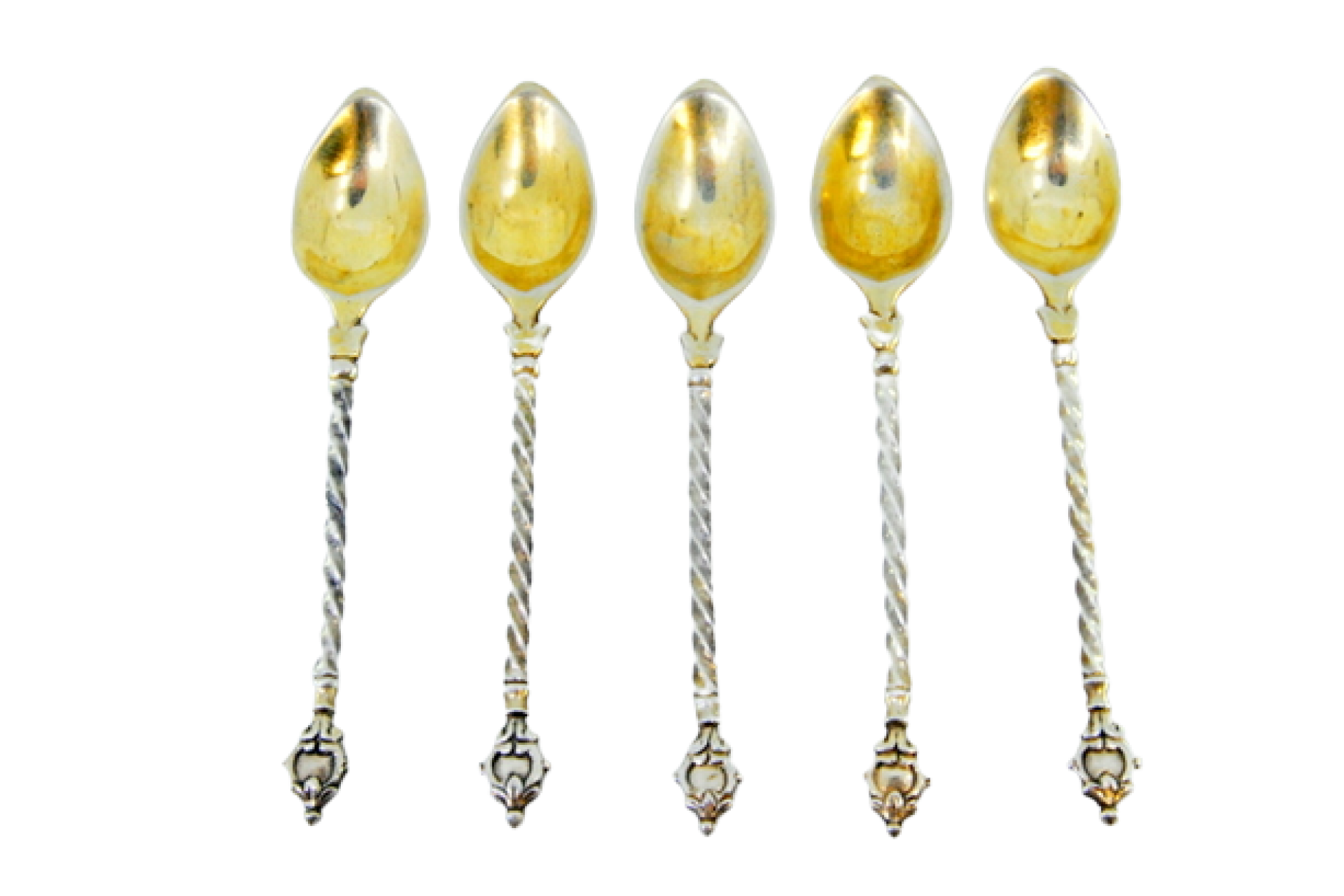 • Descrição: Conjunto de cinco colheres de café em prata com aplicações nos cabos retorcidos.