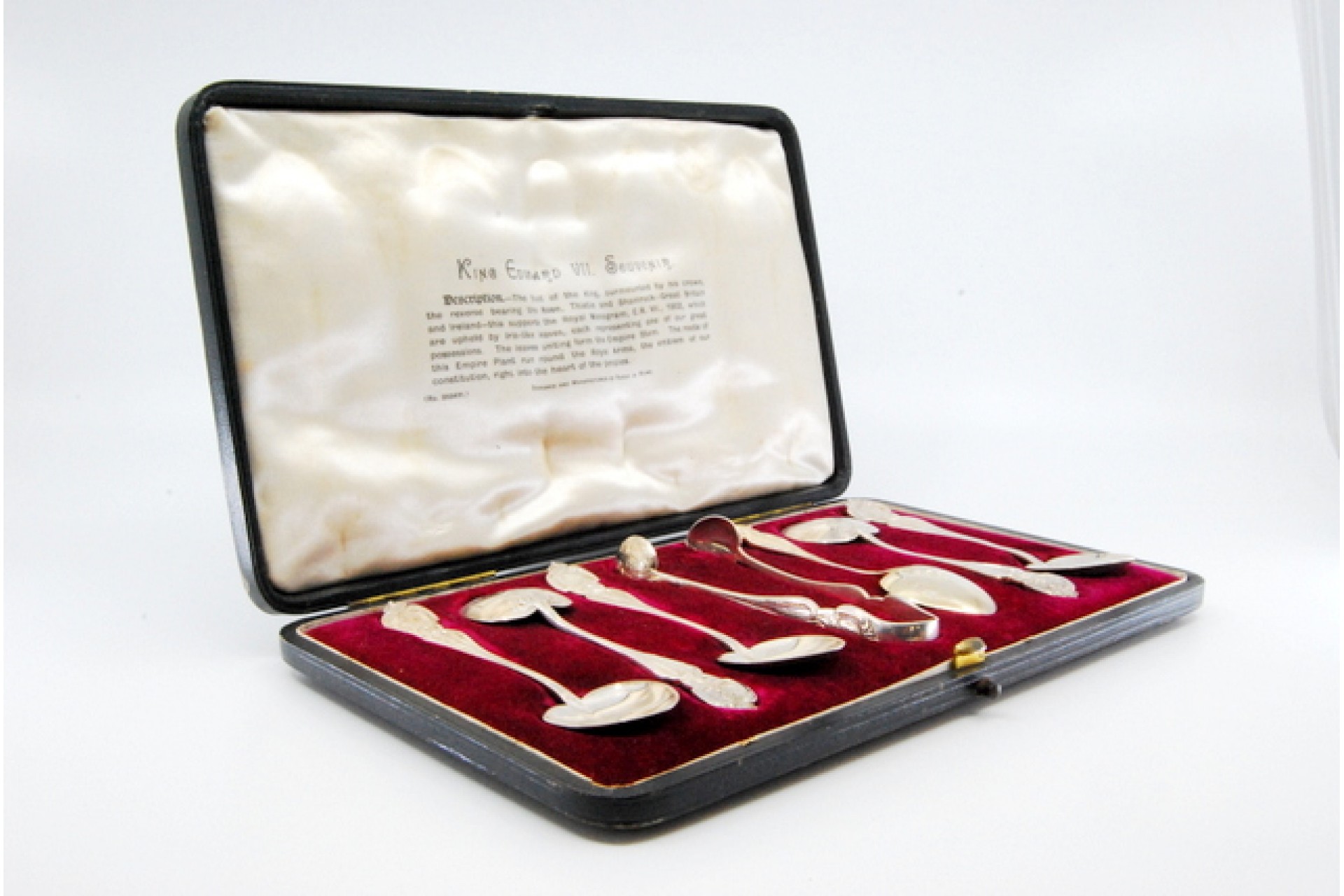 • Descrição: Conjunto de seis colheres de chá e pinça para açúcar com busto do rei Eduardo VII.