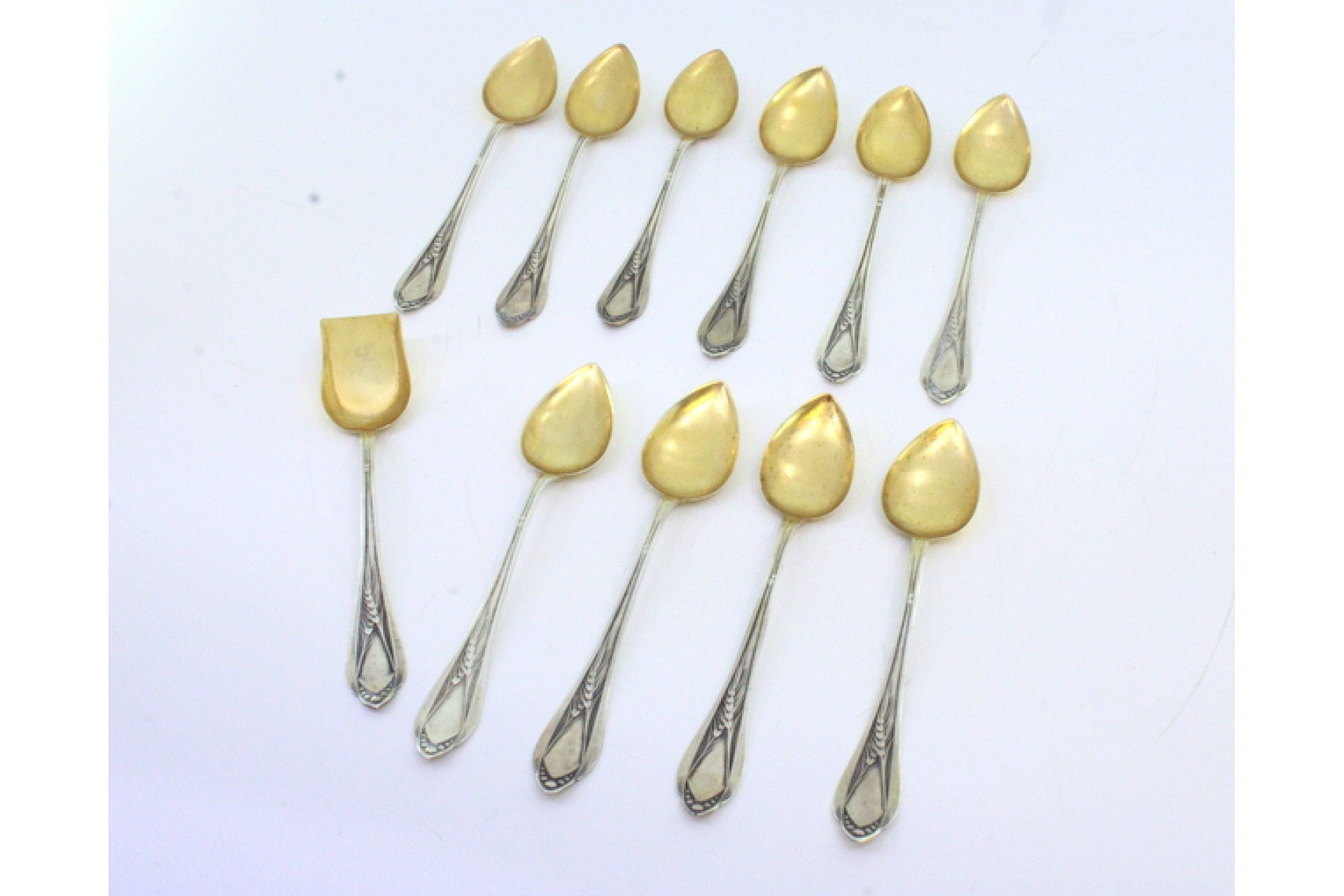 Conjunto de dez colheres de chá e uma pá de açúcar em prata com concha dourada e relevos nos cabos.
