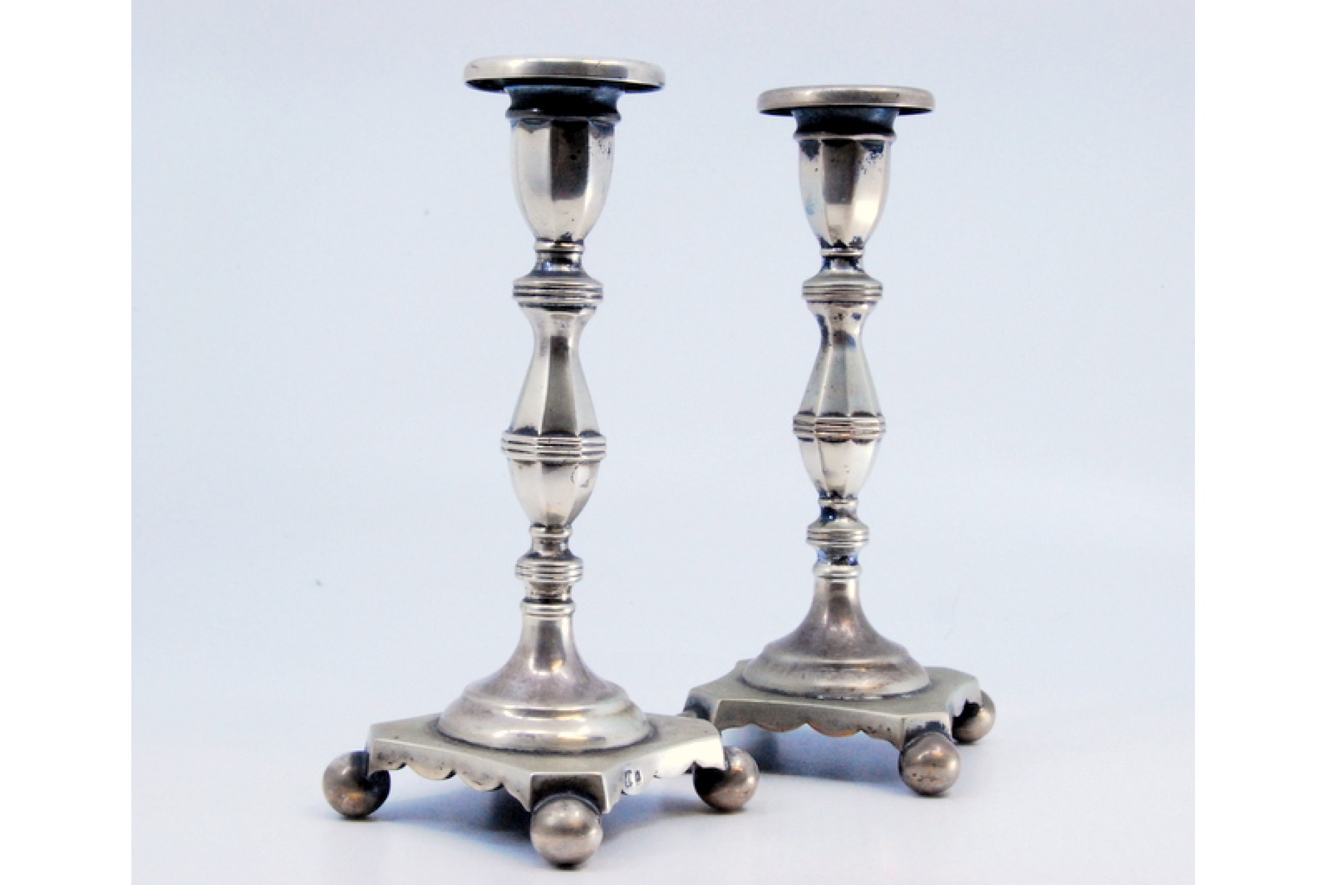 • Descrição: Castiçais baixos em prata torneada e assentes sobre bases quadradas com quatro pés de forma esférica.