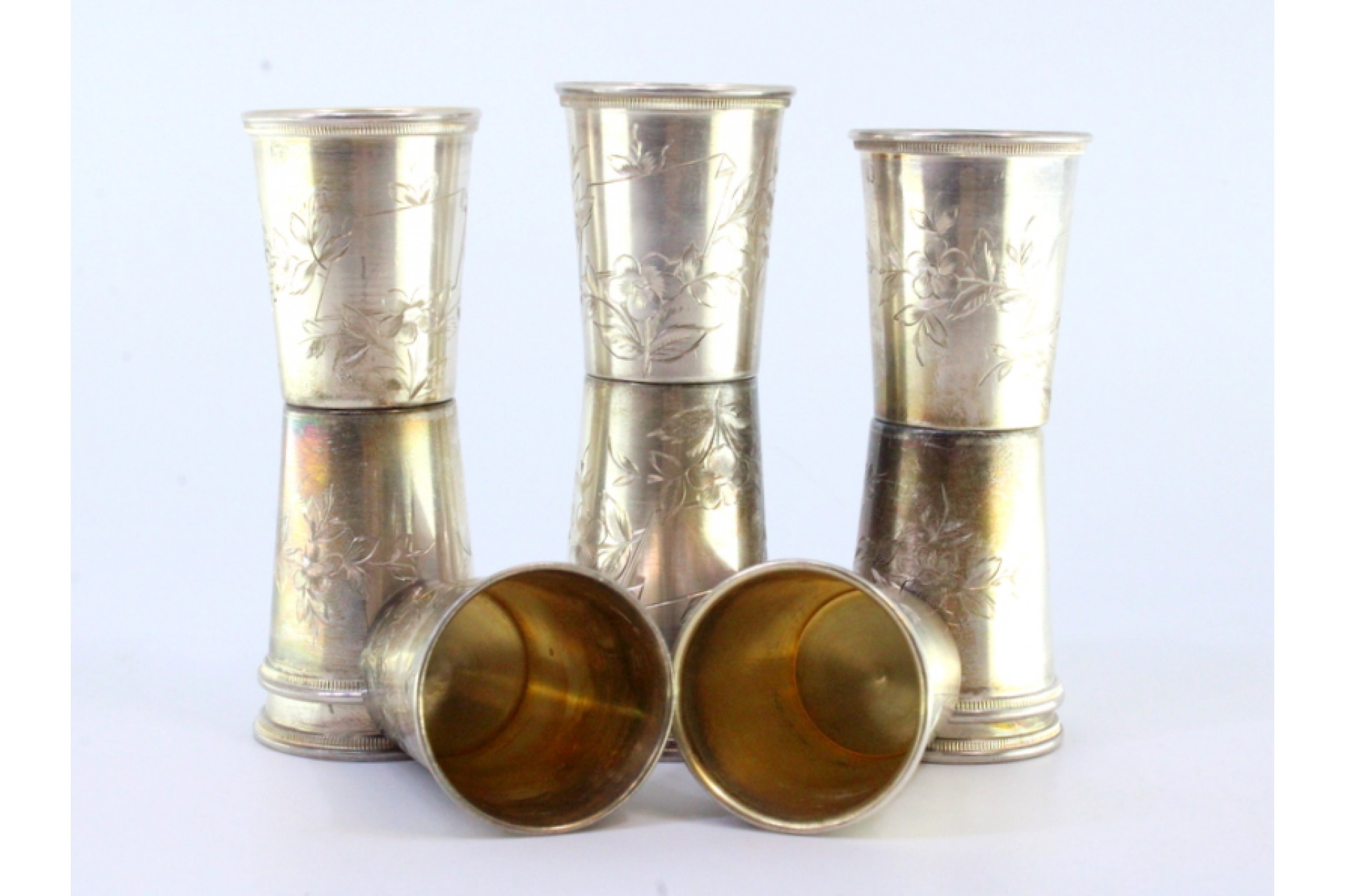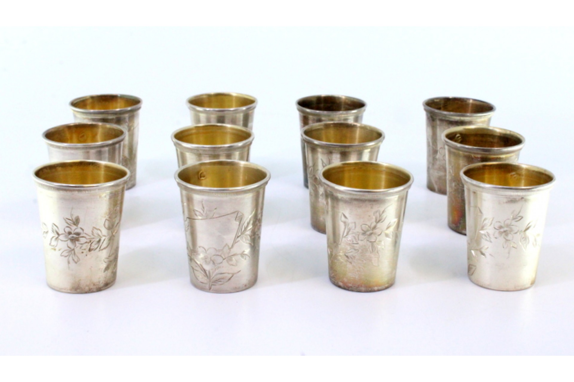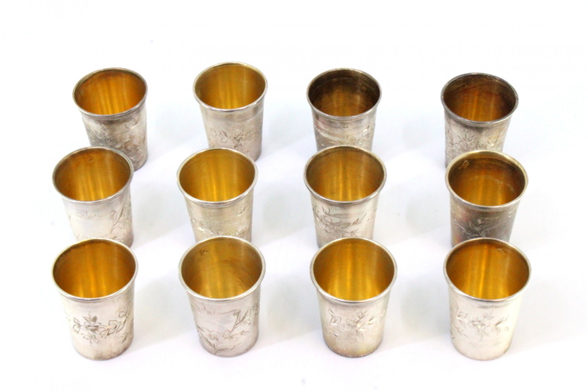 Conjunto de doze copos pra vodka em prata com relevos florais envolvendo cartelas para monogramas e interior em dourado.