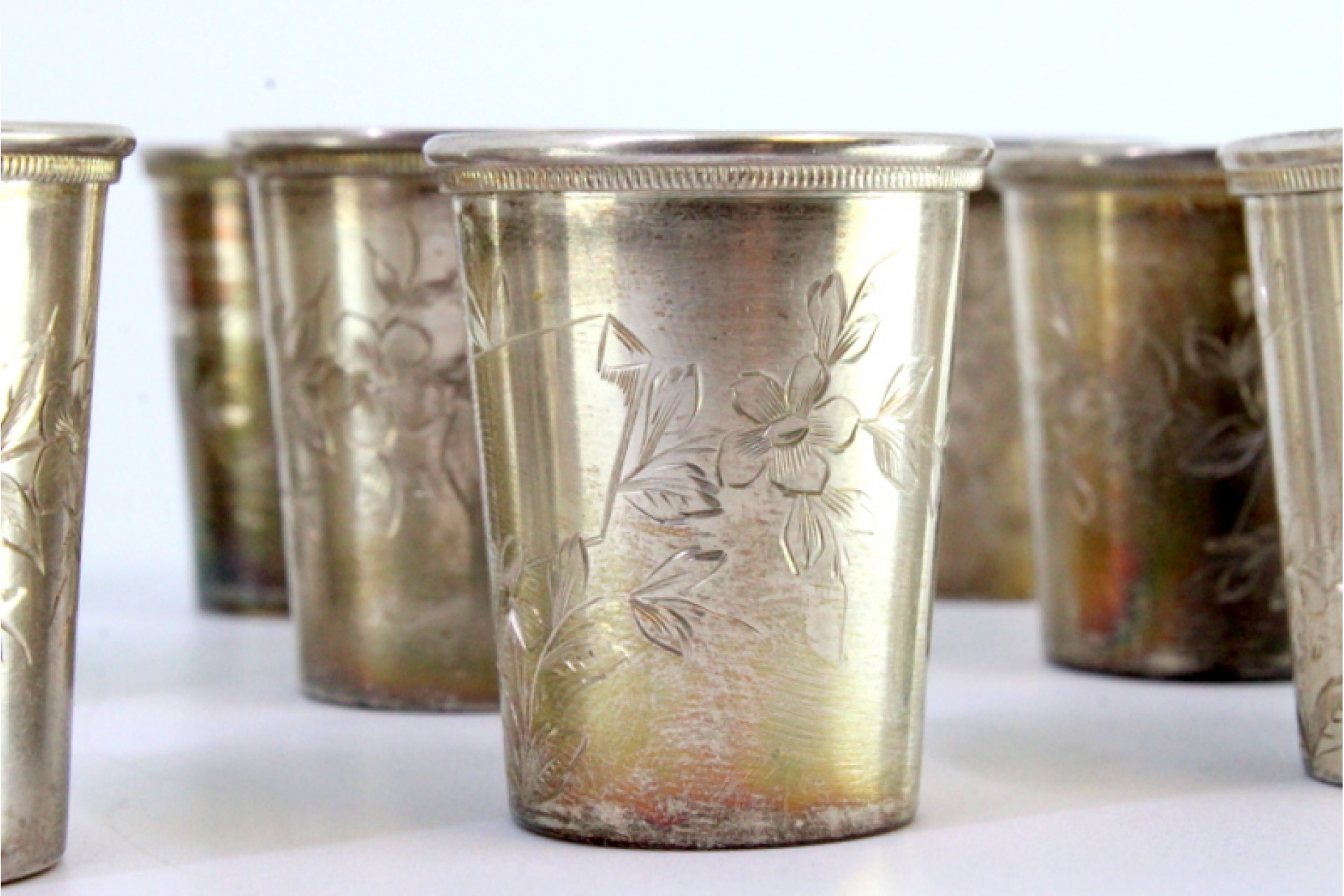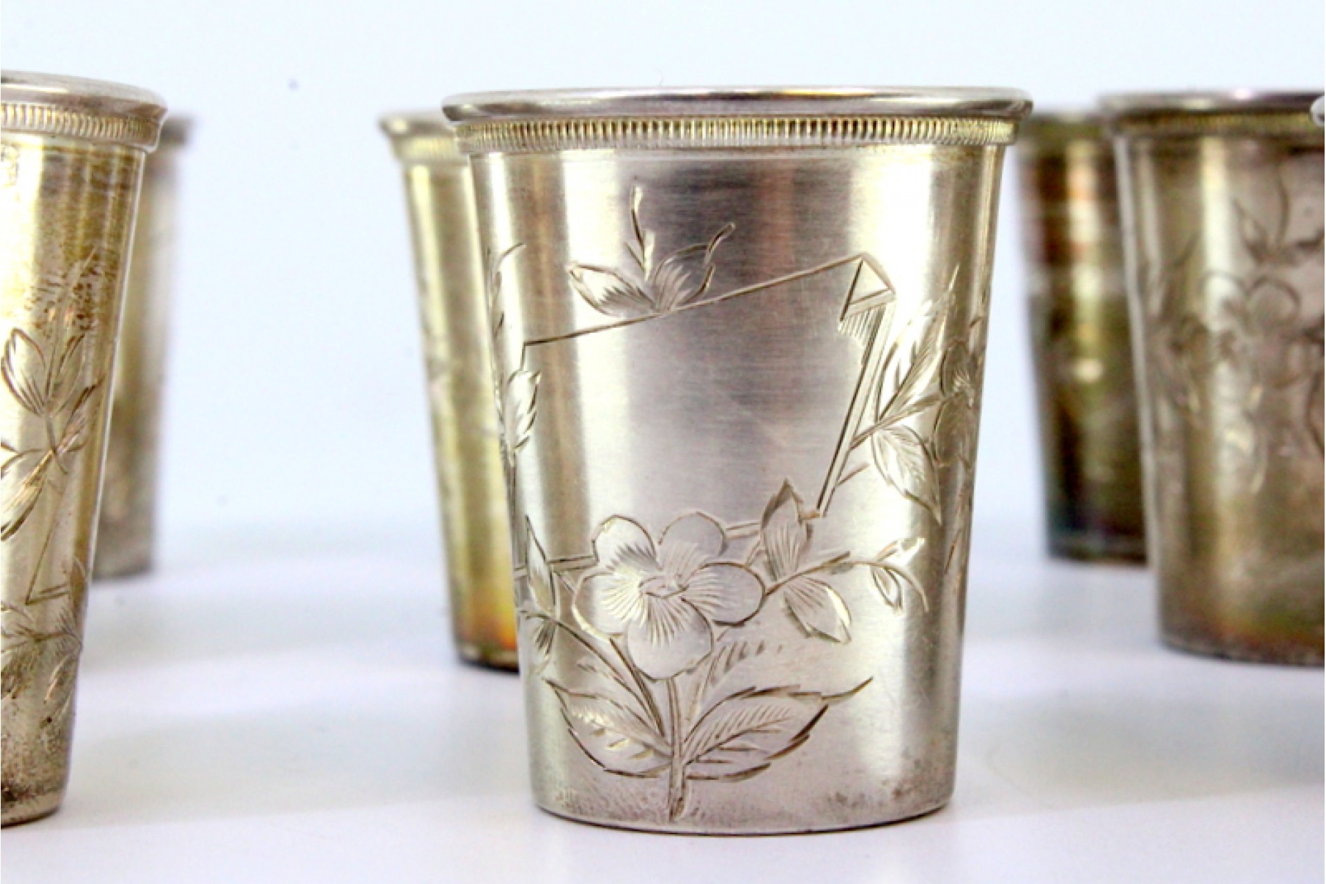 • Descrição: Conjunto de doze copos pra vodka em prata com relevos florais envolvendo cartelas para monogramas e interior em dourado.