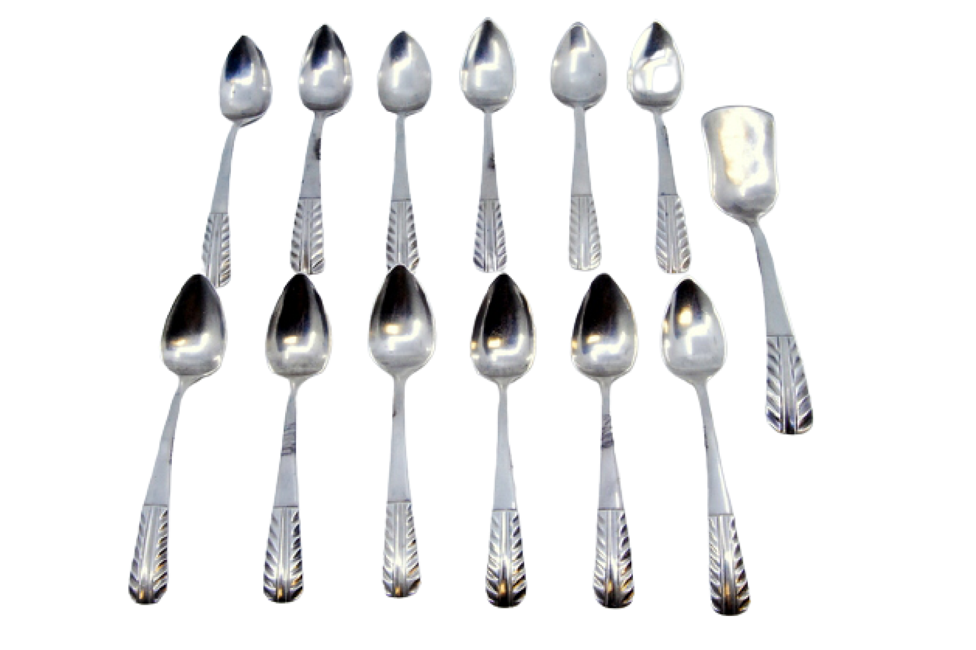 • Descrição: Conjunto de doze colheres de chá de prata e pá de açúcar com os cabos relevados.
