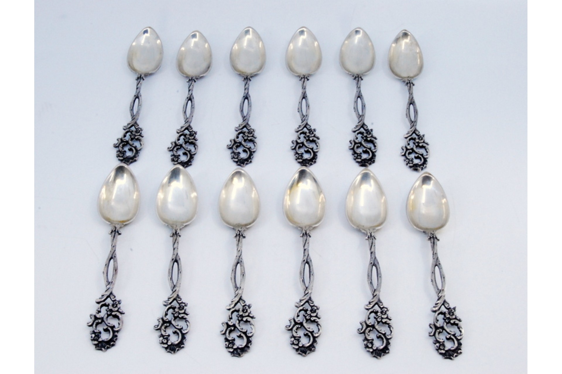 • Descrição: Conjunto de doze colheres de café em prata com cabos recortados.