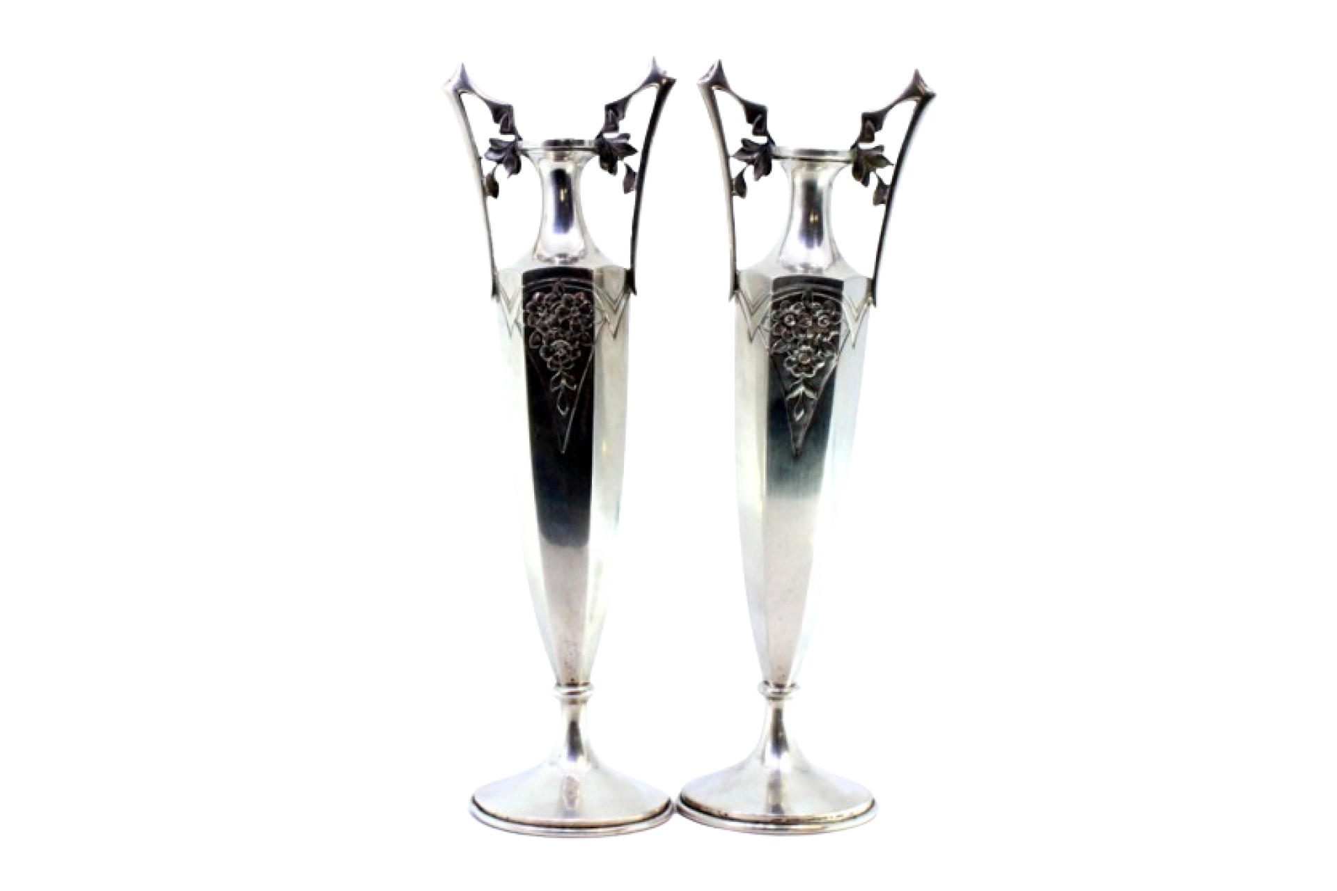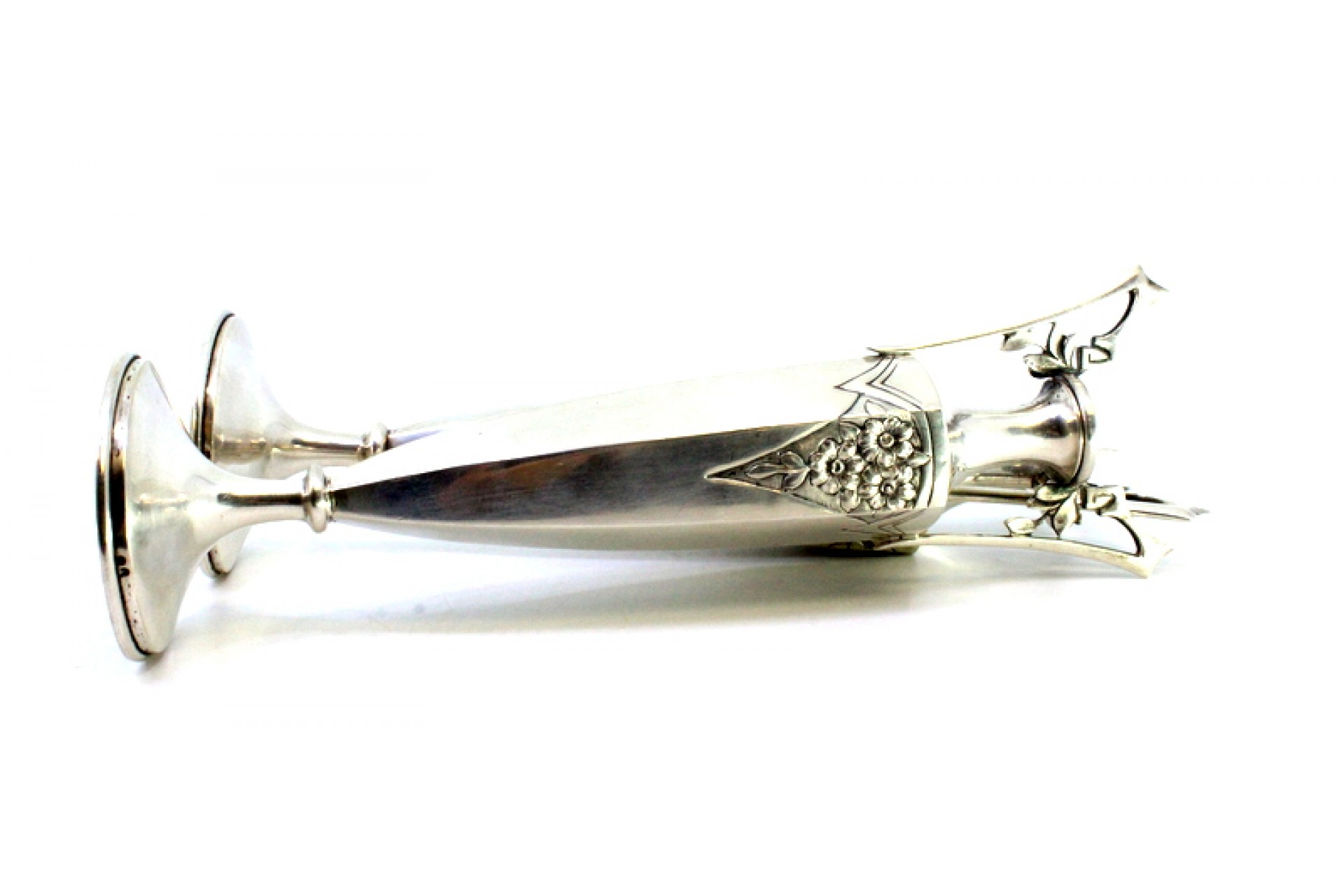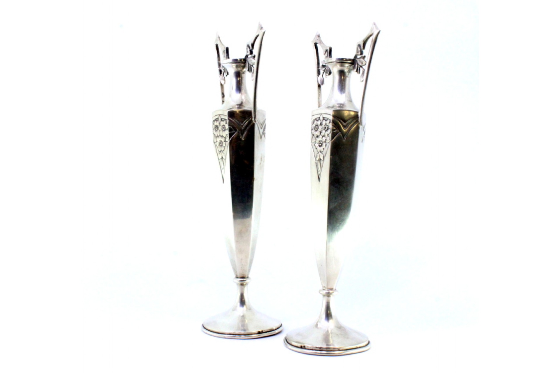 Conjunto de jarras em prata com motivos florais relevados, forma sextavada