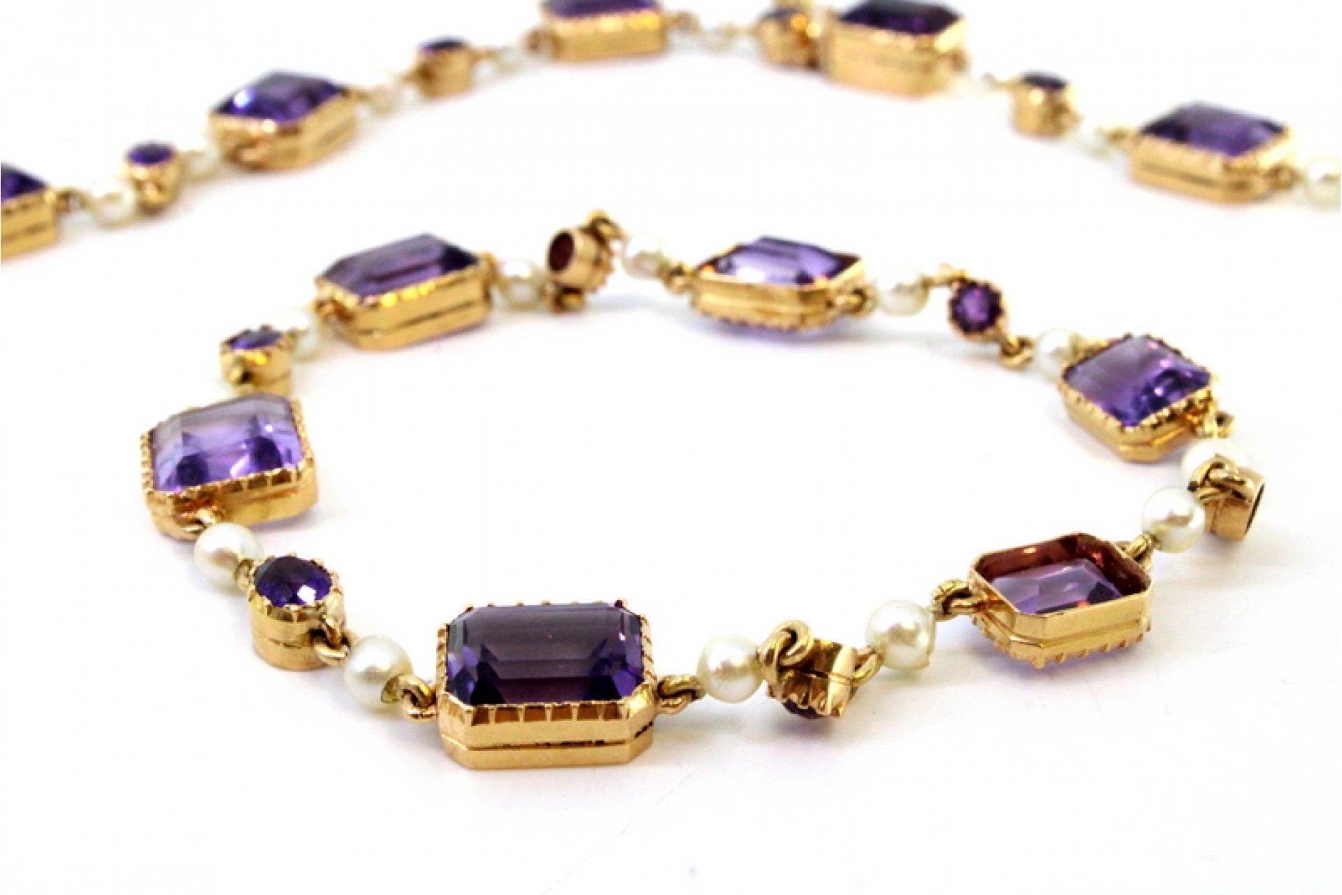 Conjunto de pulseira e colar em ouro com ametistas lapidadas e pérolas