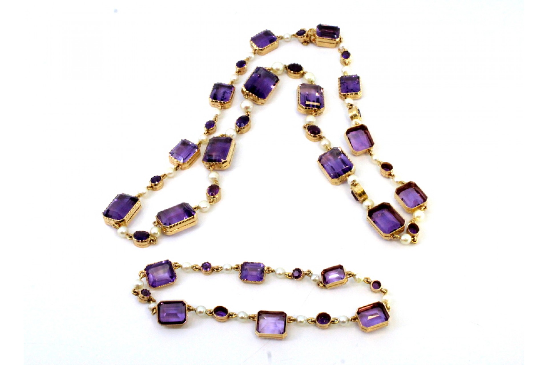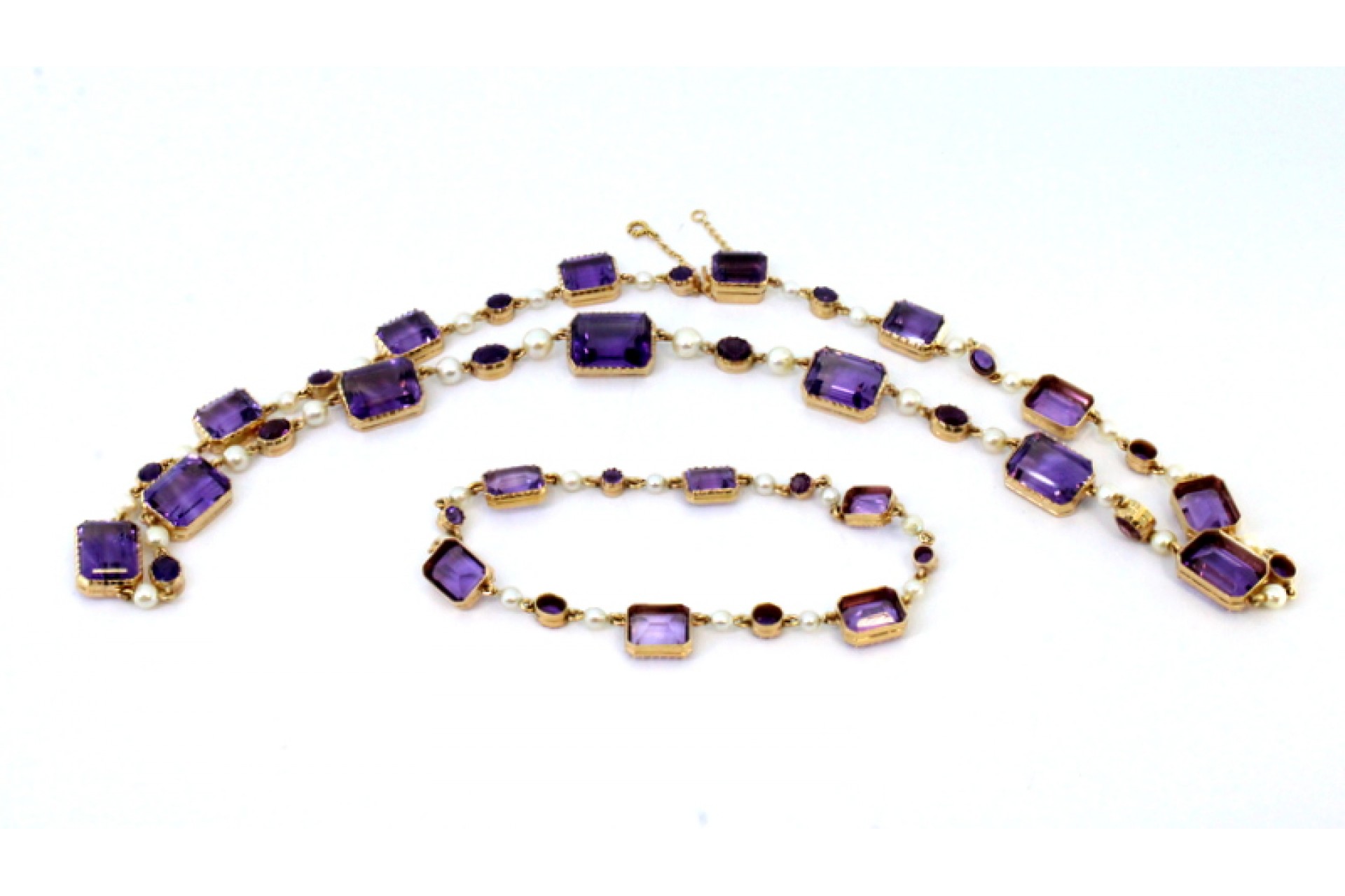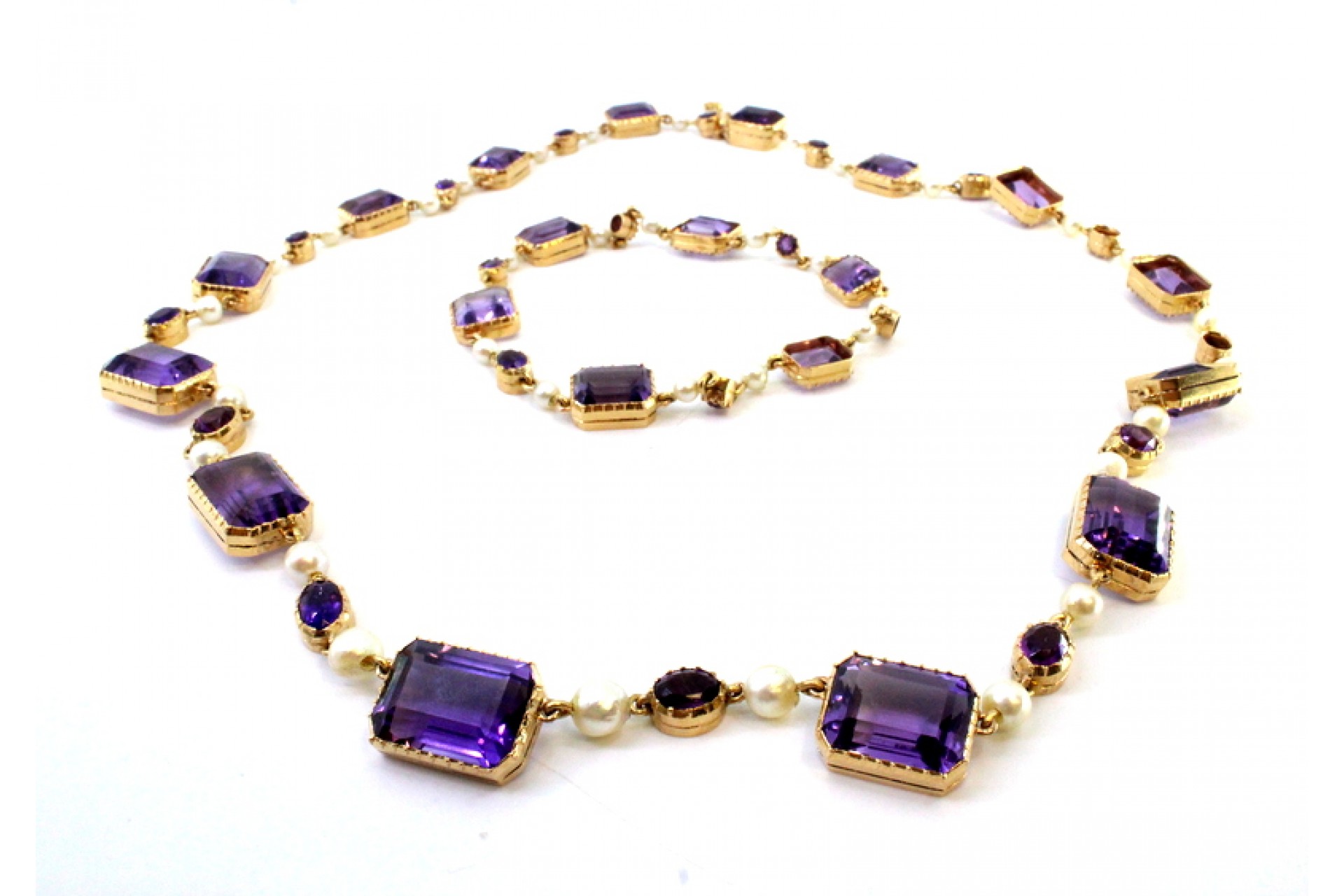 • Descrição: Conjunto de pulseira e colar em ouro com ametistas lapidadas e pérolas de cultura.