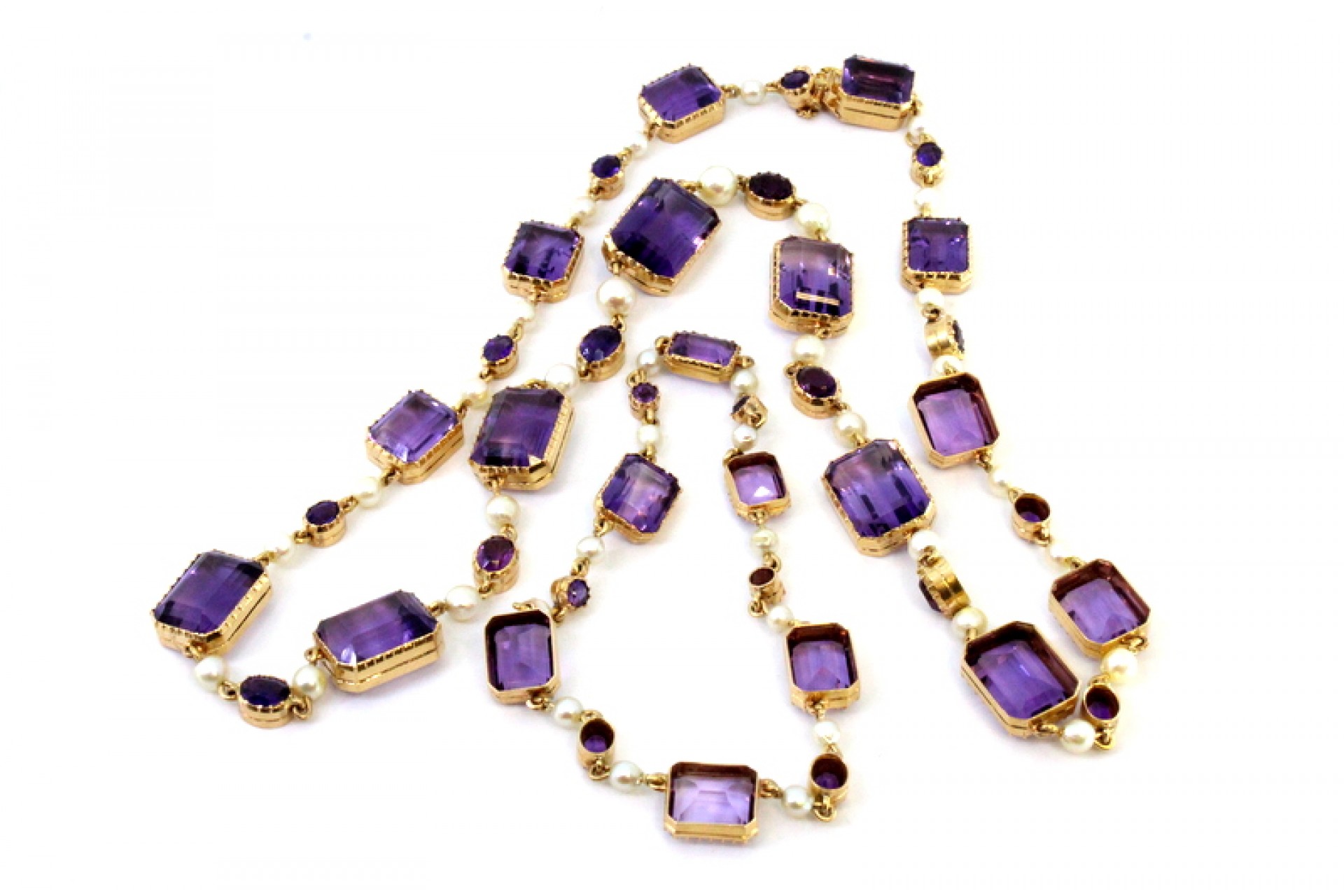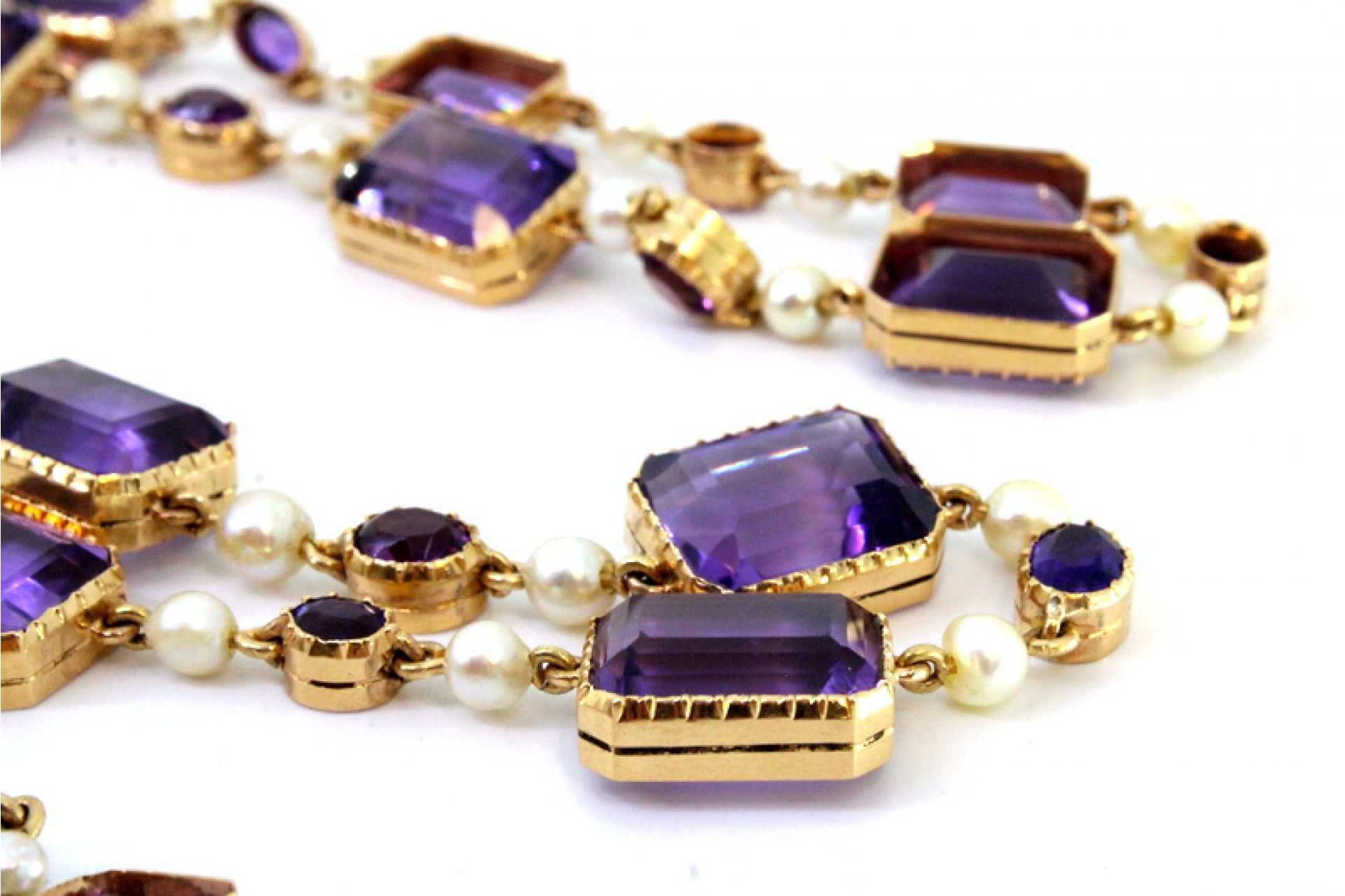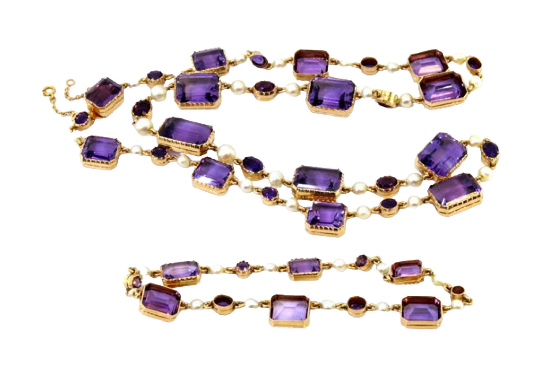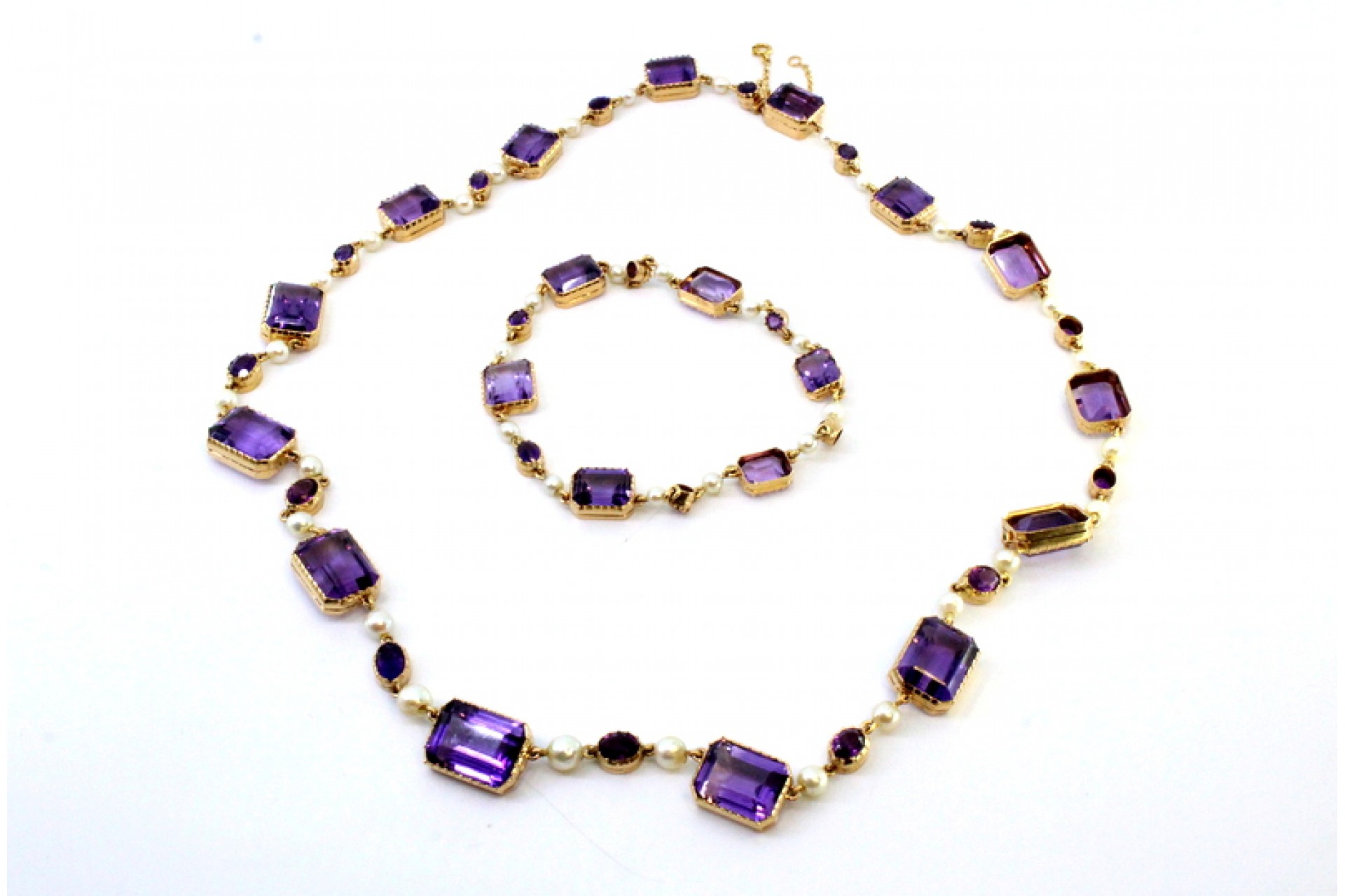 • Descrição: Conjunto de pulseira e colar em ouro com ametistas lapidadas e pérolas de cultura.