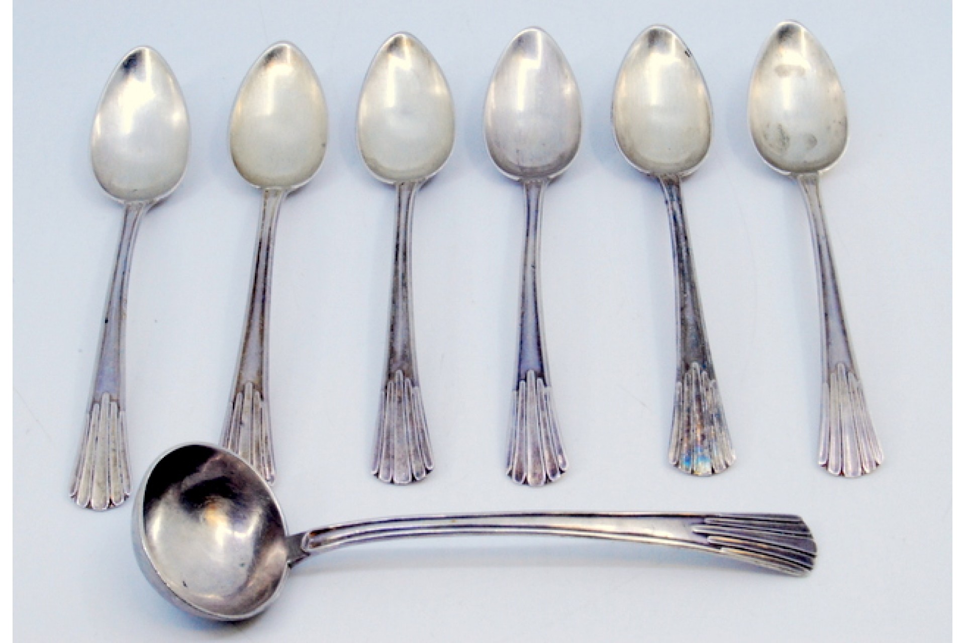 • Descrição: Conjunto de seis colheres de chá e pá de açúcar em prata lisa com relevos nos cabos.