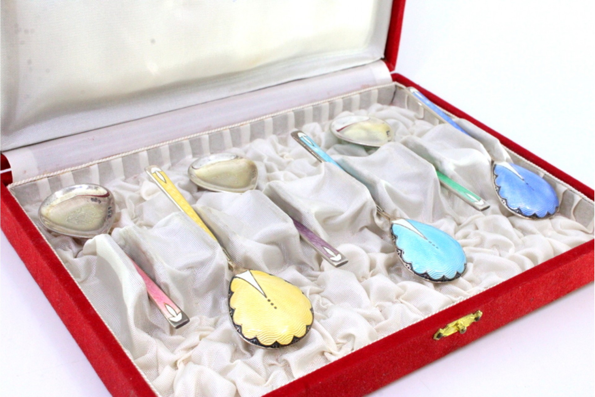 Etiquetas: Conjunto, Colheres, Prata, Cores, Esmalte, Chá