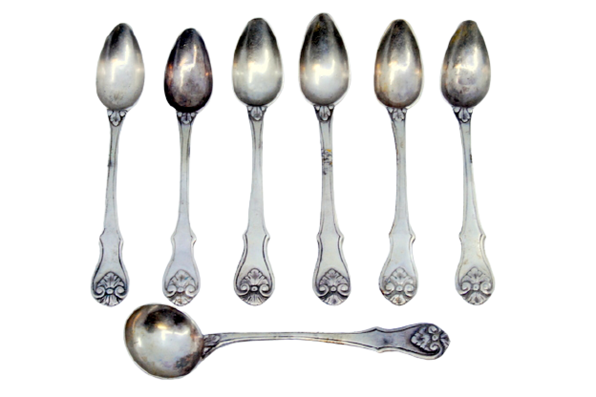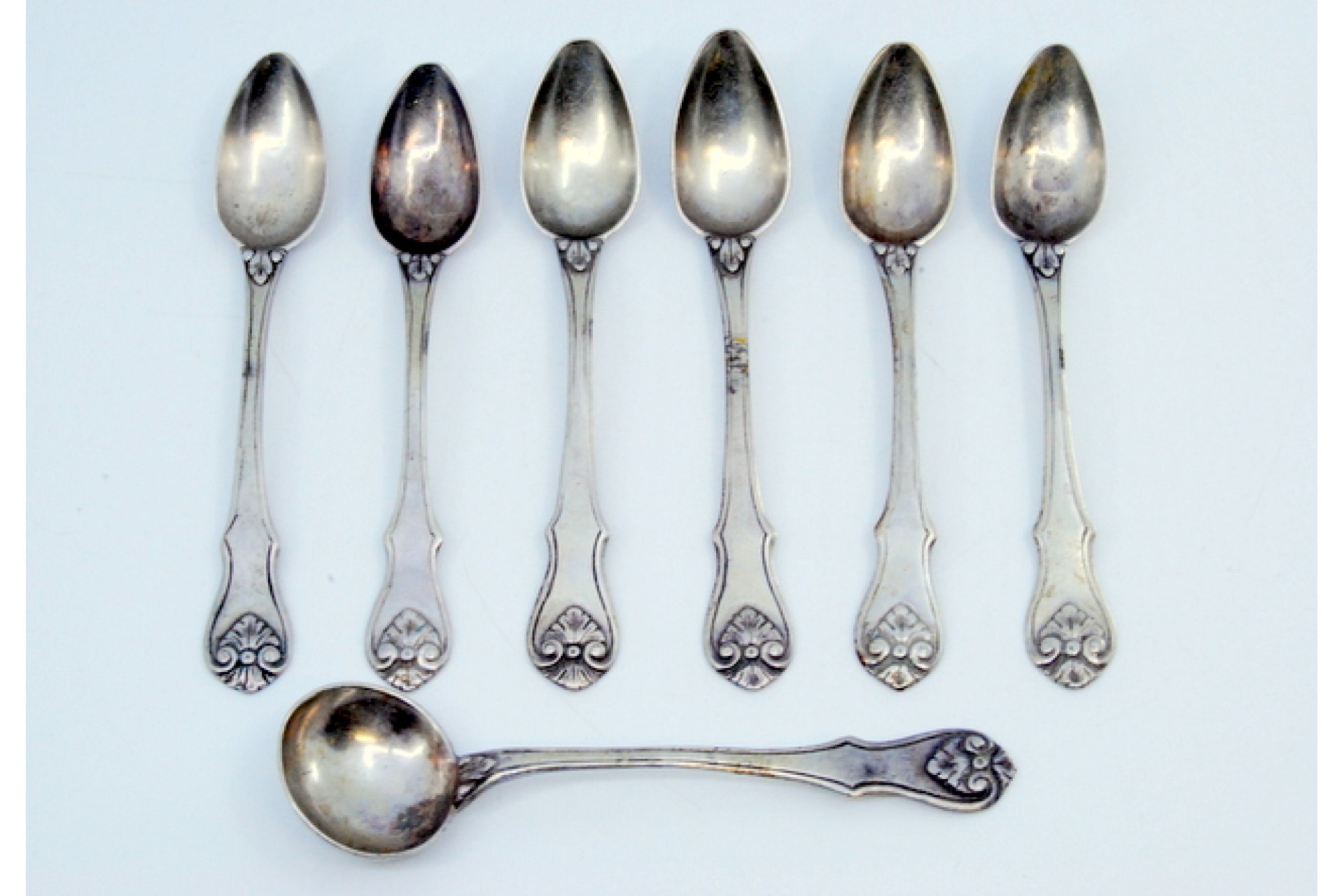 • Descrição: Conjunto de seis colheres de chá e pá de açúcar em prata com relevos nos cabos em forma de conchas.