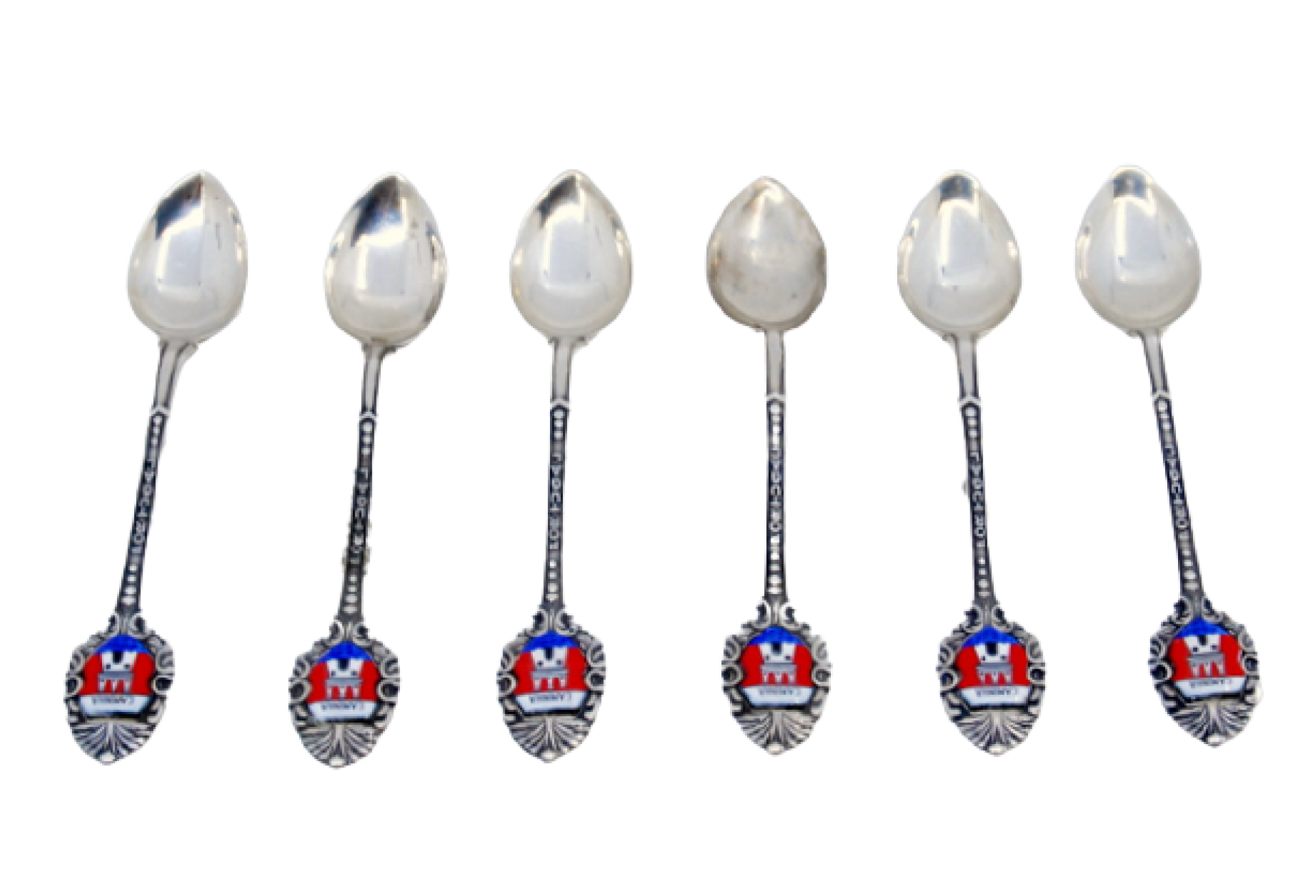 Conjunto de seis colheres de café em prata com brasão da cidade de Caminha.