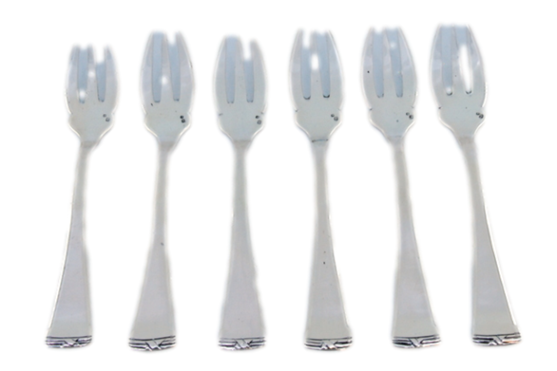• Descrição: Conjunto de seis garfos para ostras em prata com frisos nos cabos.