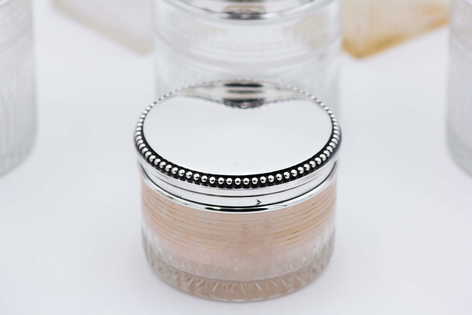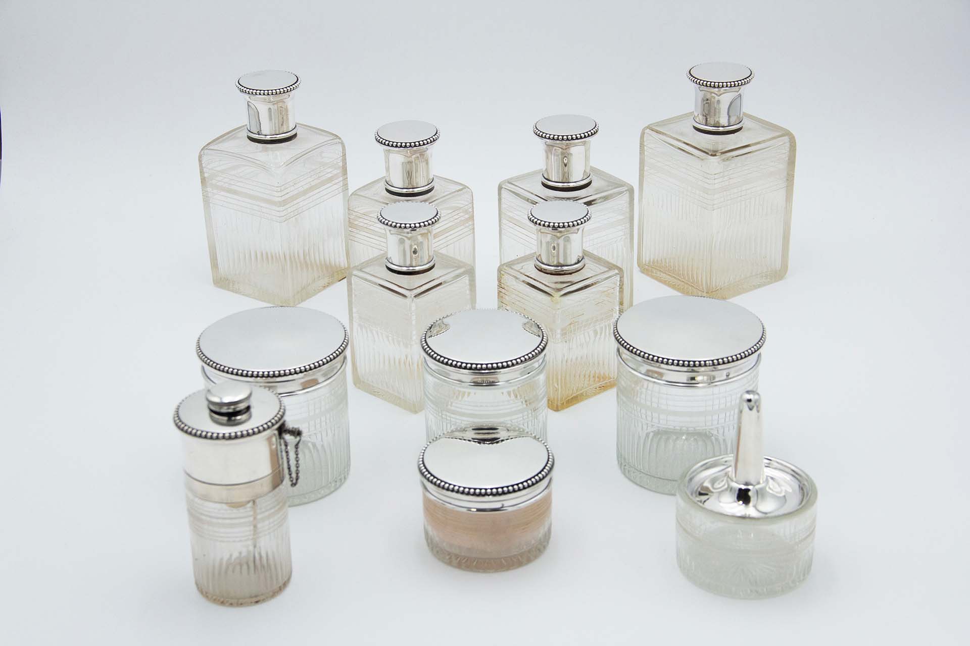 Conjunto de toilette de doze peças em prata e vidro lapidado com caneluras ao alto.