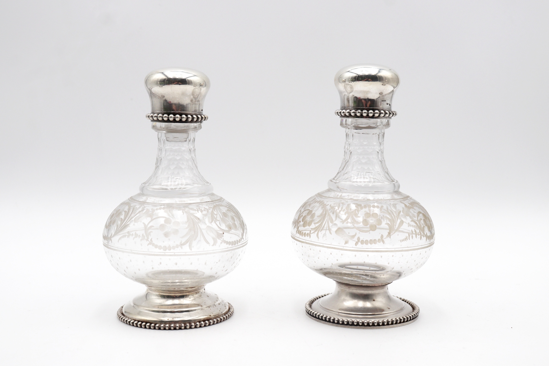• Descrição: Conjunto de toilette em vidro gravado e tampas em prata com friso perlado
