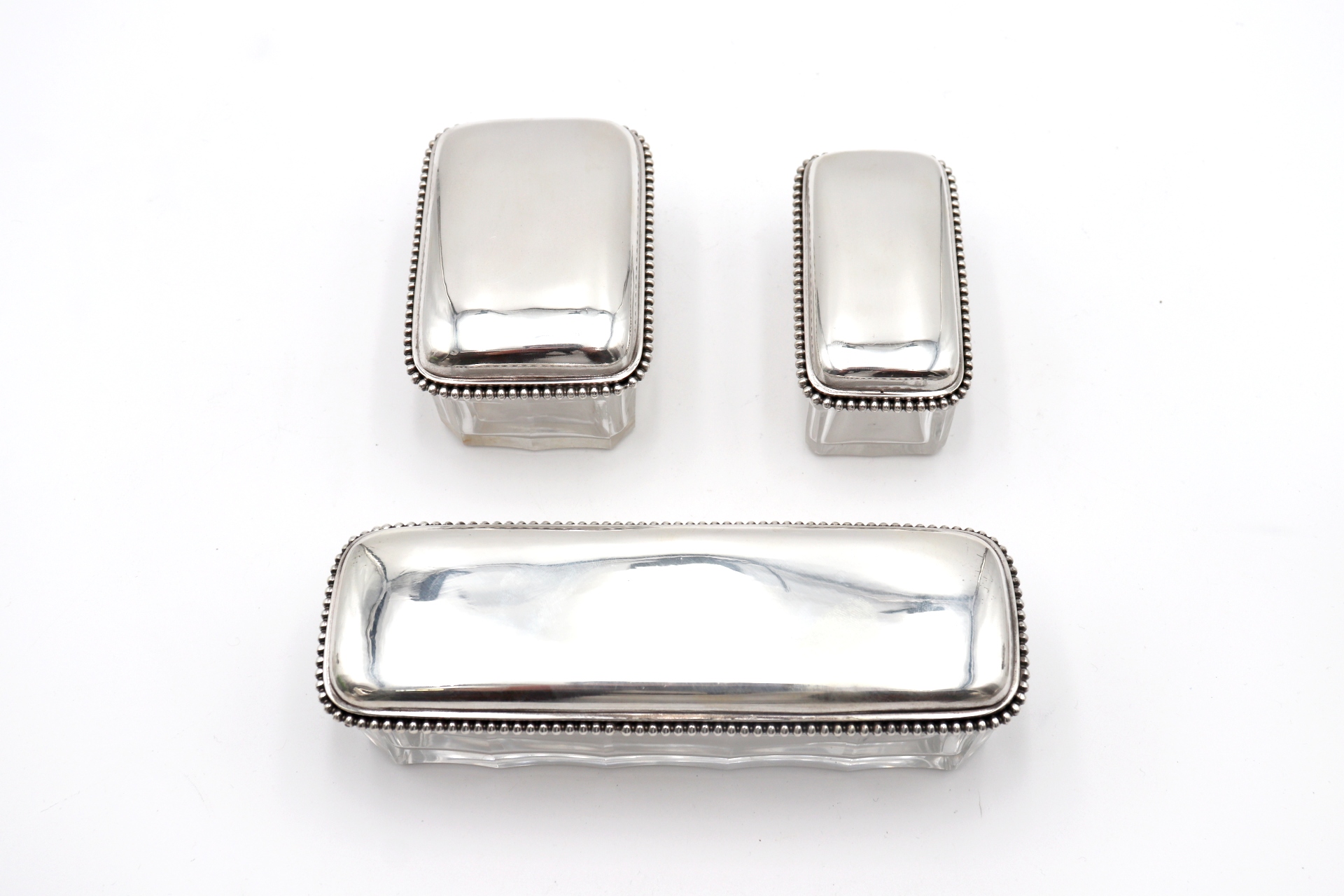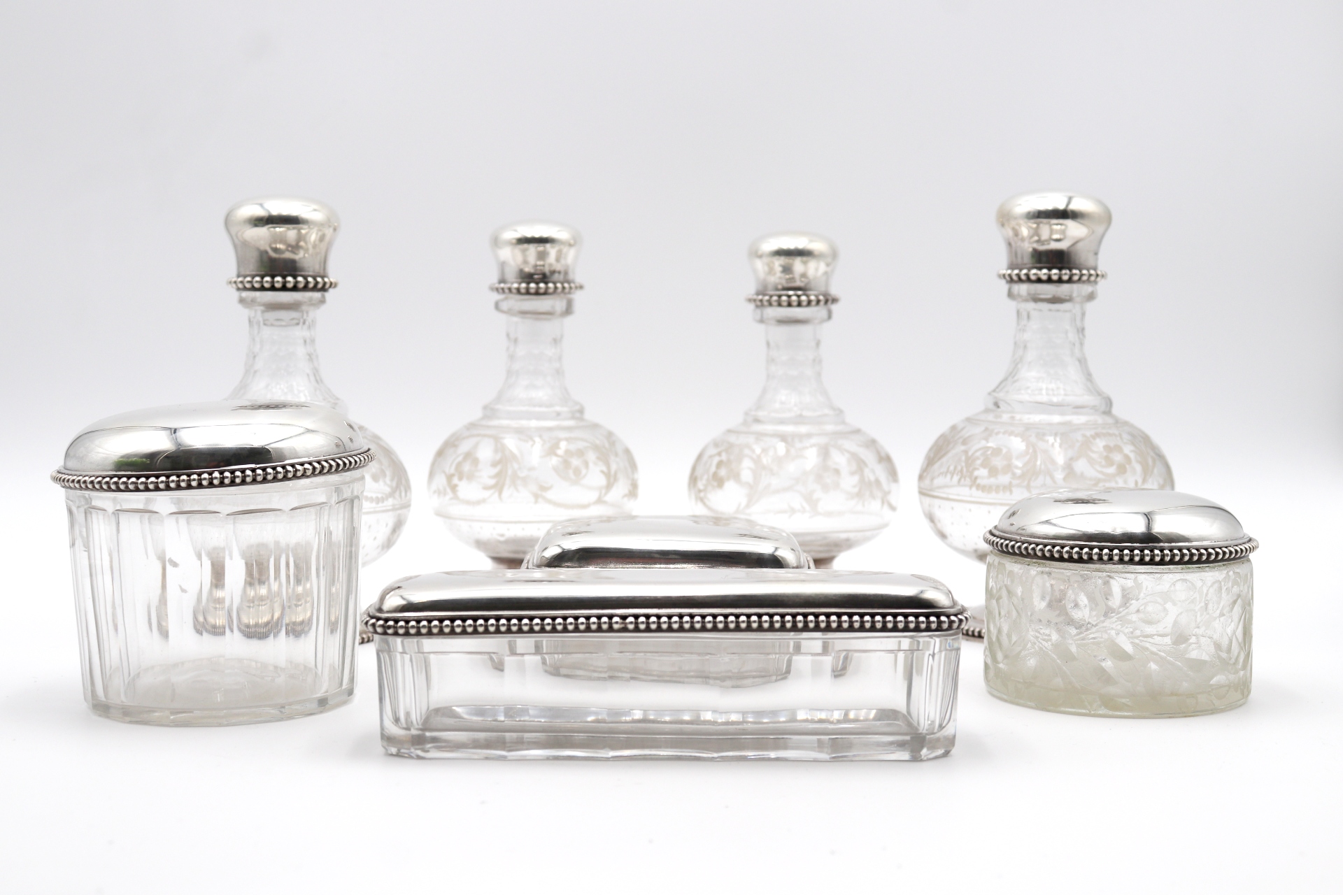 Conjunto de toilette em vidro gravado e tampas em prata com friso perlado