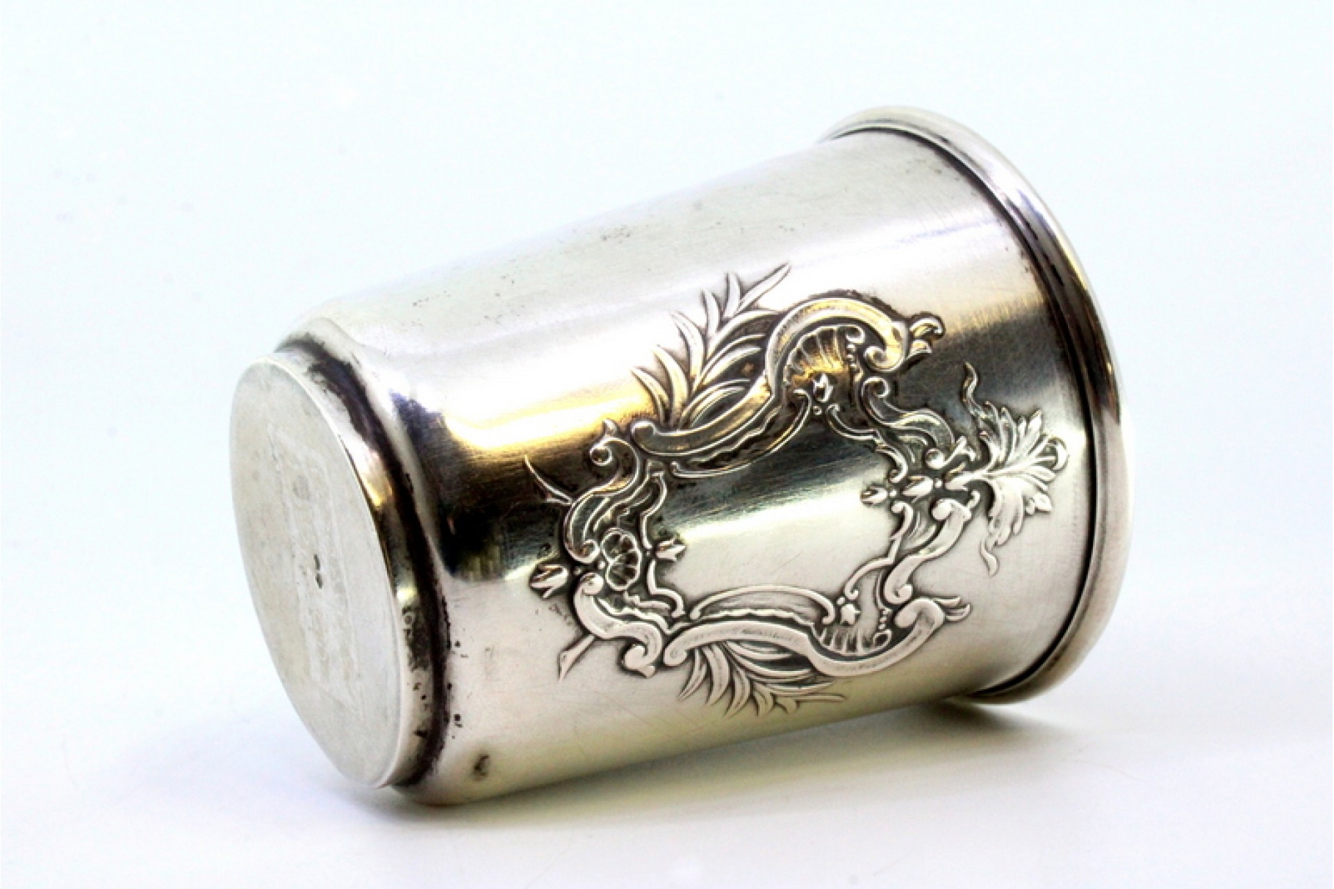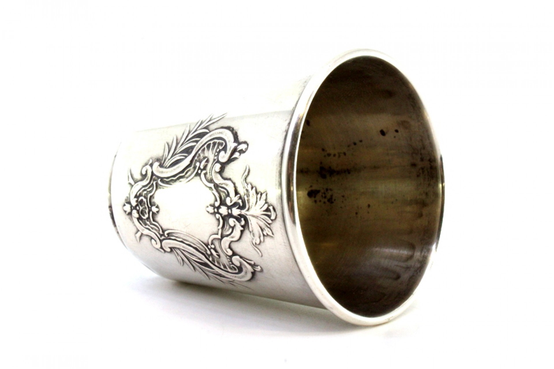 • Descrição: Copo em prata com relevos envolvendo cartela para monograma.