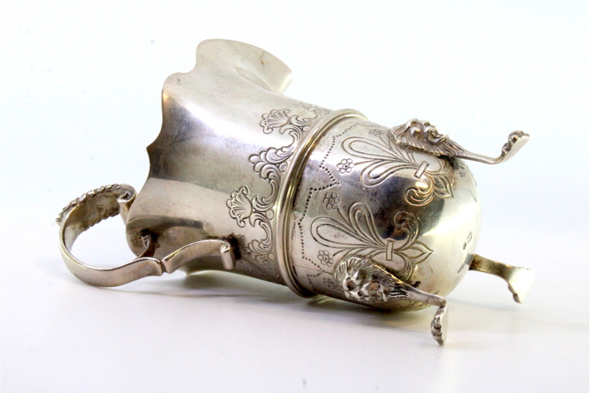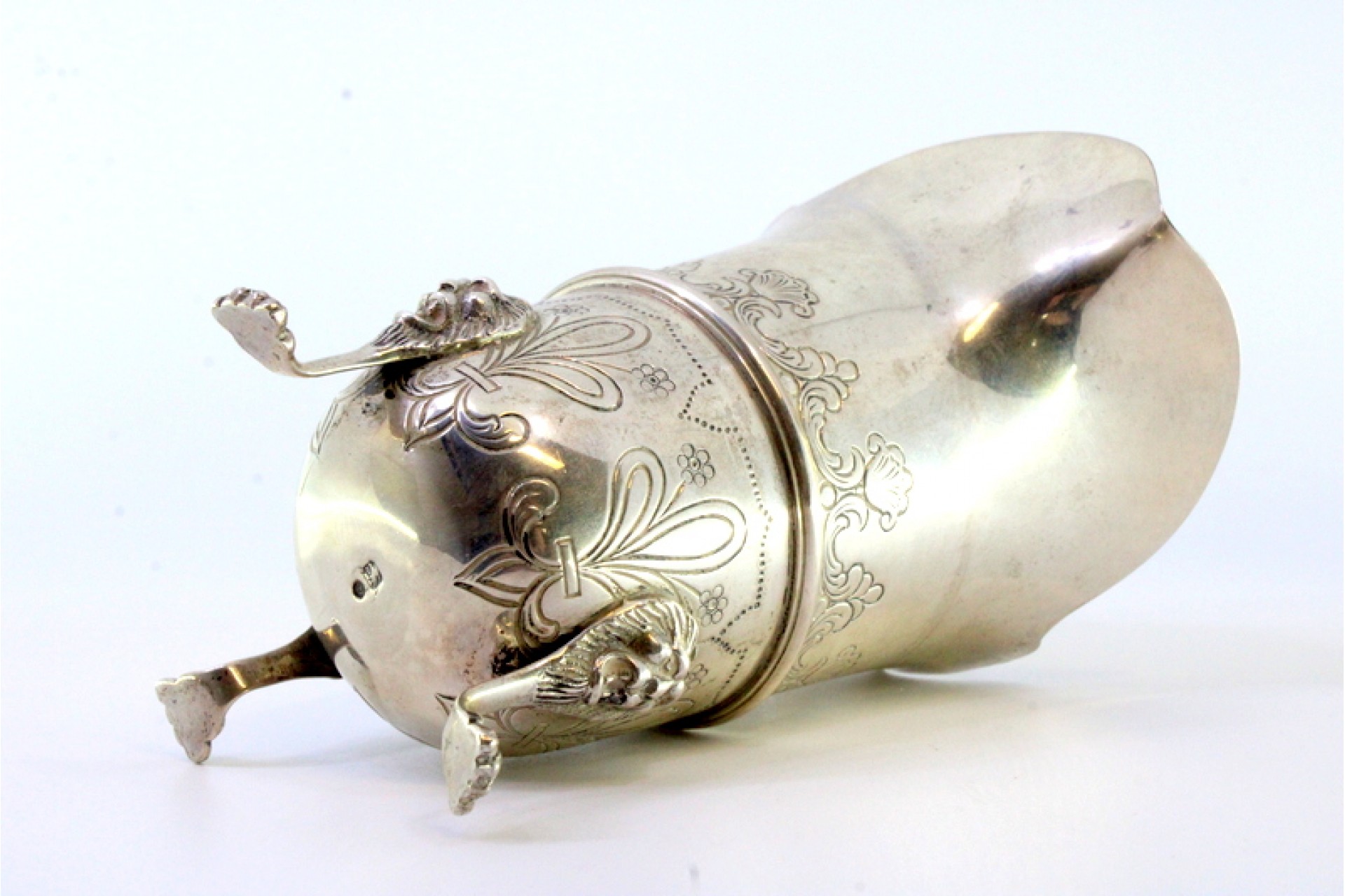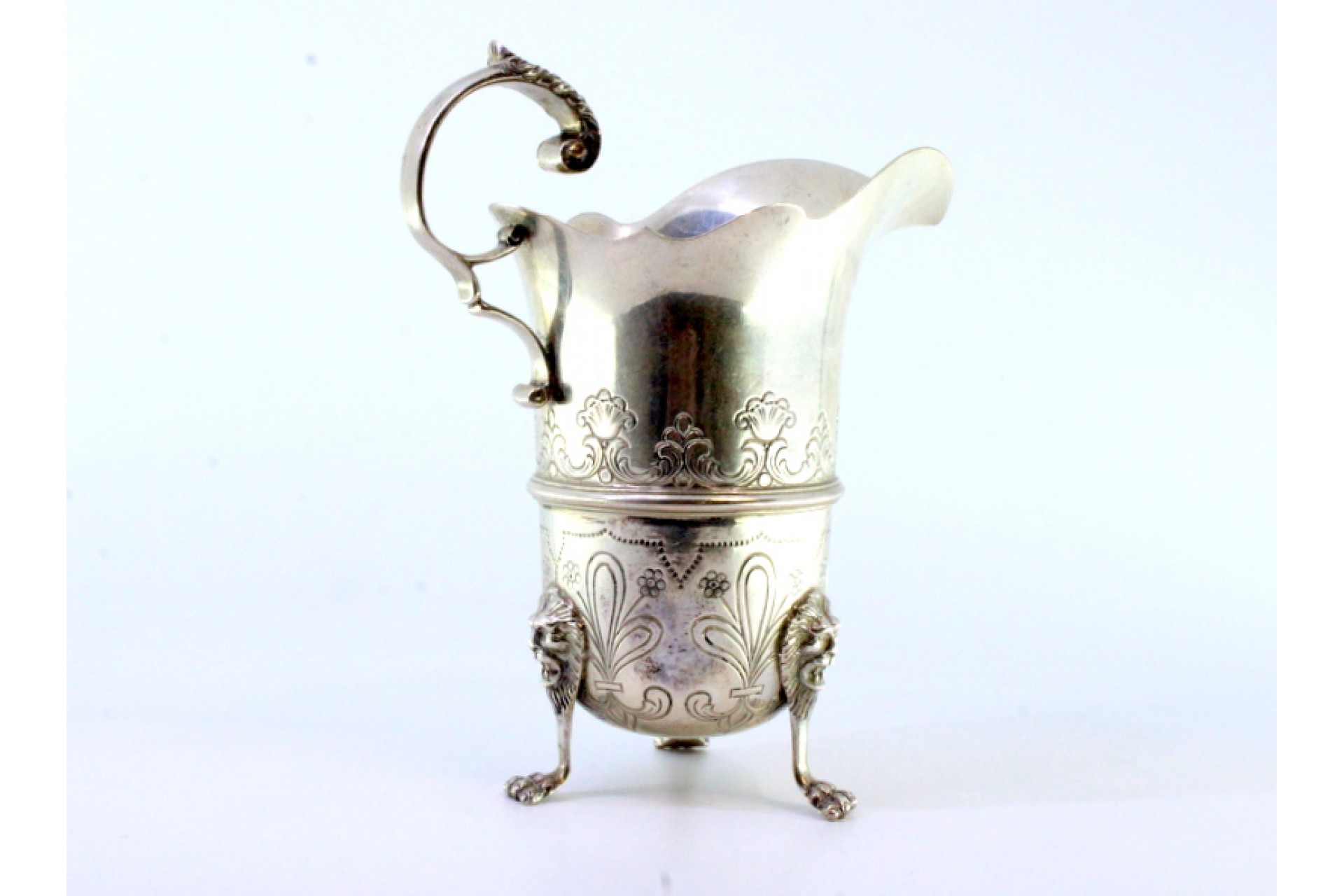 • Descrição: Cremeira em prata com motivos florais gravados, asa vazada em forma de folha de acanto e três pés alteados com cabeças de leões.