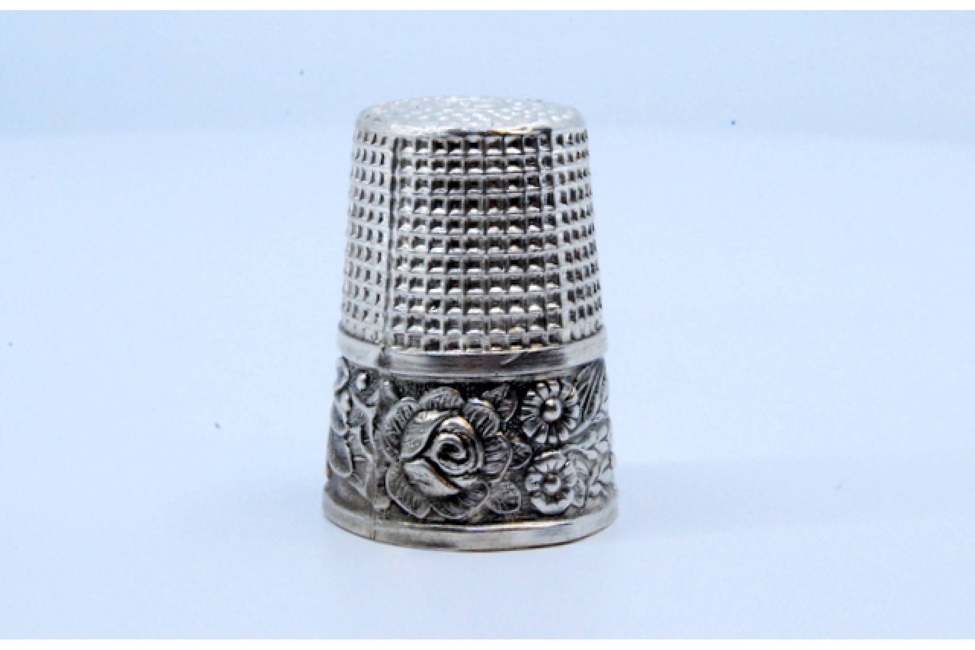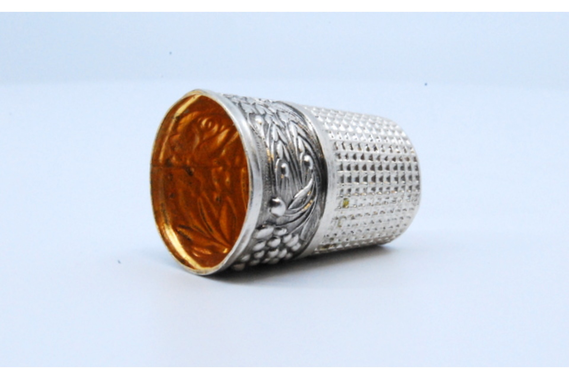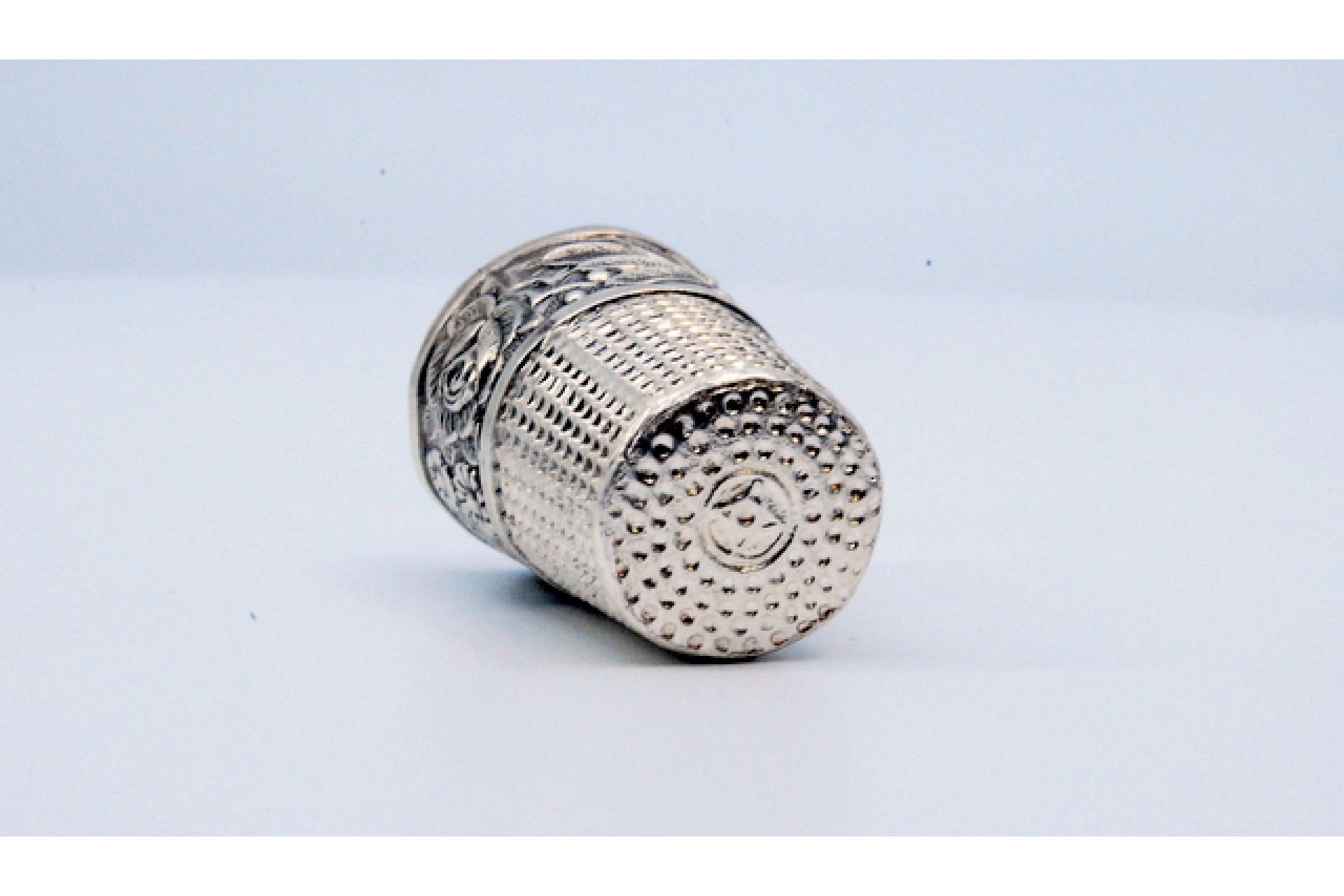 • Descrição: Dedal em prata com ramos e flores em relevo.