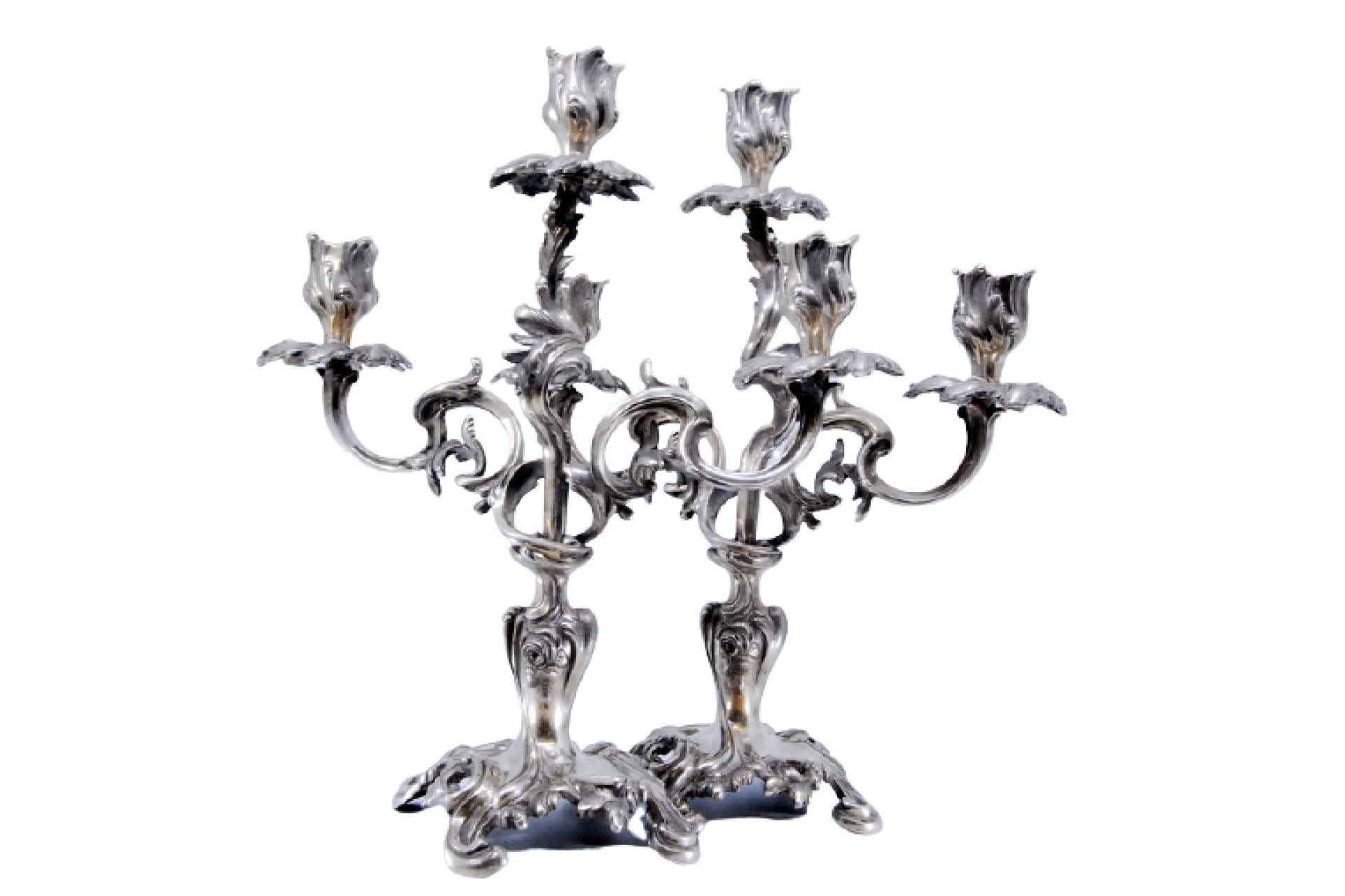 • Descrição: Candelabros em prata com três braços rameados e tulipas para as velas, apoiados em bases recortadas.