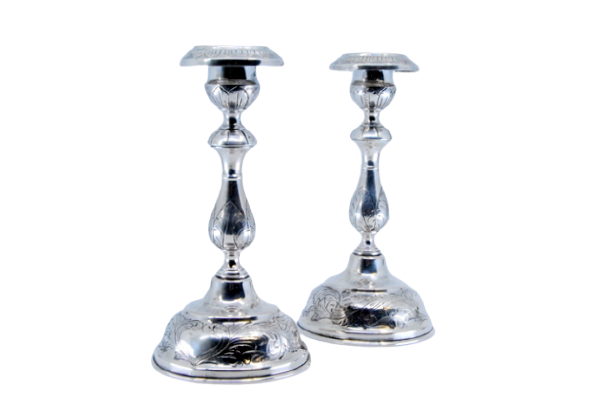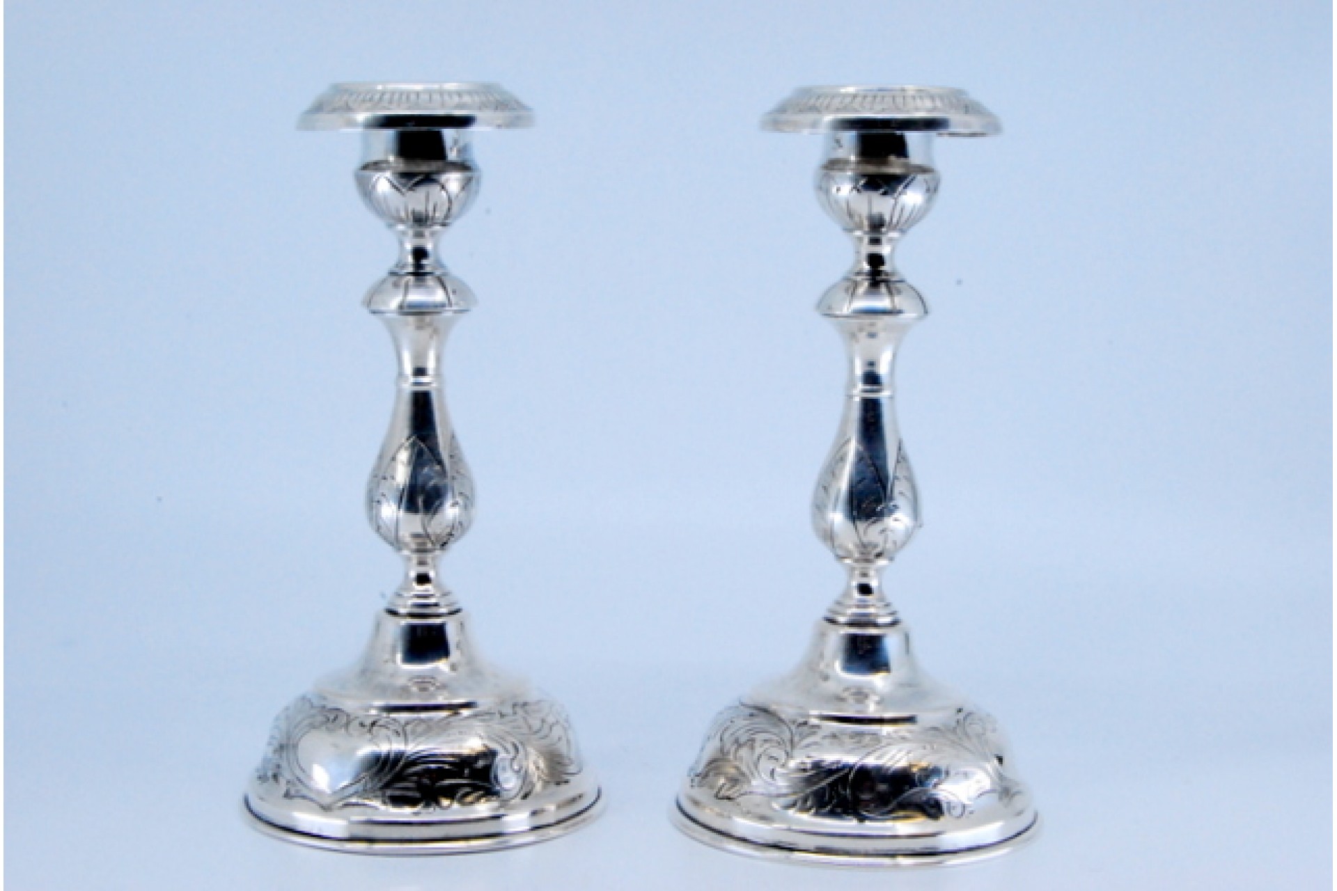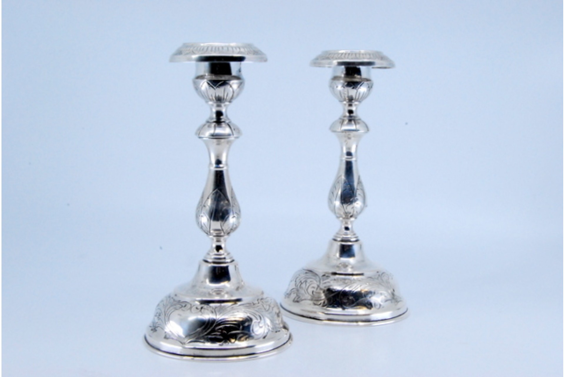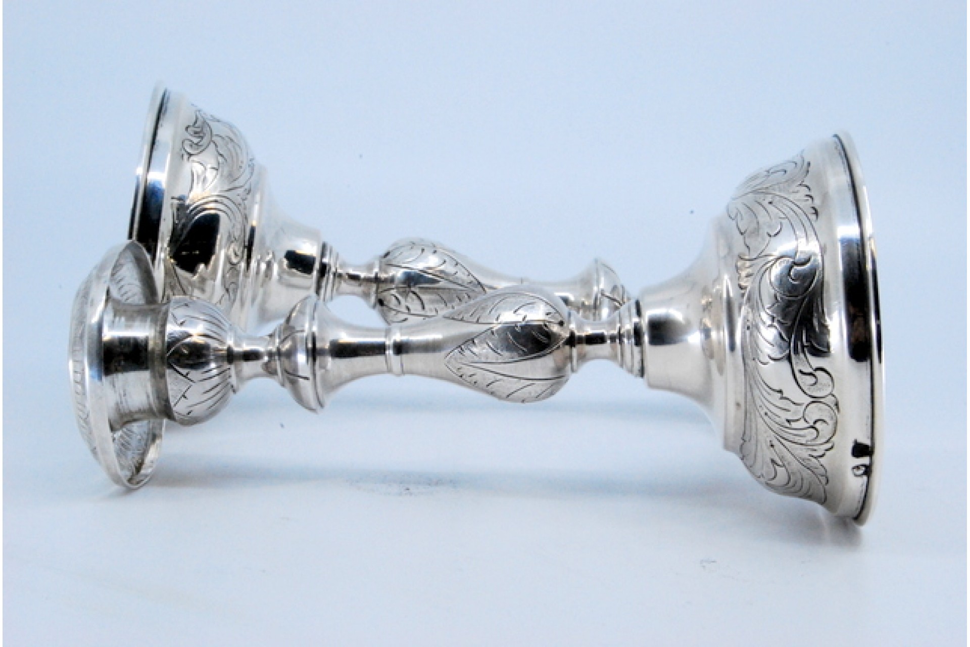 • Descrição: Castiçais em prata com motivos florais gravados nas arandelas, fustes e nas bases circulares.