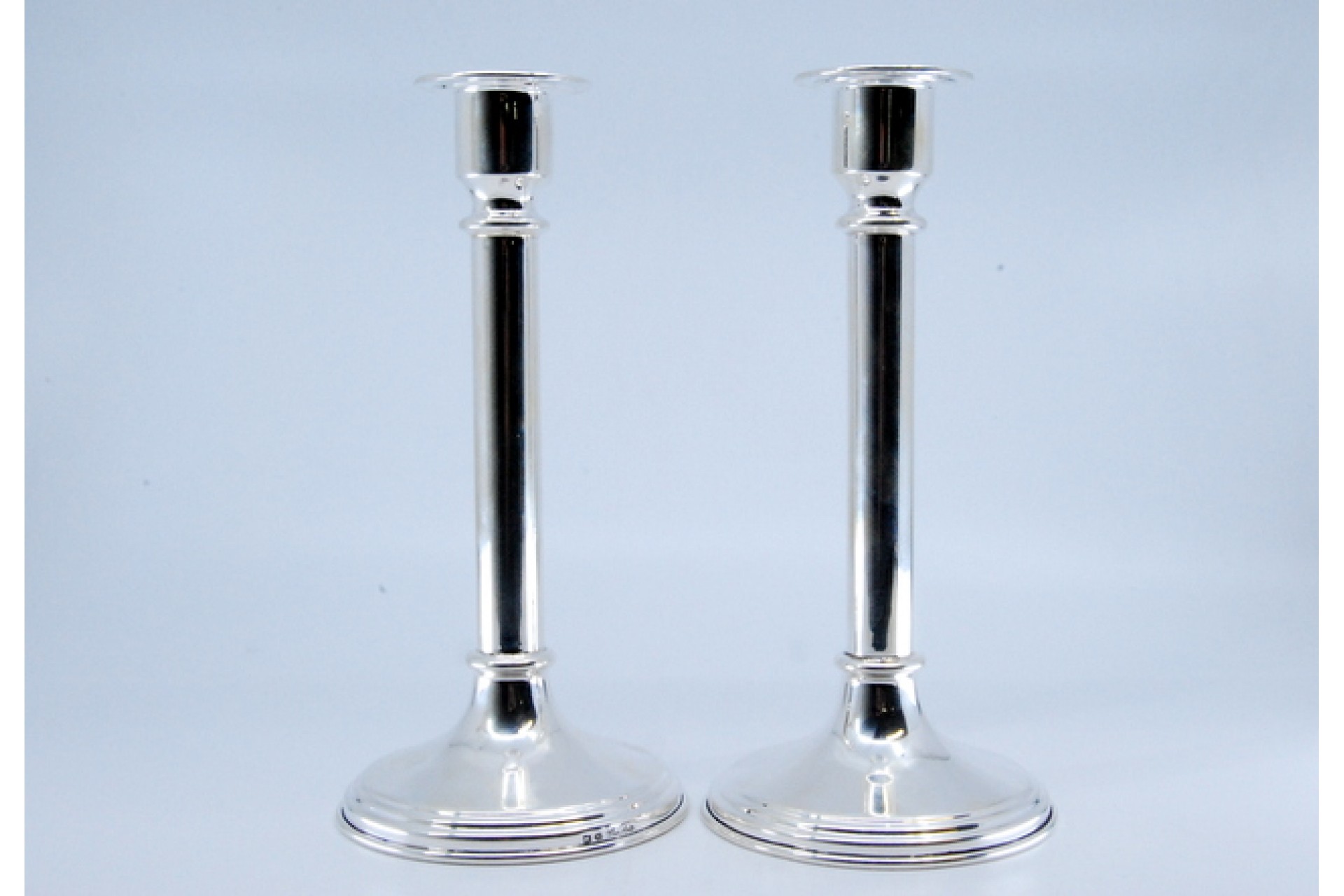 Castiçais altos em prata com fustes lisos e bases circulares.