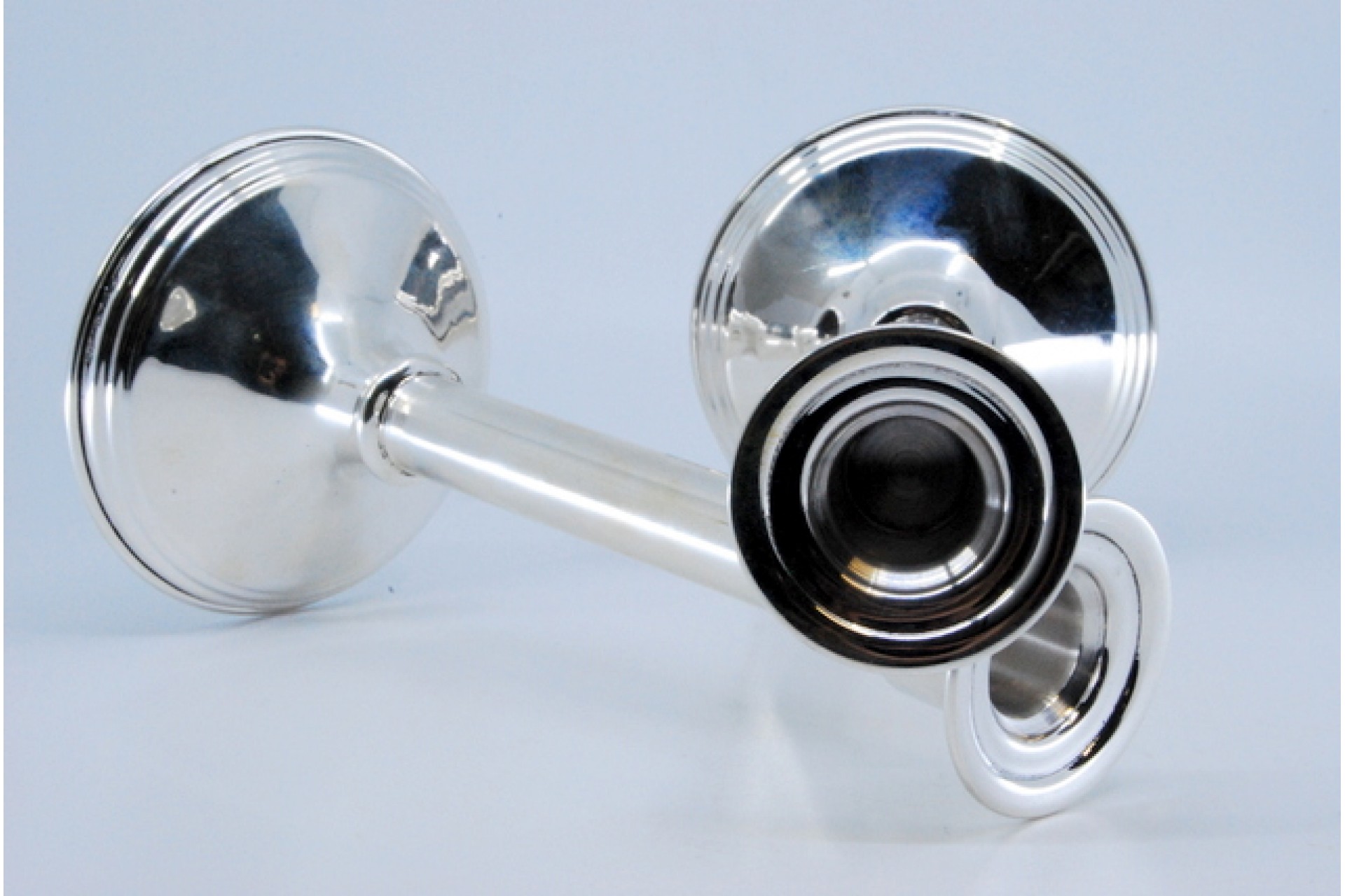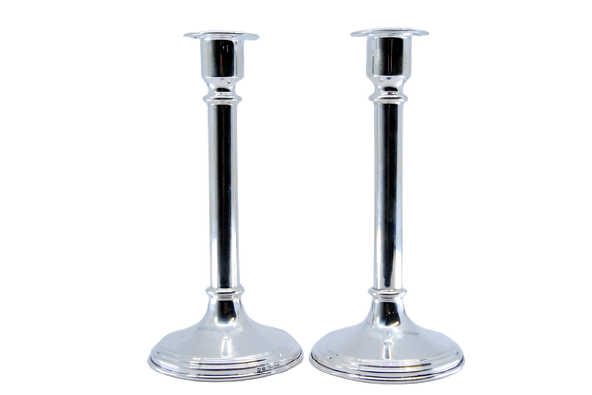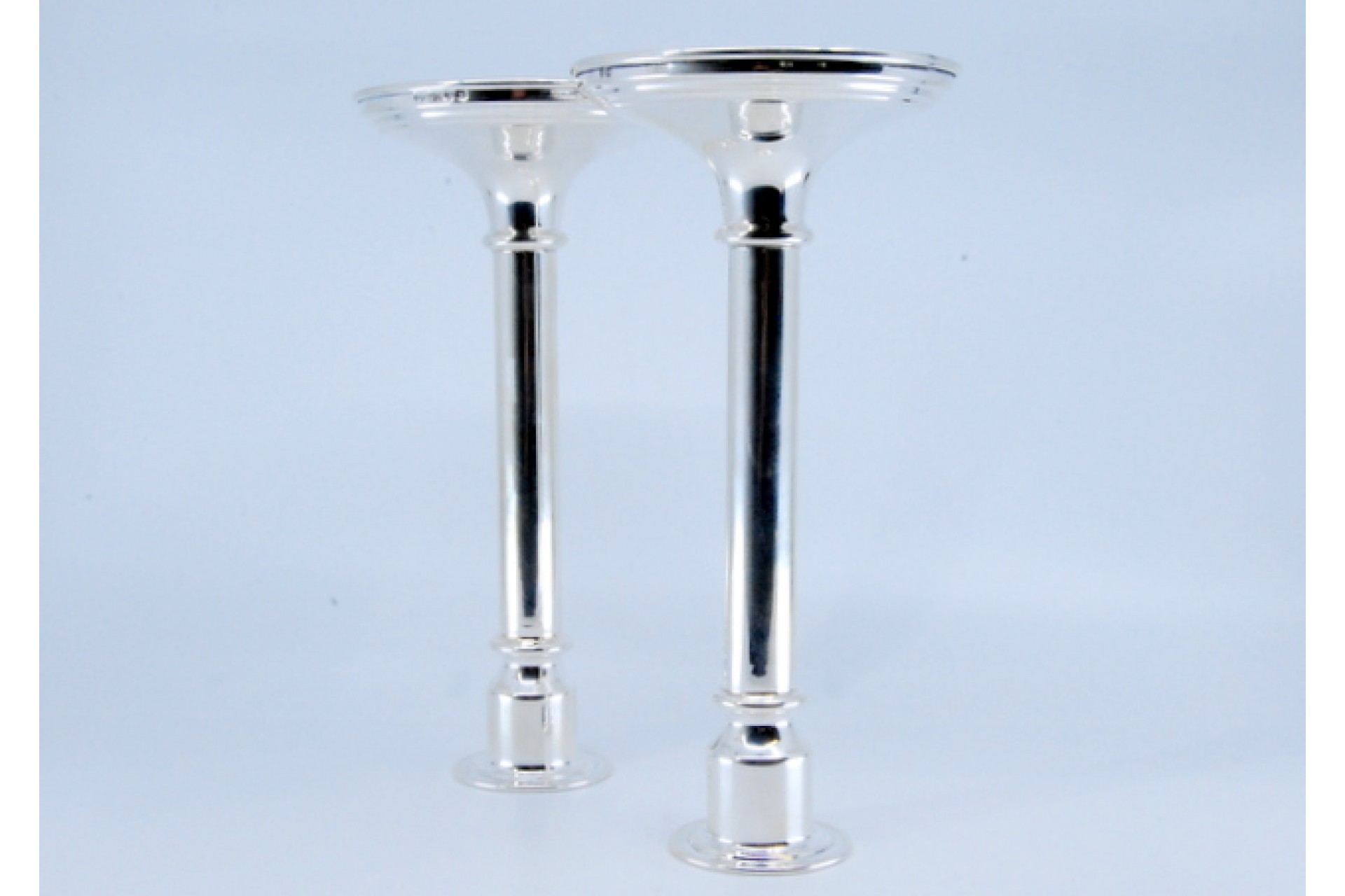 - Descrição: Castiçais altos em prata com fustes lisos e bases circulares.