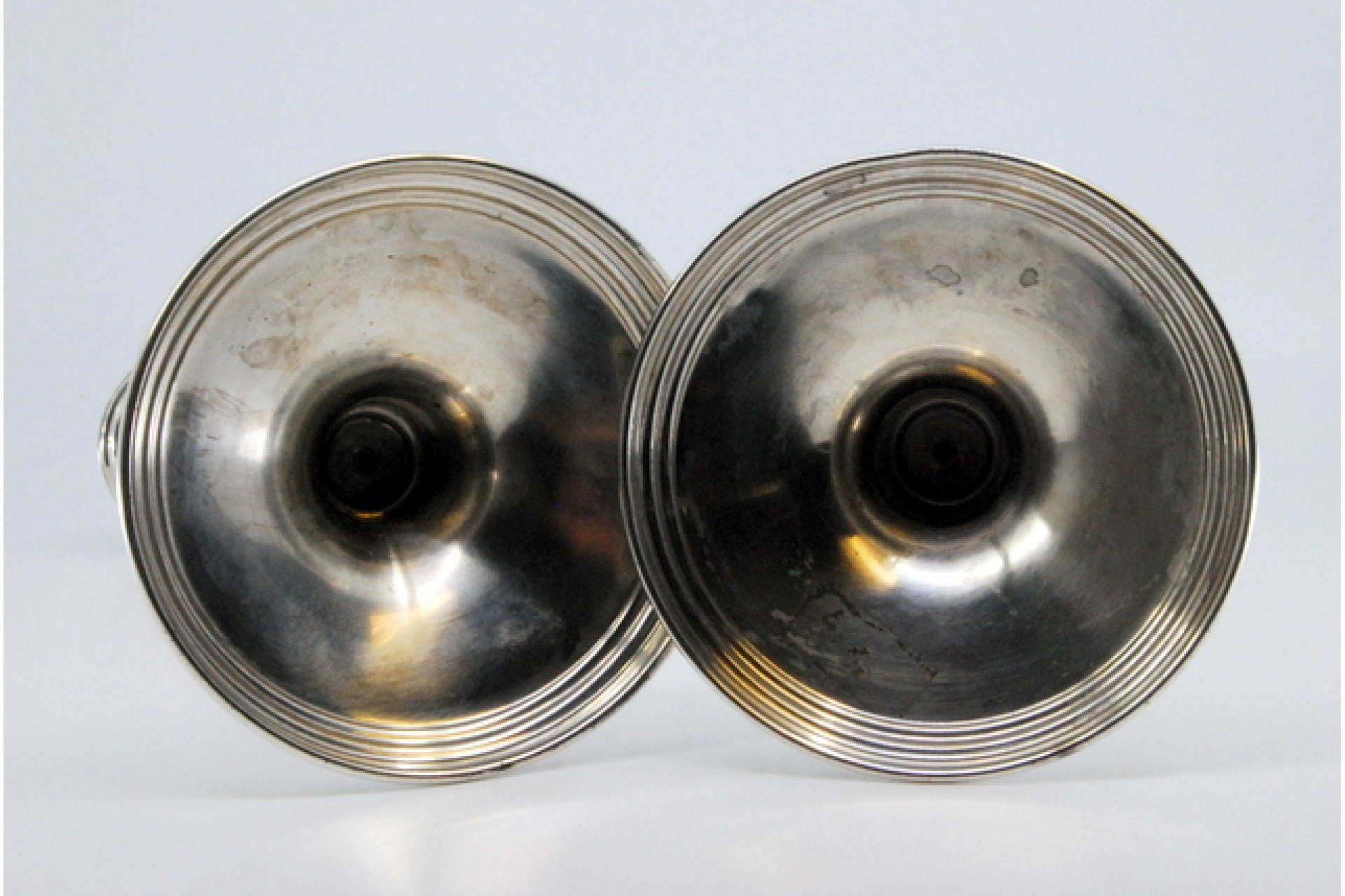 Castiçais baixos em prata com relevos canelados em bases circulares frisadas.