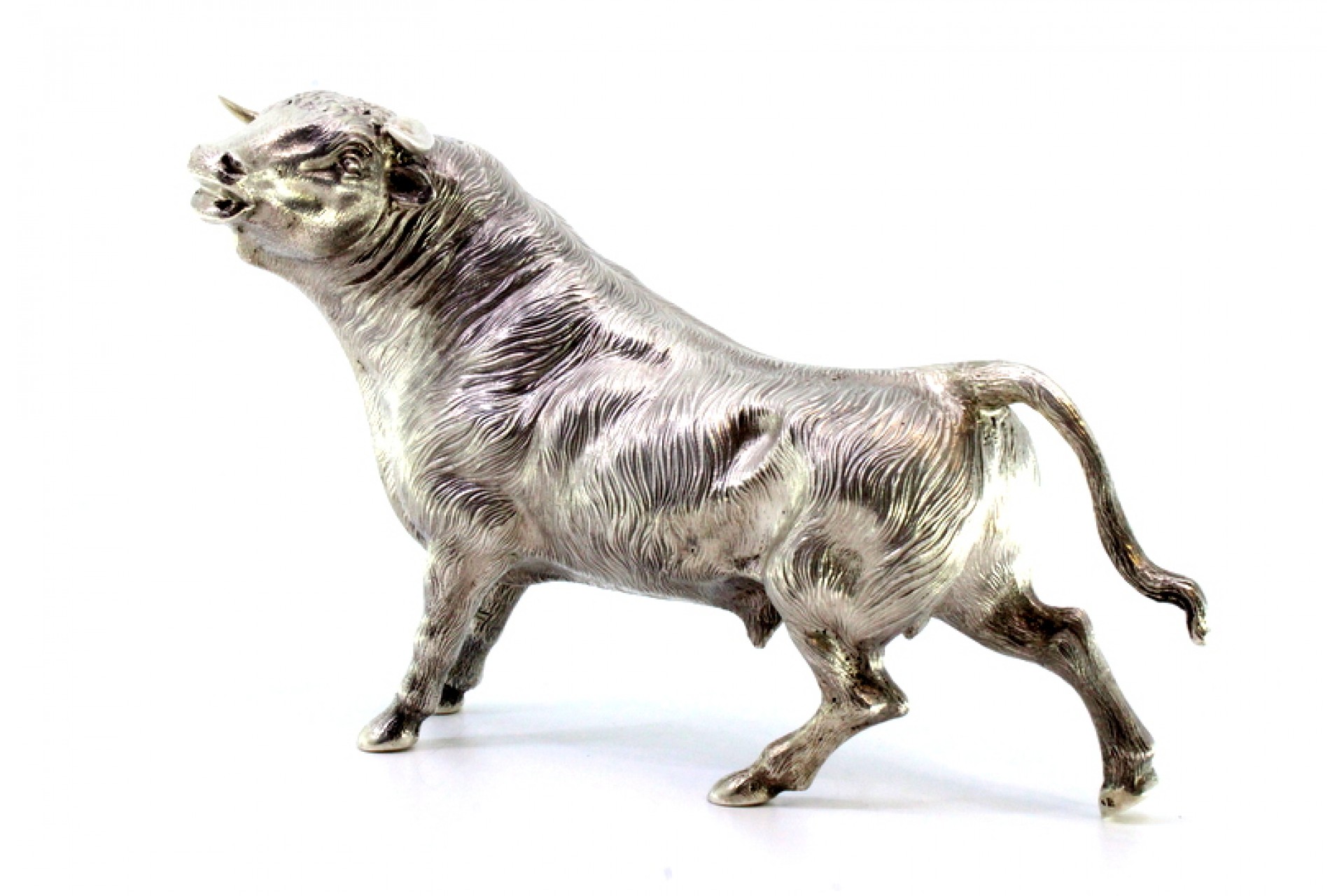 Escultura de touro em prata de vulto perfeito com relevos e aplicações.