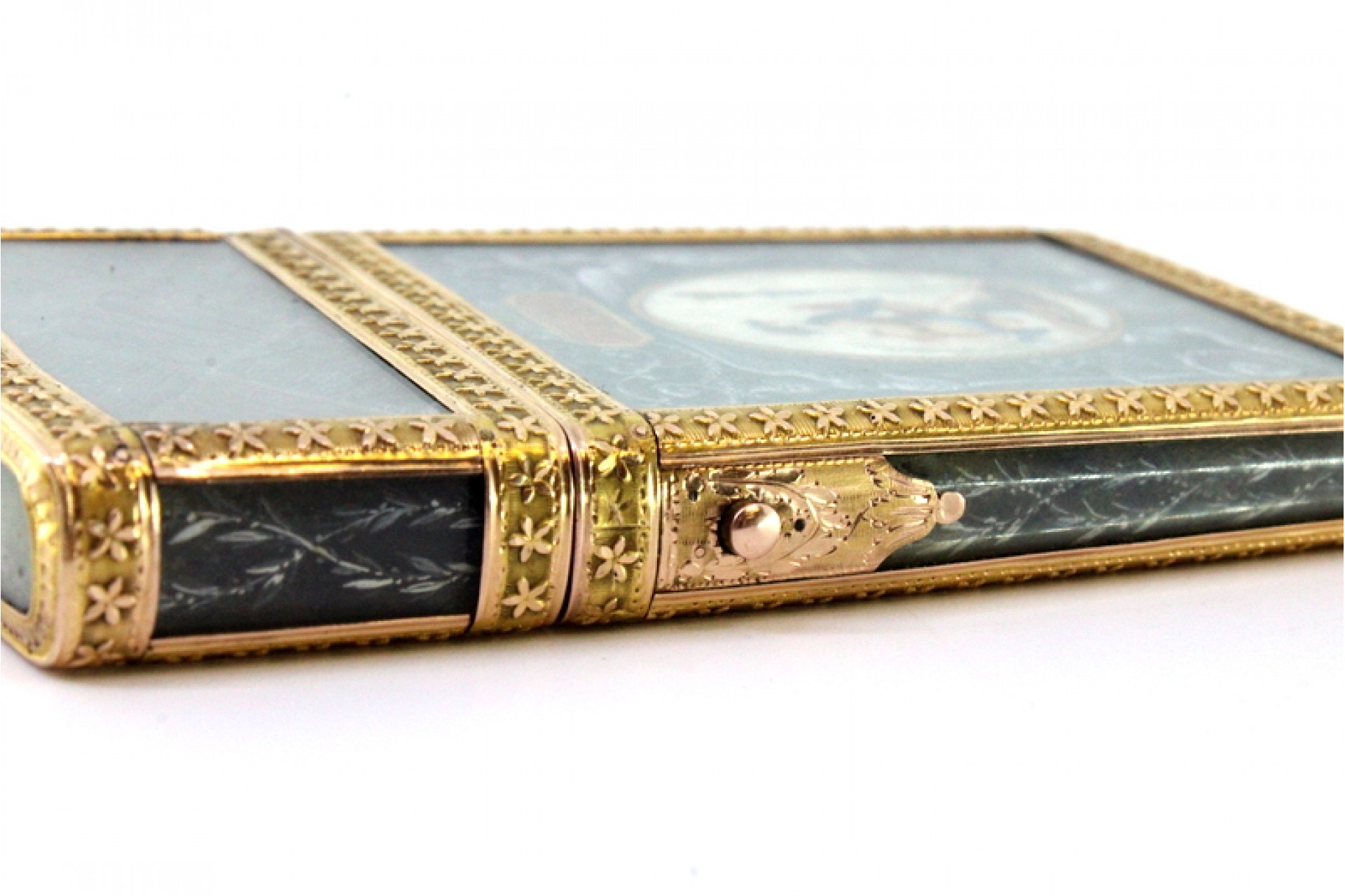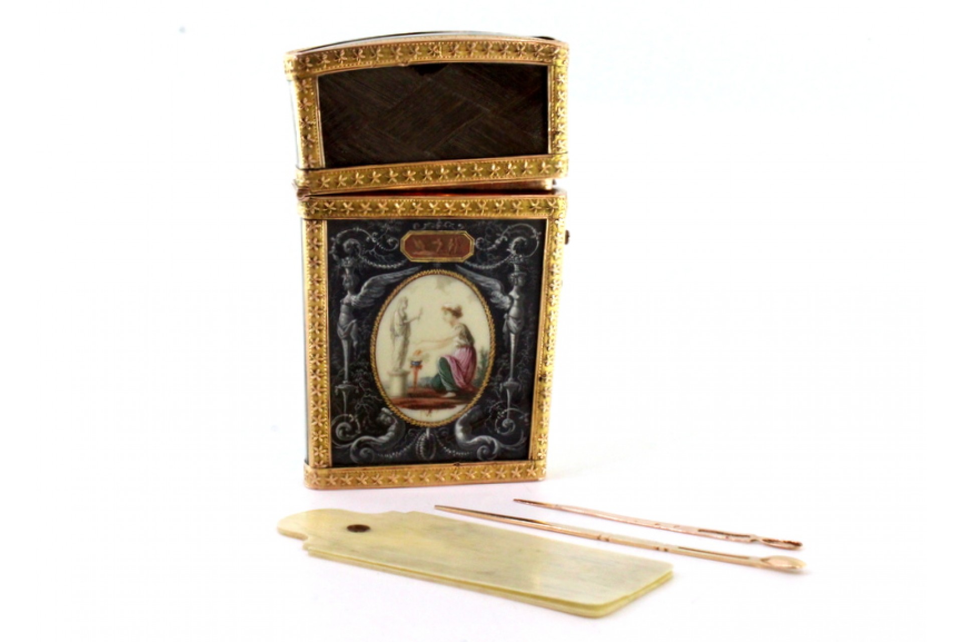 Estojo de utensílios em ouro com pintura de momentos religiosos sobre marfim