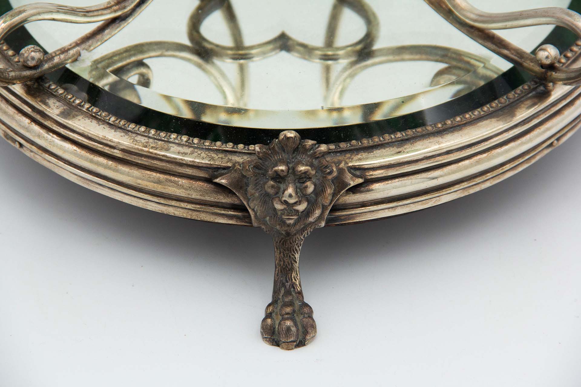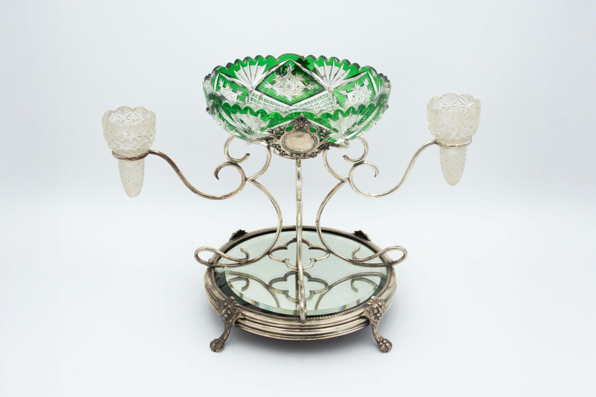 • Descrição: Floreira de vidro incolor e verde com estrutura em prata com enrolamentos, copos para flores e base em espelho envolvido por perlados e mascarões, com pés em forma de garras.