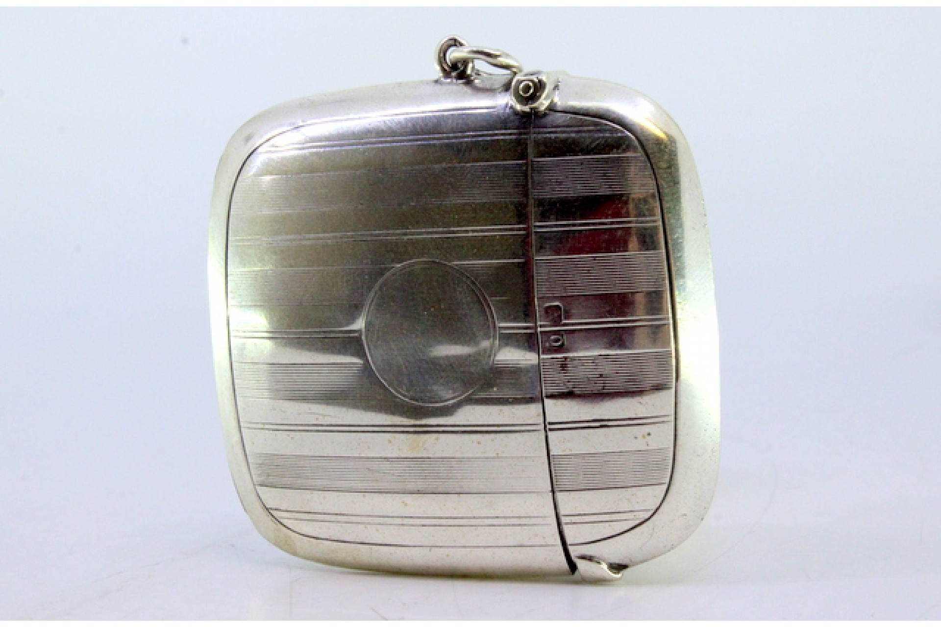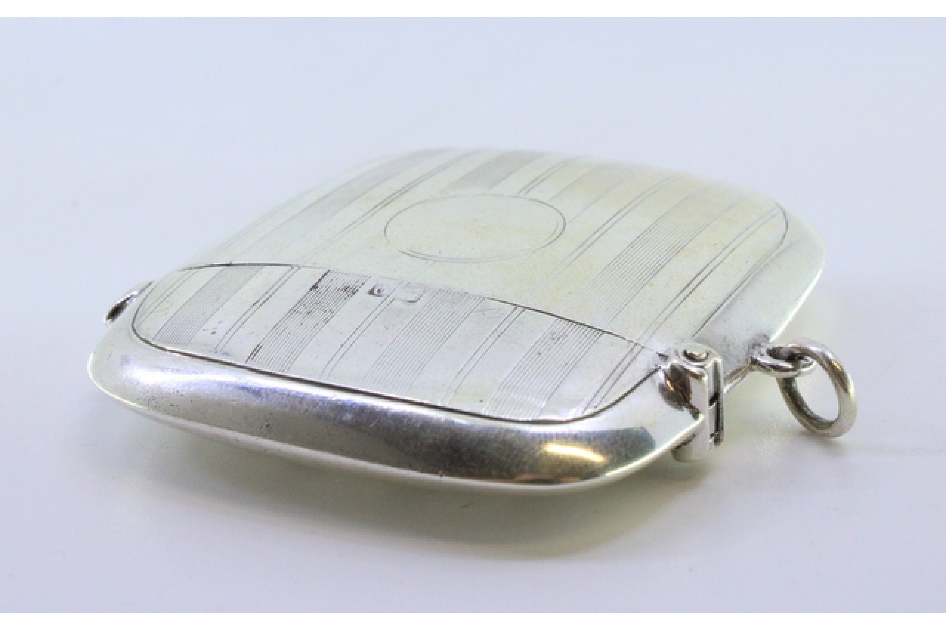 • Descrição: Fosforeira em prata guilhochada com bandas ao alto envolvendo cartela para monograma e tampa basculante.