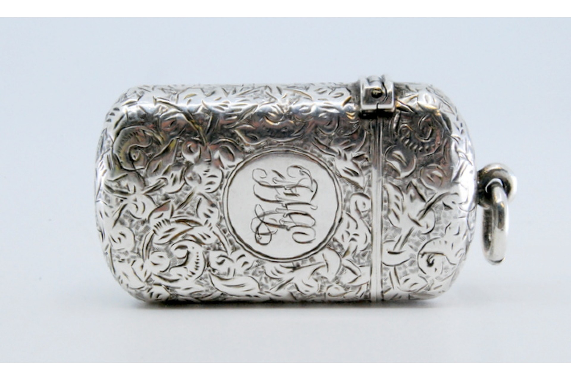 • Descrição: Fosforeira em prata com motivos vegetalistas gravados envolvendo cartela para monograma e tampa basculante.
