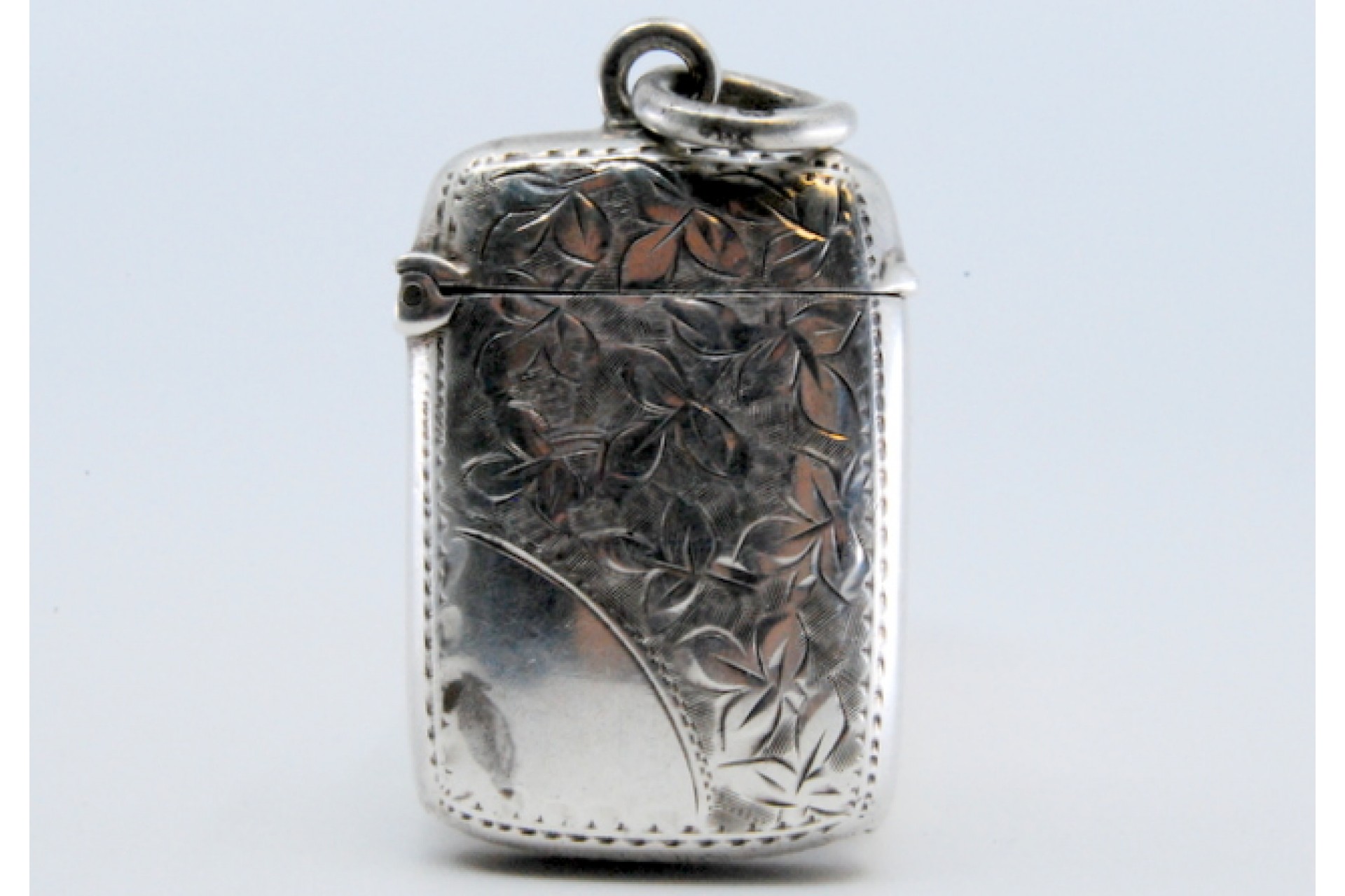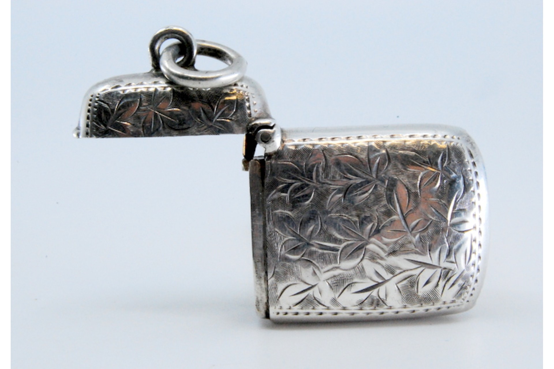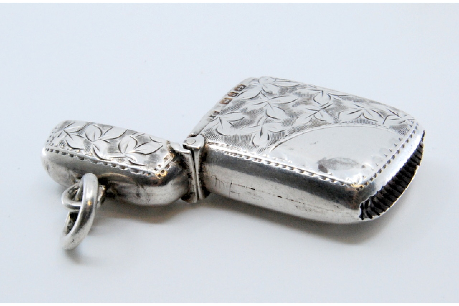 • Descrição: Fosforeira em prata com motivos vegetalistas gravados envolvendo cartela para monograma e tampa basculante.