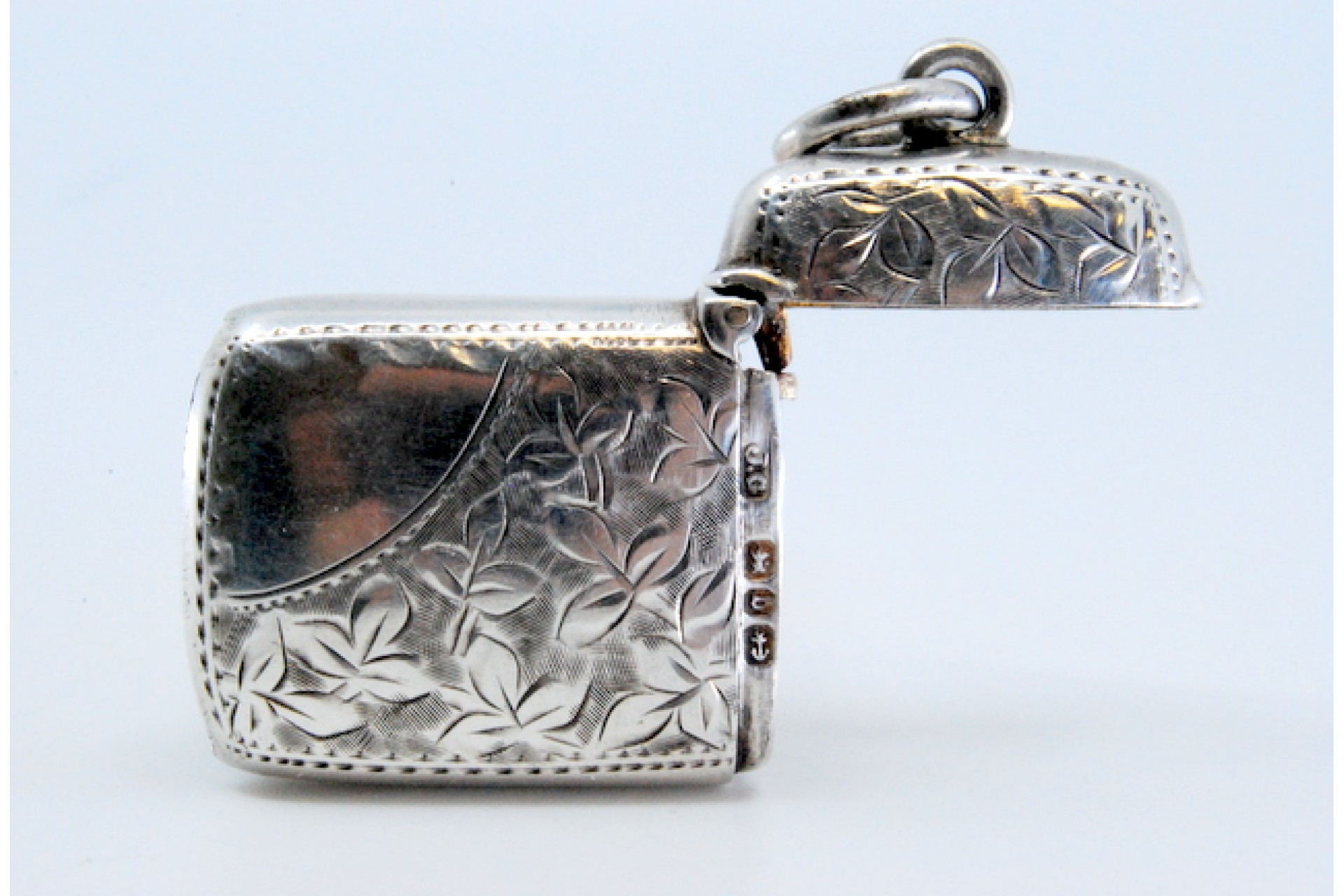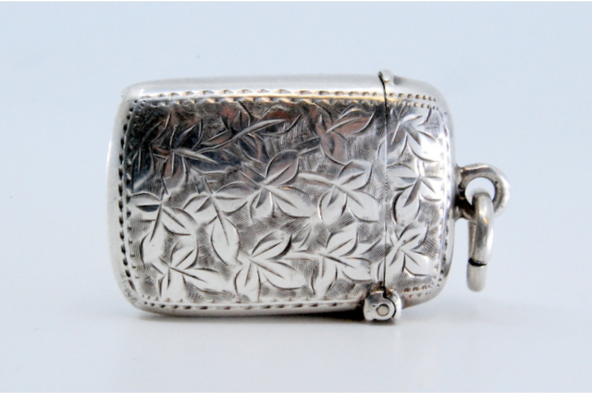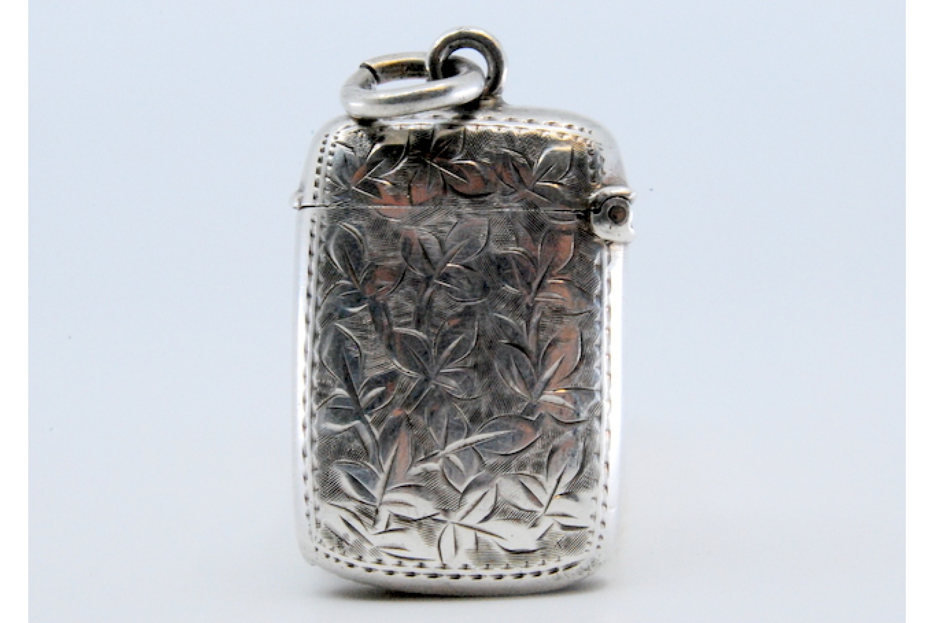 • Descrição: Fosforeira em prata com motivos vegetalistas gravados envolvendo cartela para monograma e tampa basculante.