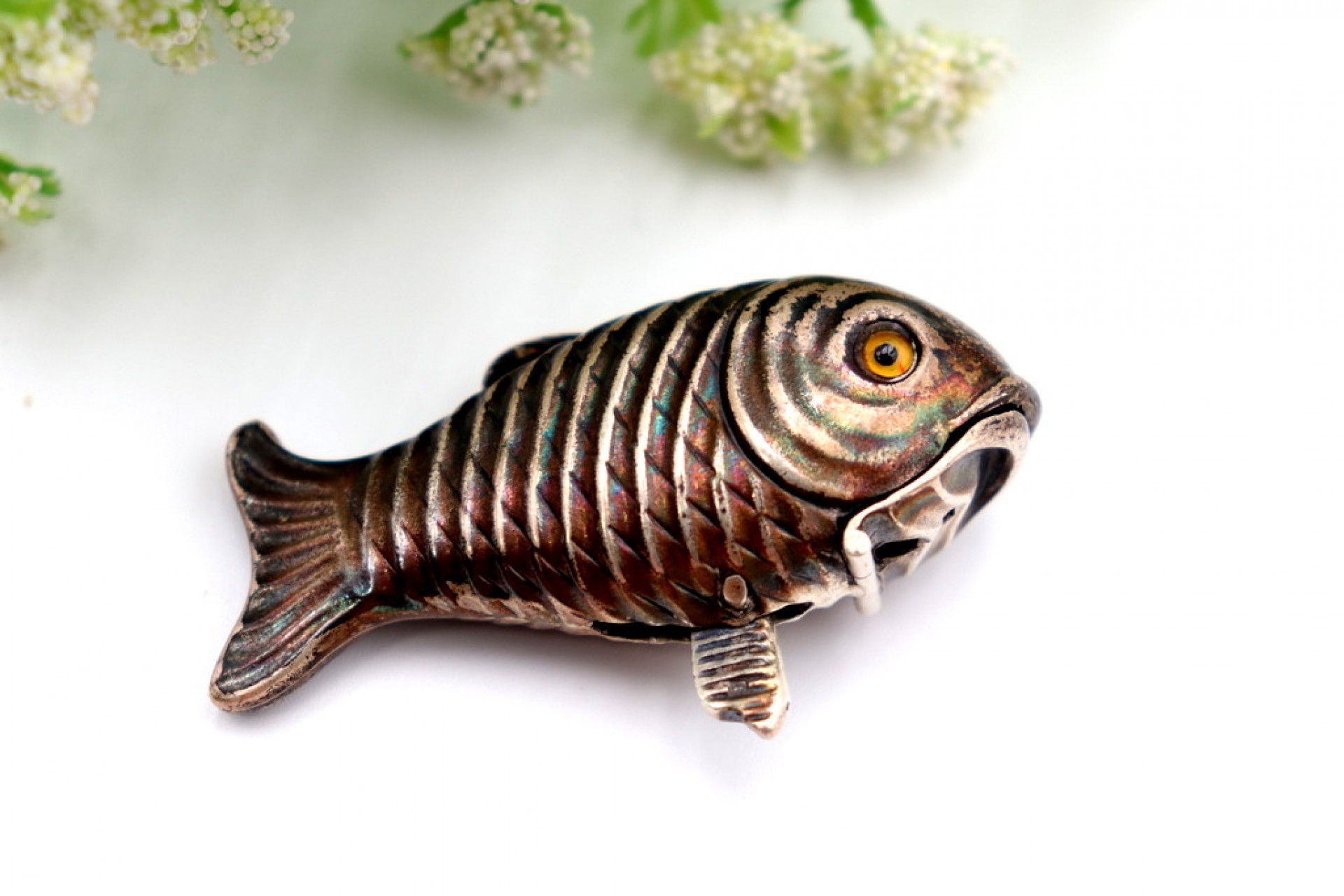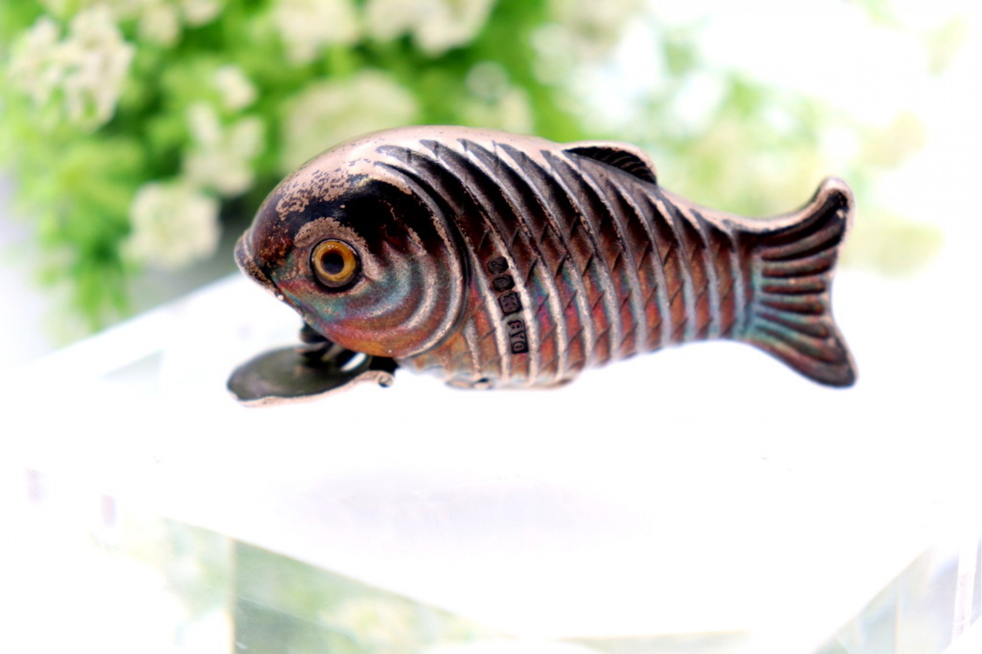 • Descrição: Fosforeira em prata em forma de peixe com relevos e sistema de abertura.