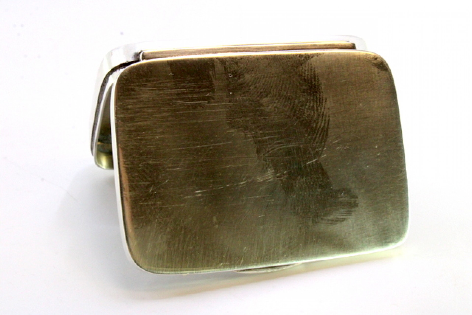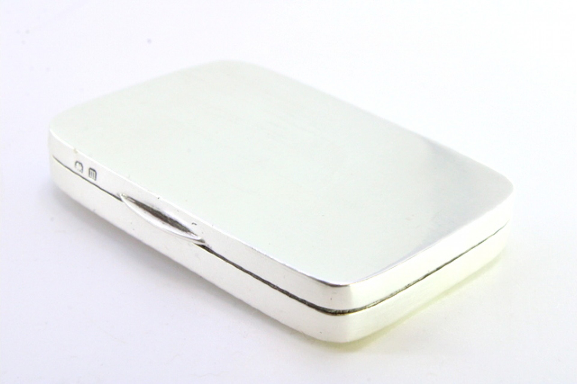 • Descrição: Fosforeira em prata lisa com aplicação para abrir e tampa basculante.