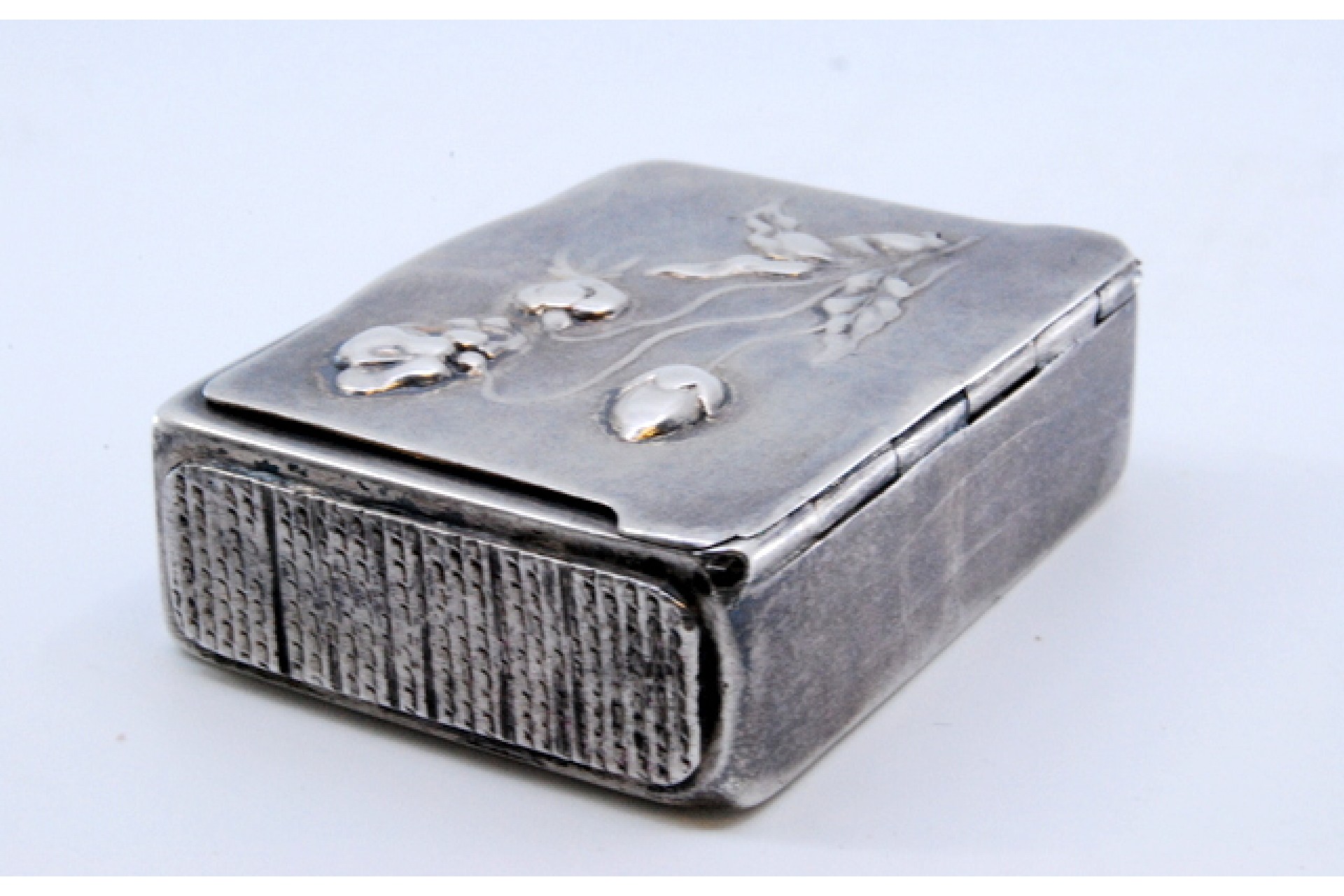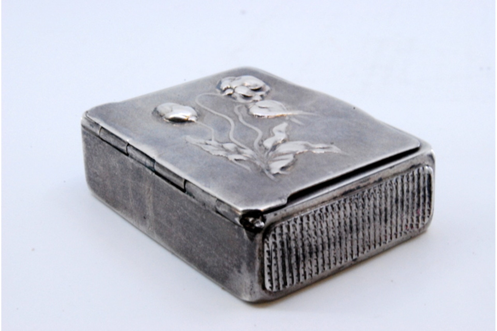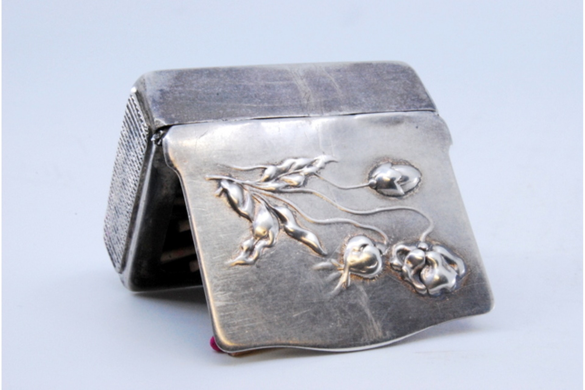 Fosforeira em prata ao estilo Arte Nova com flores na tampa.