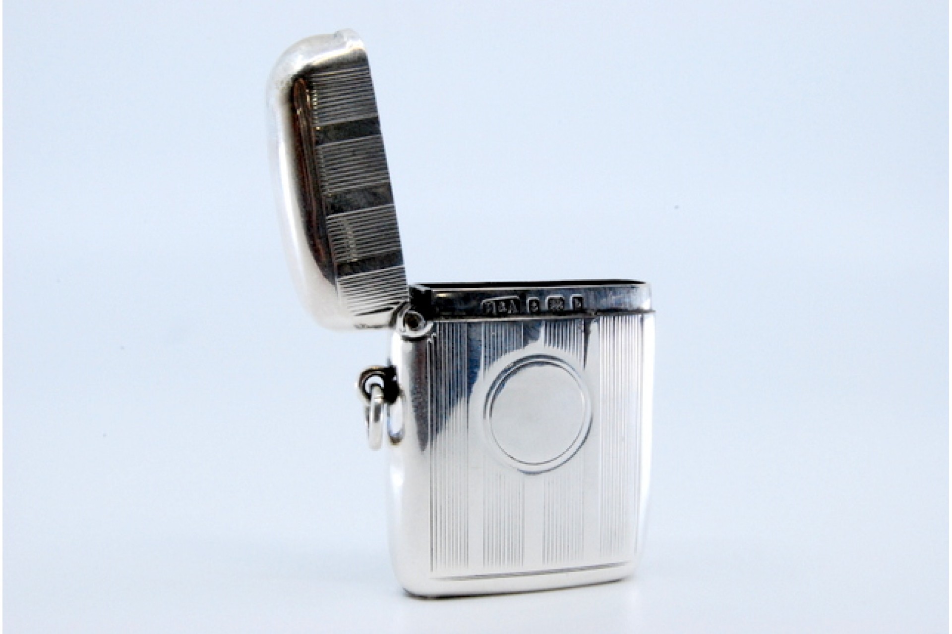 Fosforeira em prata com bandas ao alto em relevo e tampa basculante.
