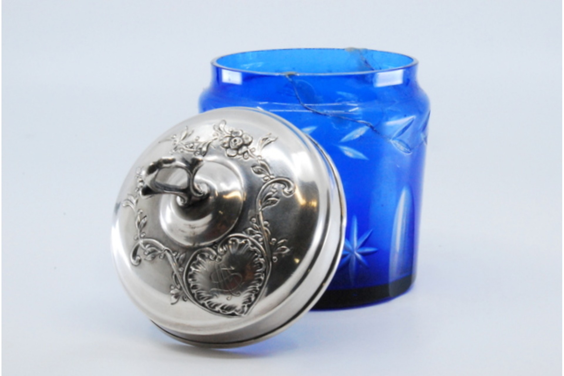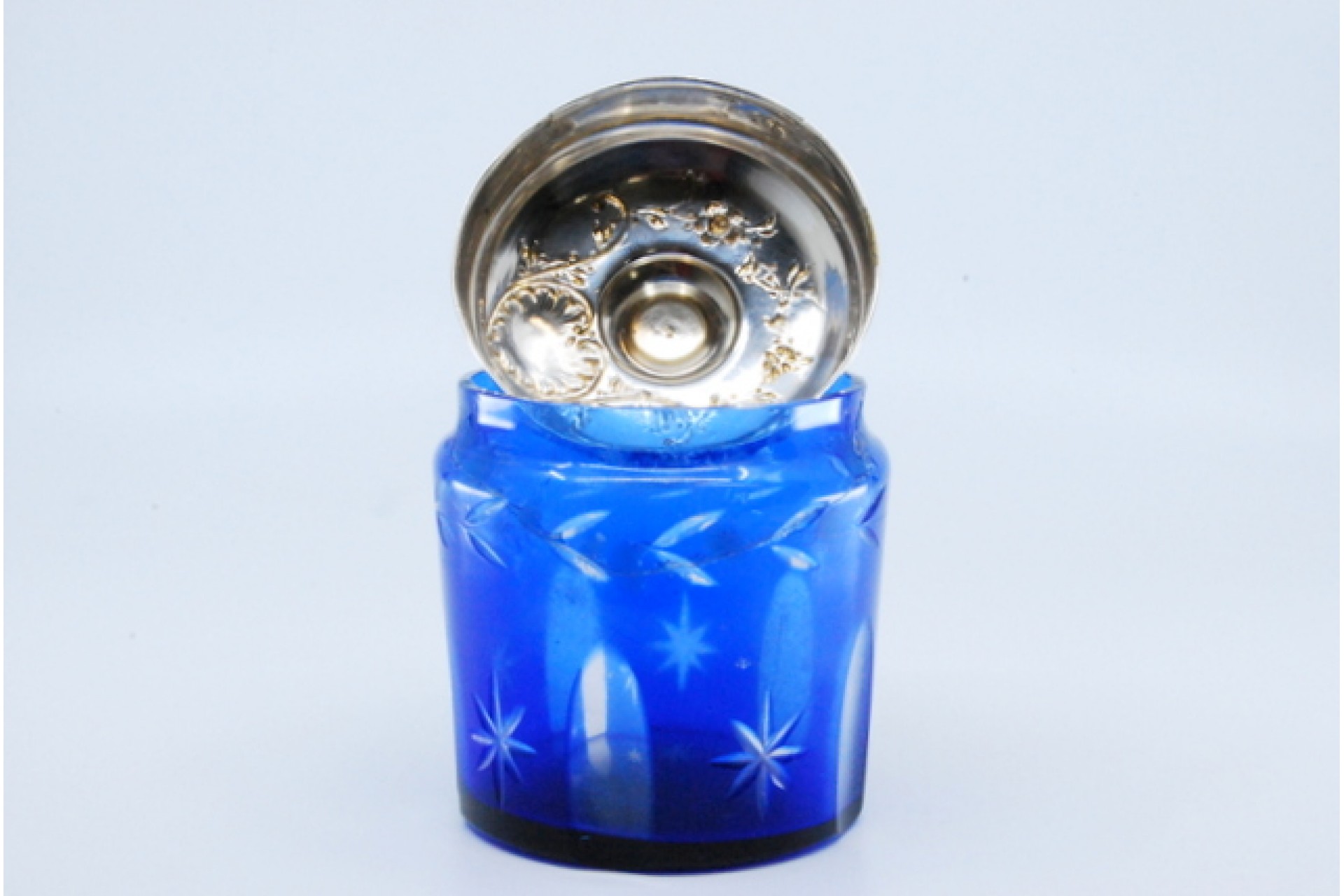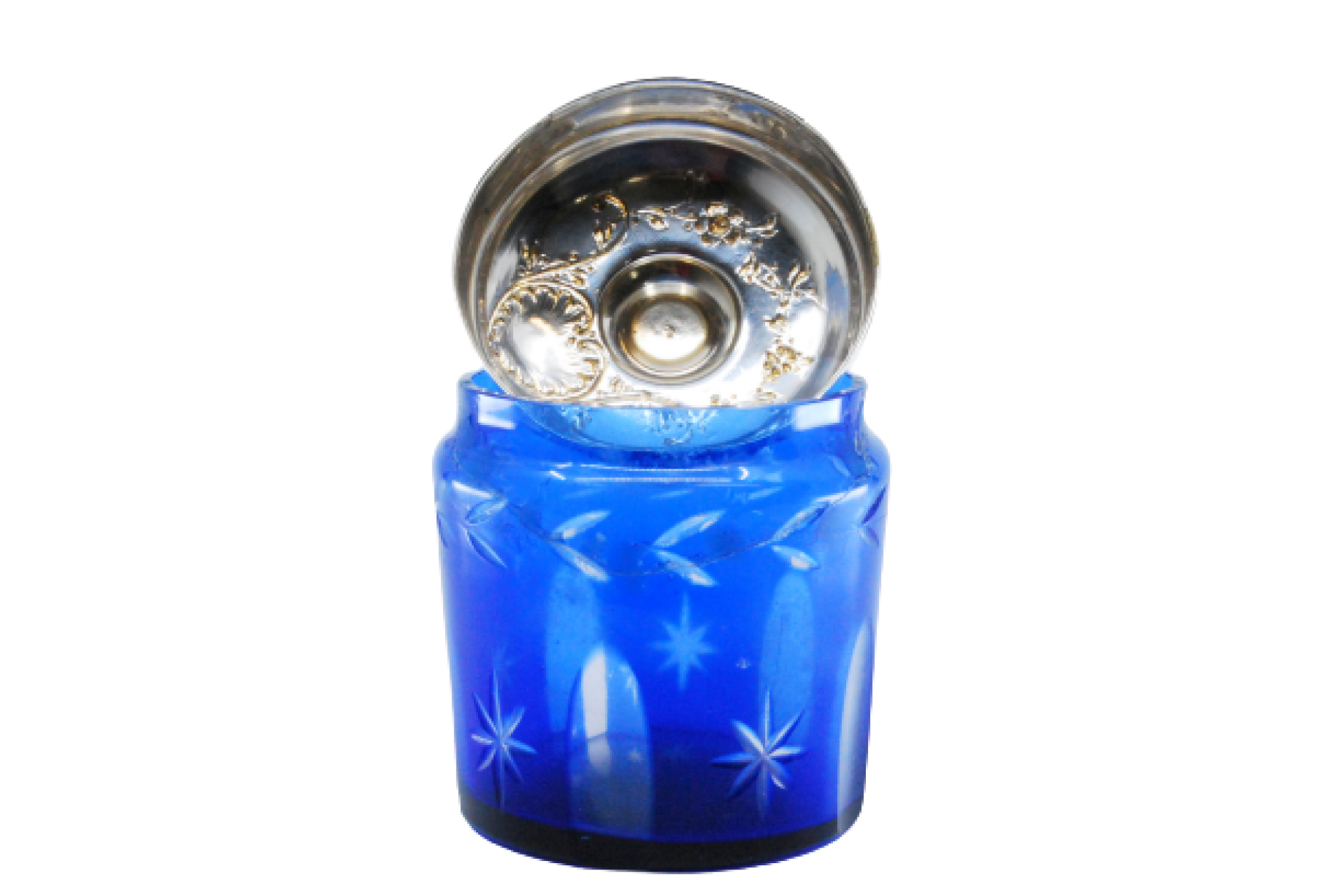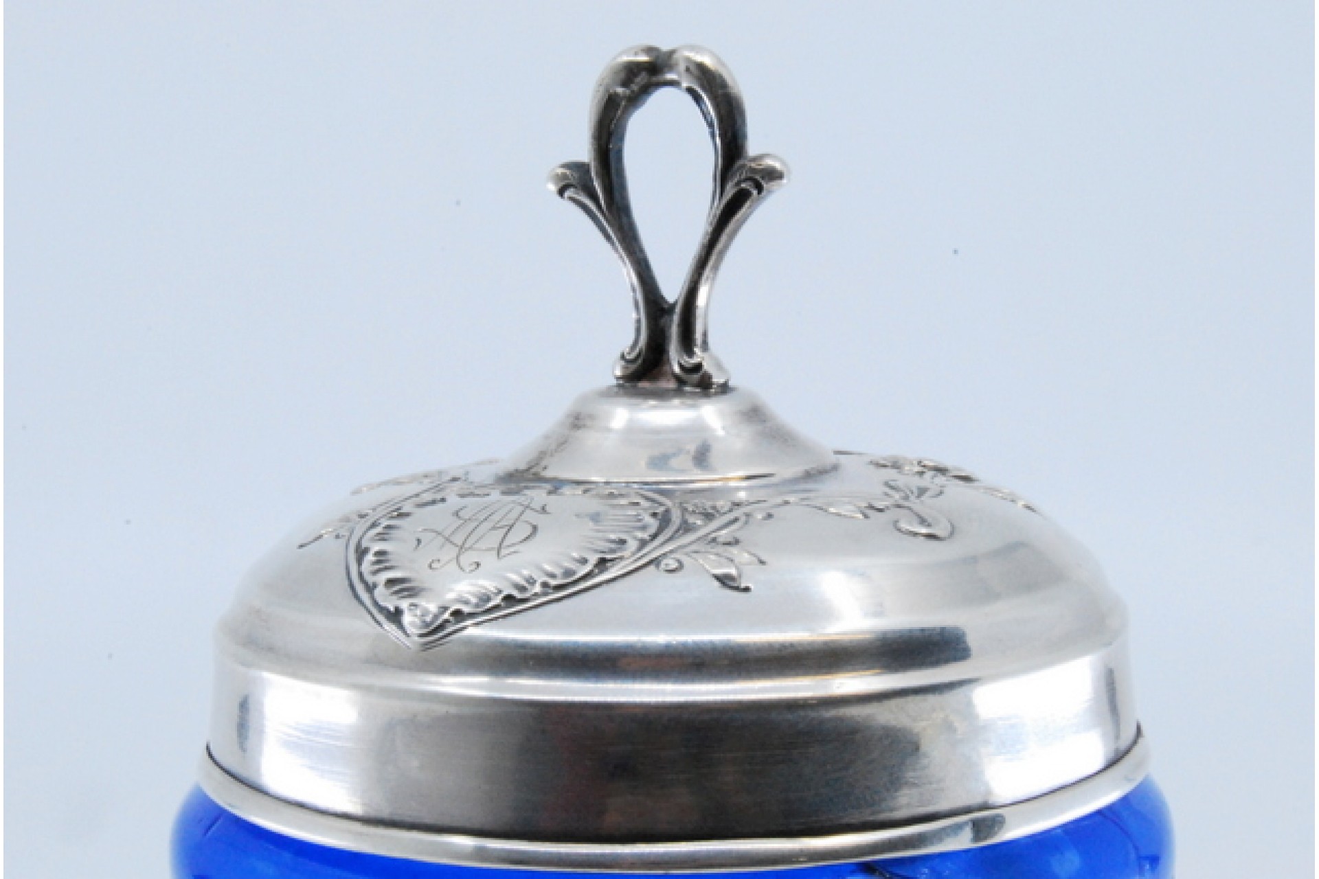 Frasco em vidro azul para compota com gravados e tampa em prata com motivos florais.