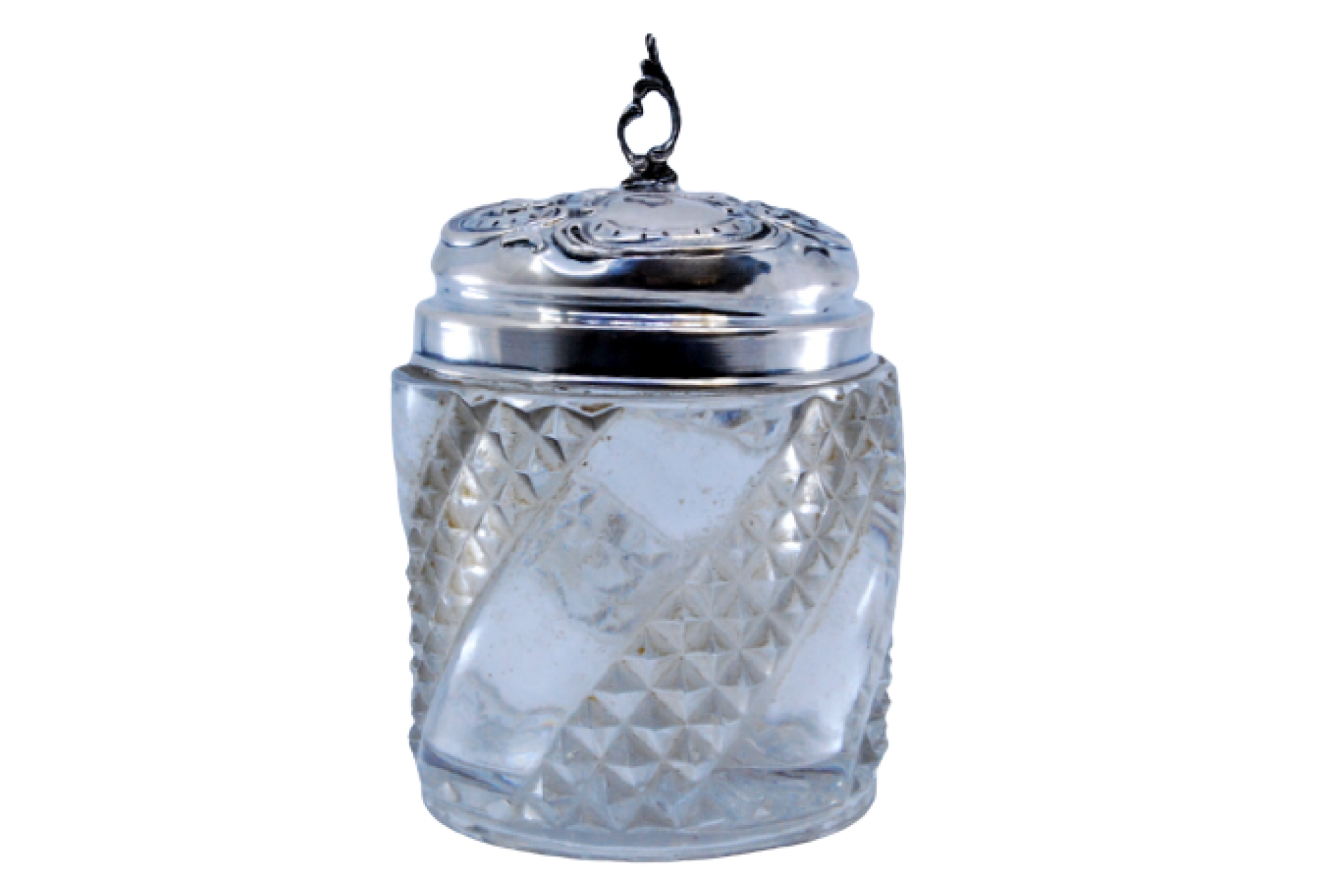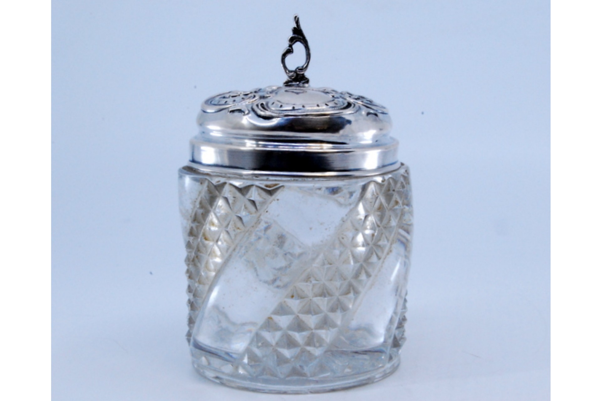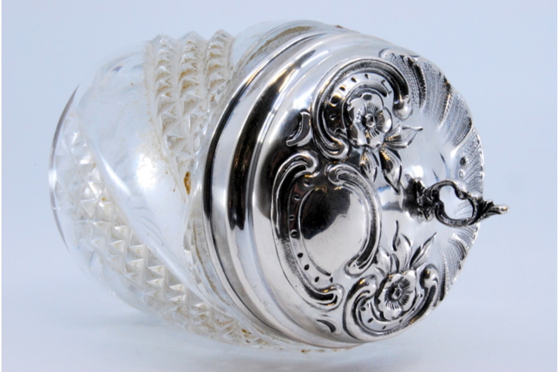 Frasco em vidro com tampa em prata com relevos e pomo na tampa.