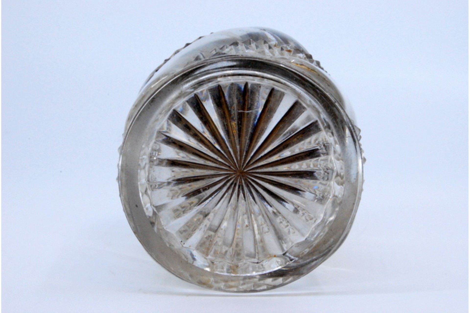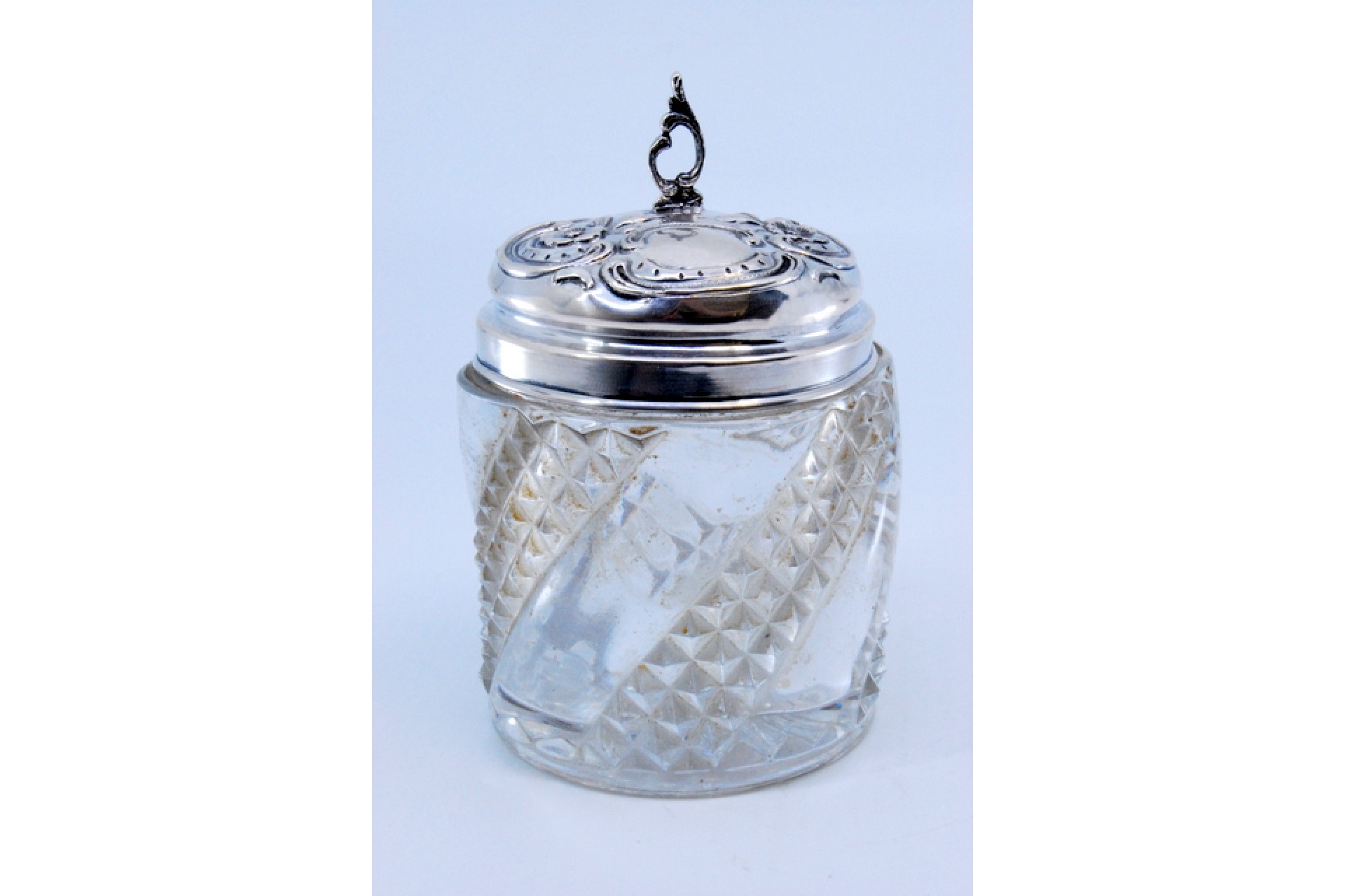 • Descrição: Frasco em vidro com tampa em prata com relevos e pomo na tampa.