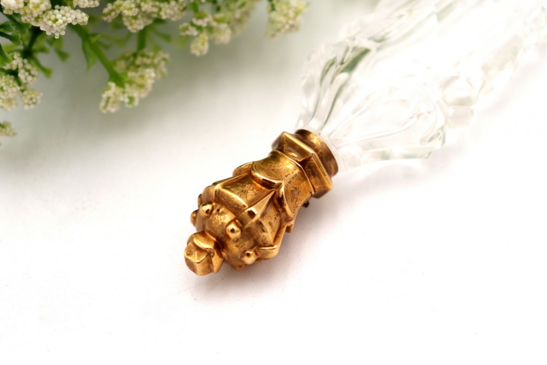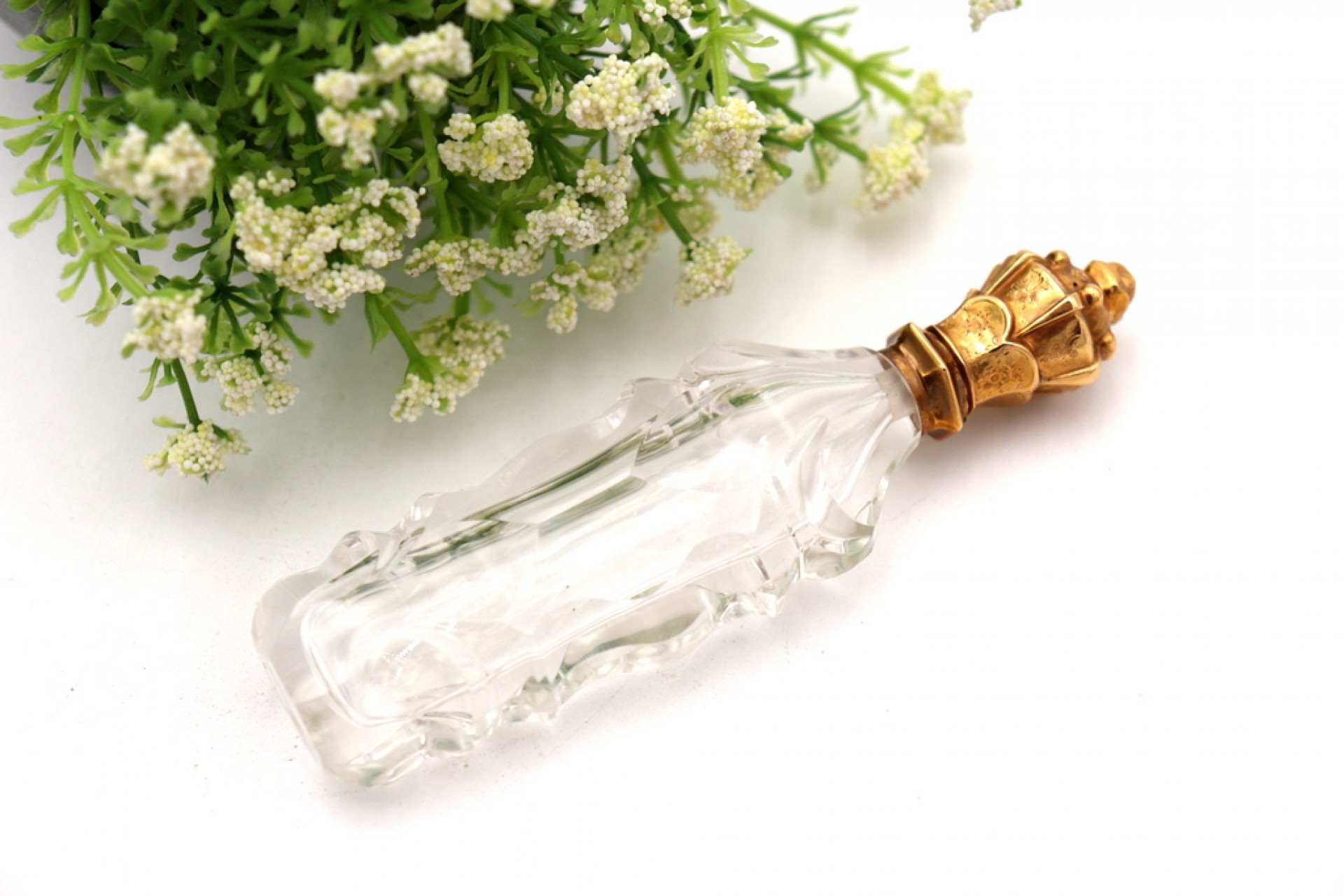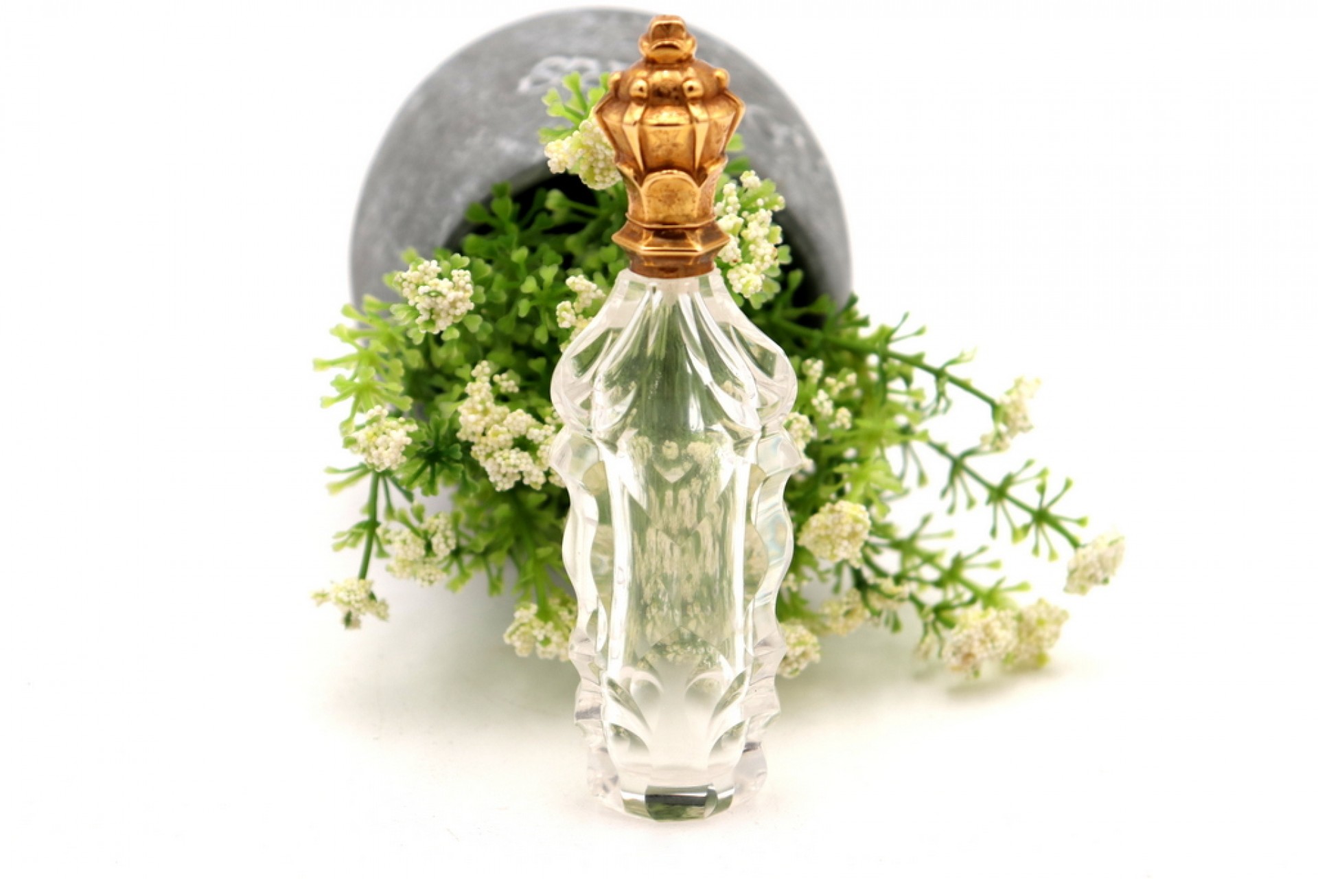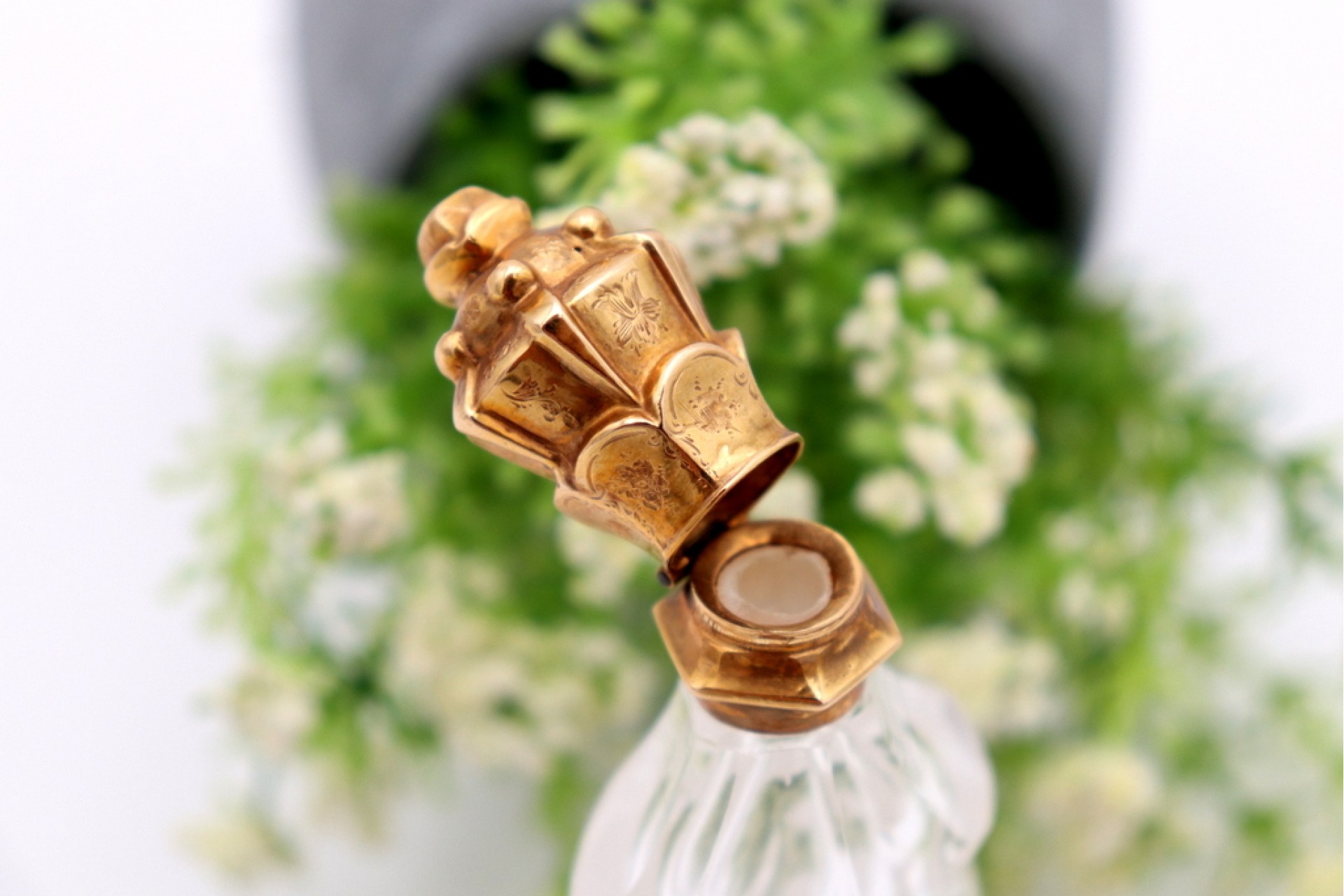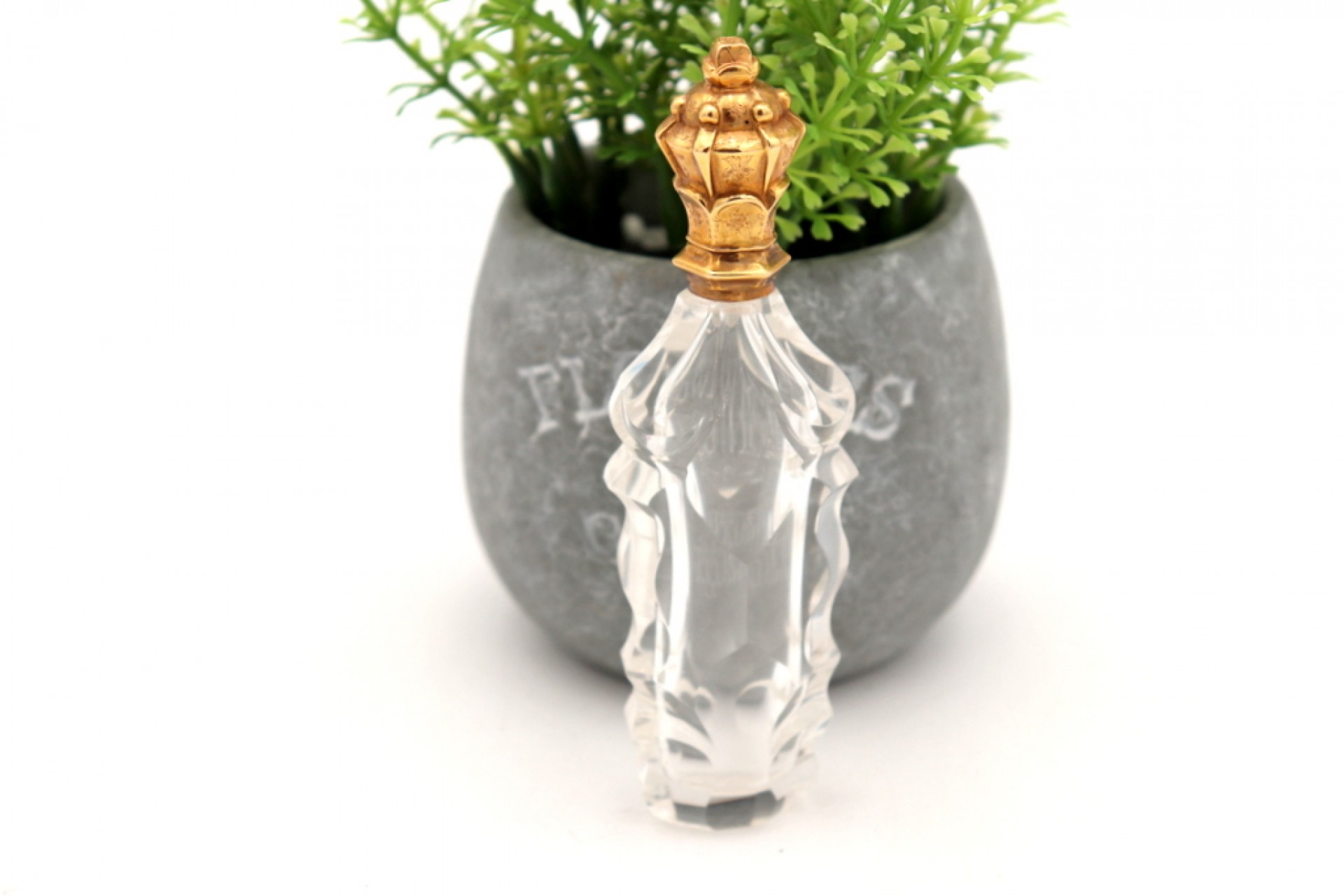 • Descrição: Frasco em vidro lapidado com tampa em ouro relevado e aplicações na tampa basculante.