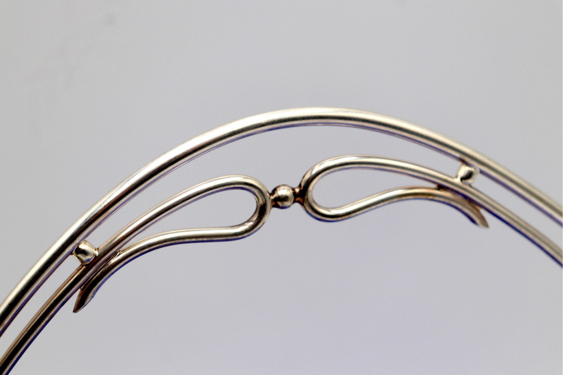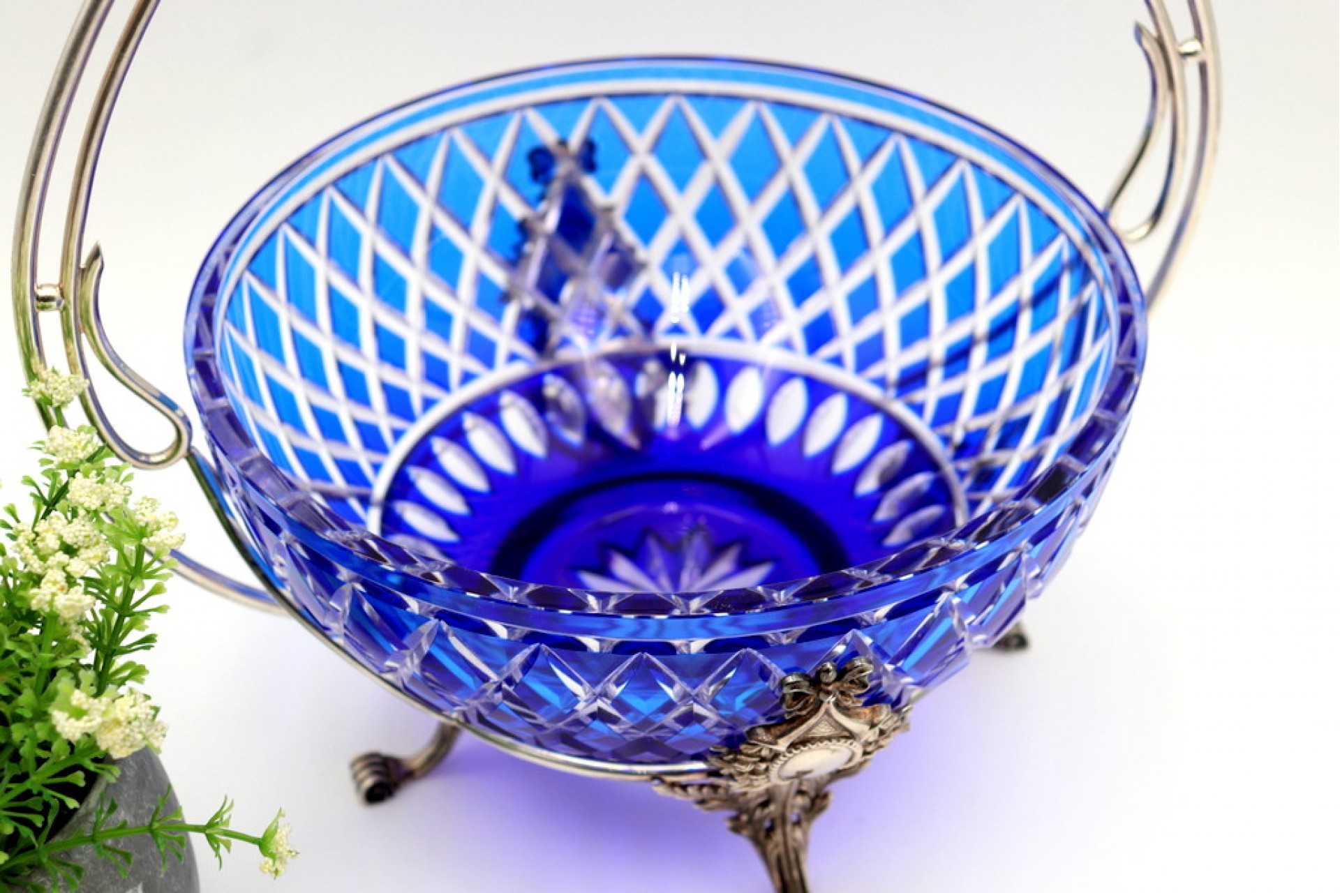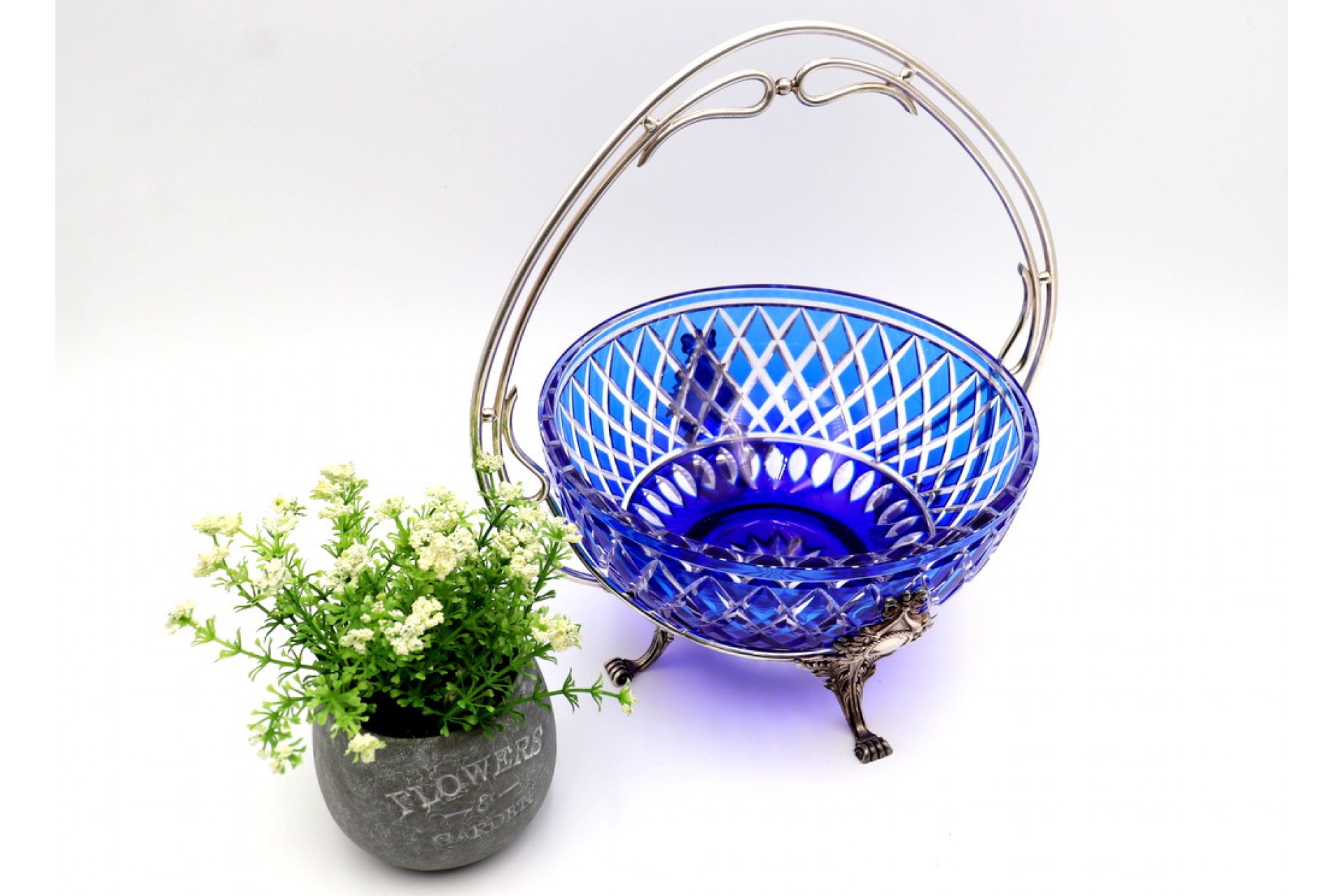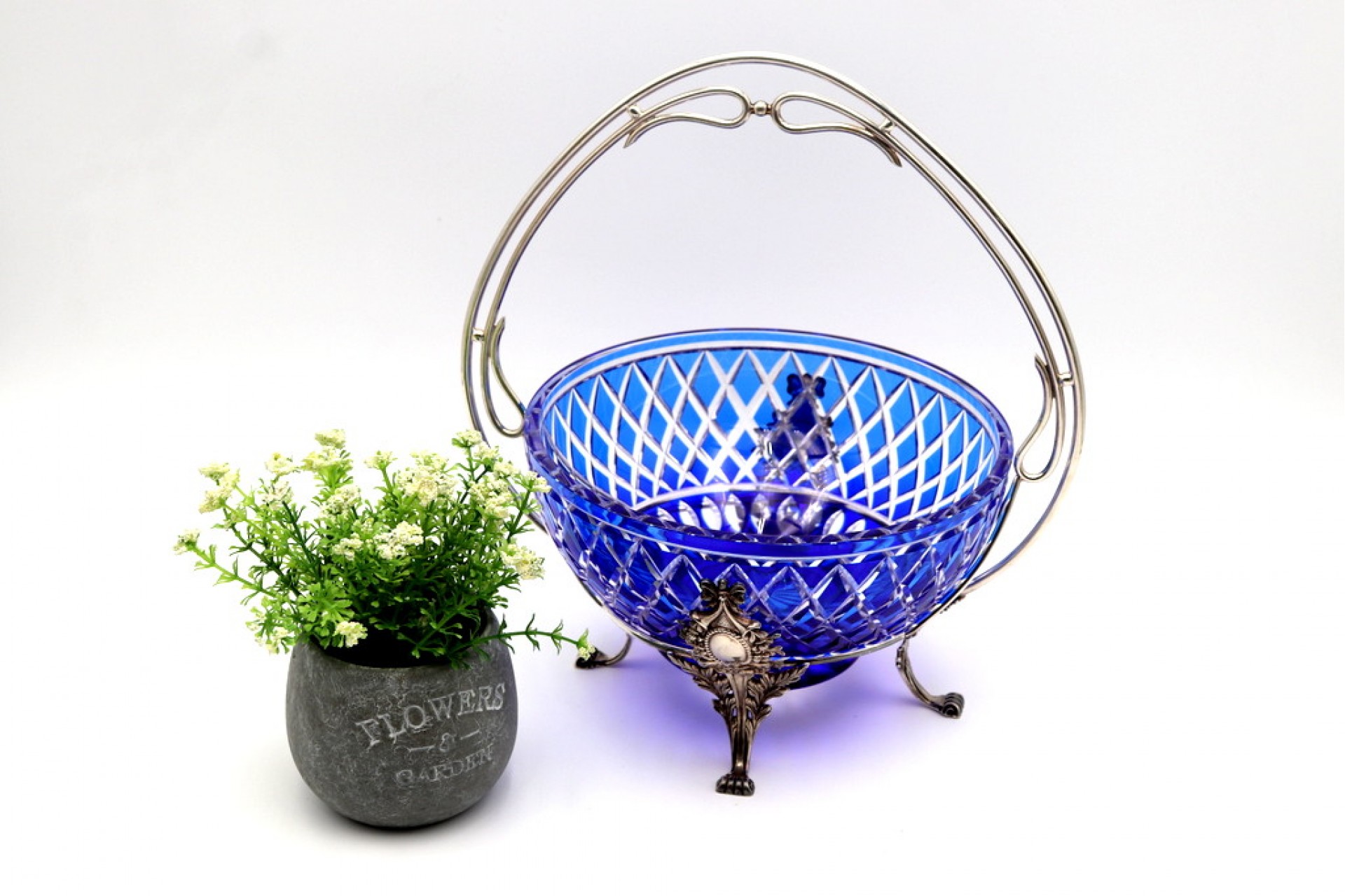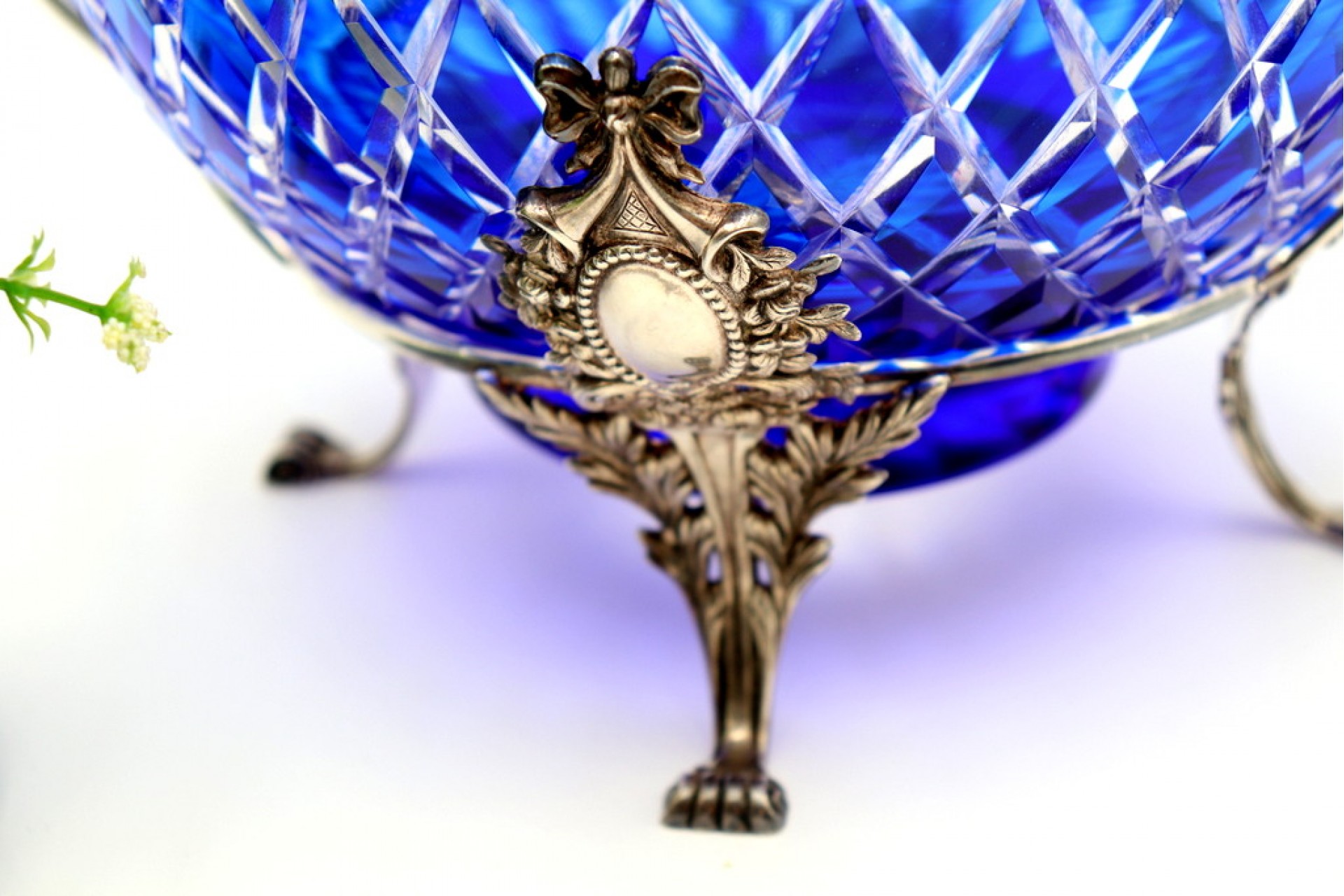 Fruteira com estrutura em prata, cartela para monograma pega dupla e vidro azul