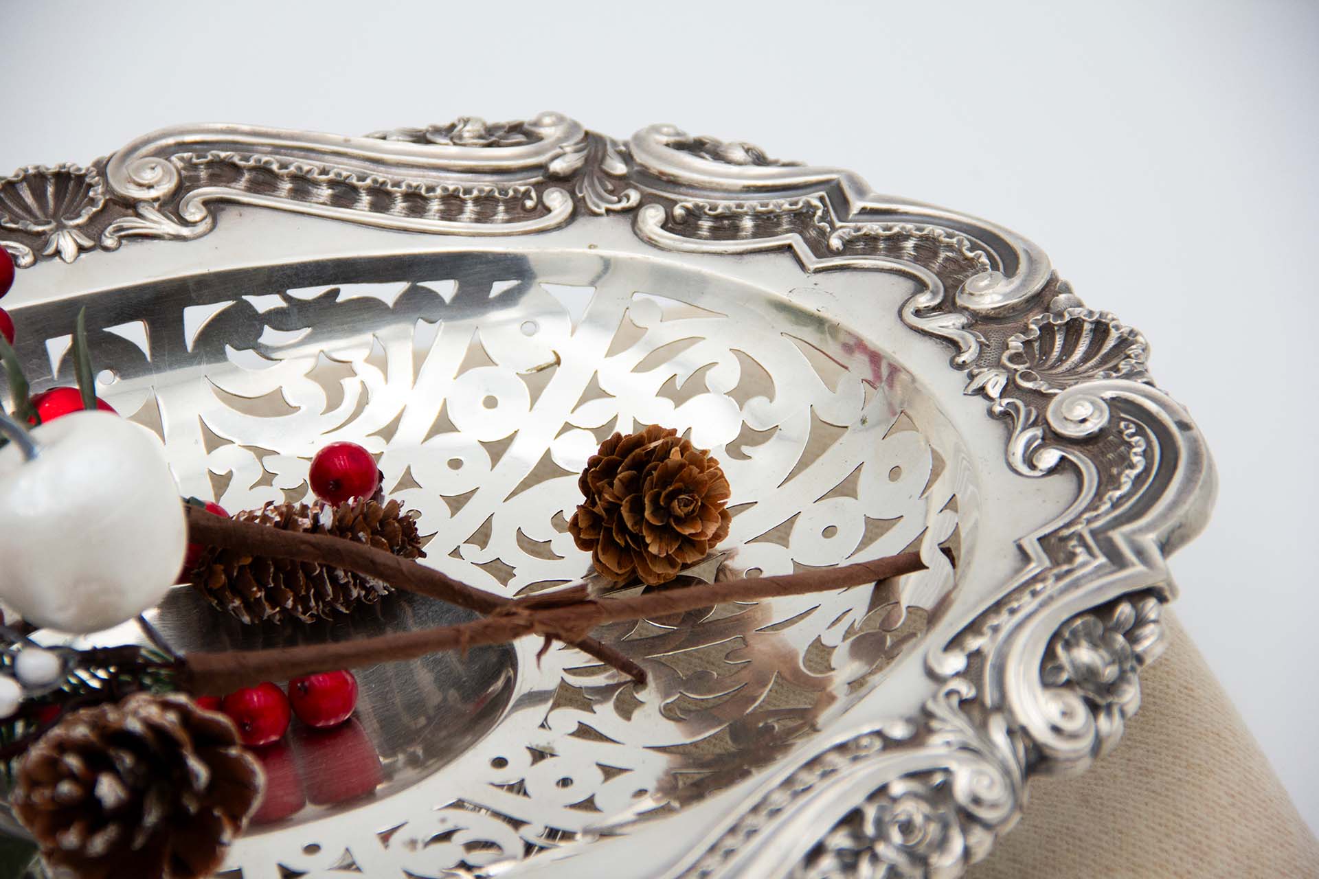 • Descrição: Fruteira de prata em formato elíptico de um pé com relevos de flores recortadas.