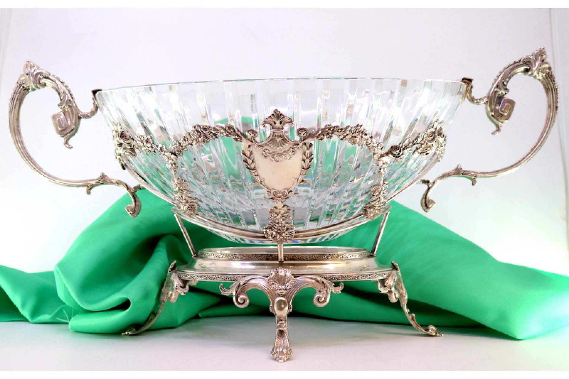 • Descrição: Fruteira centro de mesa em prata com alma em vidro lapidado, cartelas para monograma, motivos florais relevados, laços e grinaldas com assente em base oval em quatro pés concheados.